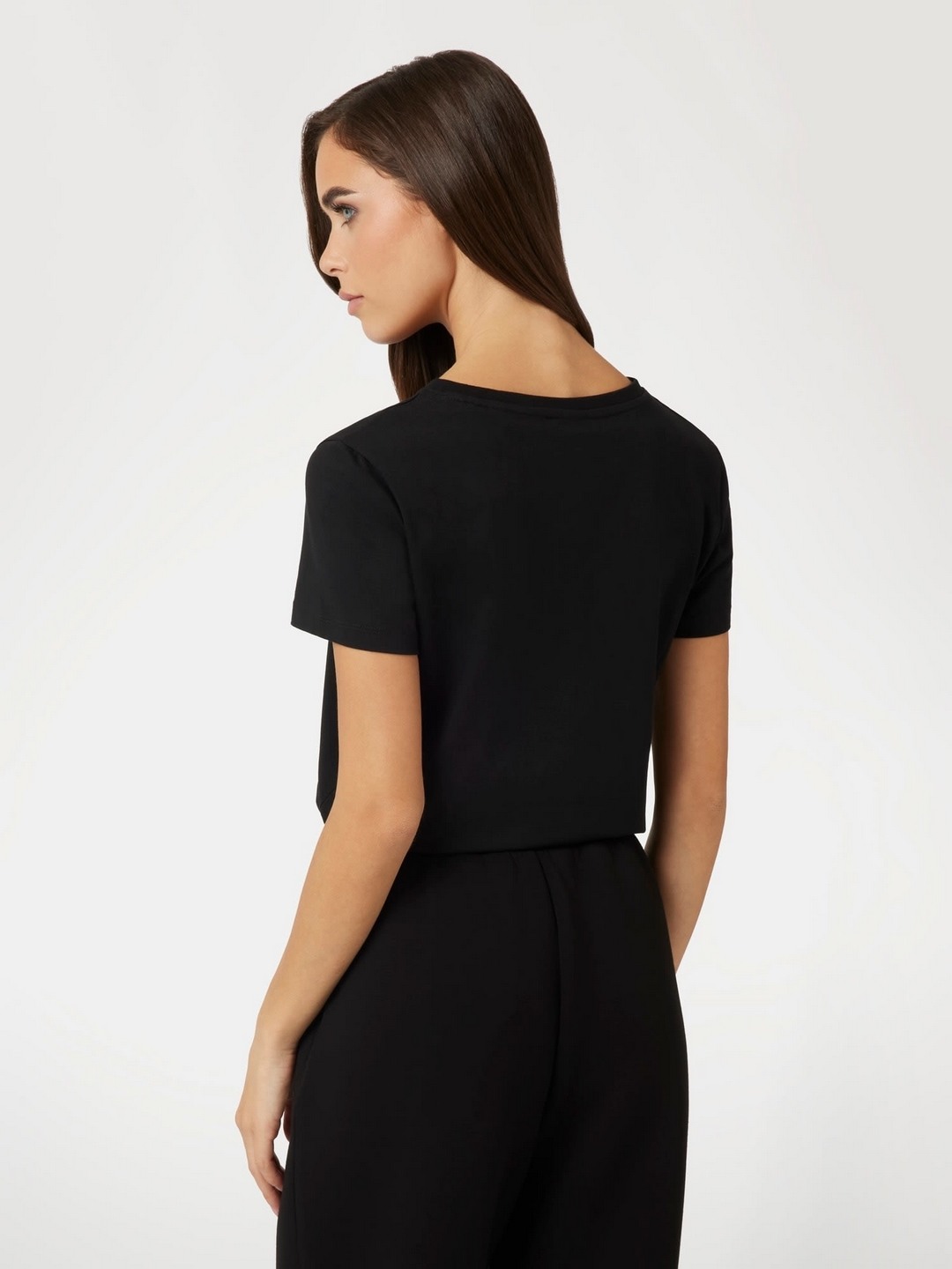 Elevate your casual wardrobe with our chic black T-shirt, designed for the modern woman who values both style and comfort. This regular-fit tee features a subtle yet striking brand logo pattern, adding a touch of sophistication to your everyday look. Crafted from a premium cotton blend fabric, it ensures breathability and softness, perfect for all-day wear. The short sleeves and classic round neck offer timeless appeal, while the convenient pull-on closure makes dressing effortless. Ideal for pairing with jeans or skirts, this versatile piece is a must-have staple.