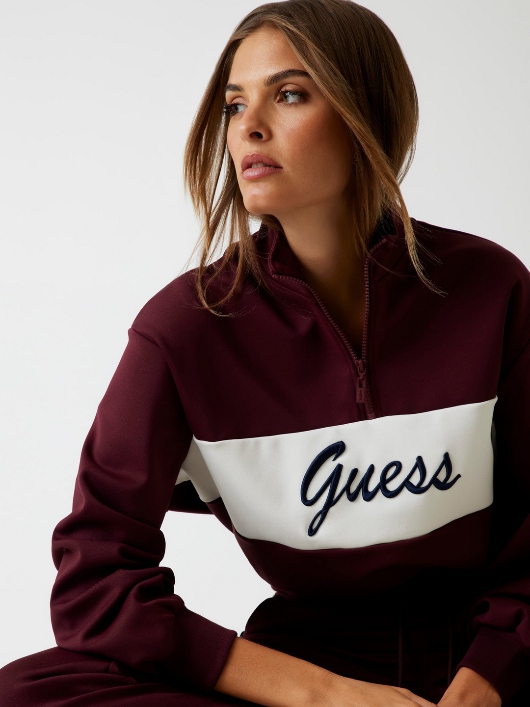 Elevate your casual wardrobe with our chic wine-colored sweatshirt, designed for the modern woman. This stylish piece features a trendy color-blocked pattern that adds a pop of sophistication to any outfit. Crafted from a premium polyester blend fabric, it ensures comfort and durability. The full sleeves and high neck provide warmth and style, while the half zip closure offers versatility and ease of wear. Perfect for layering or as a standalone piece, this sweatshirt is a must-have for any fashion-forward wardrobe.