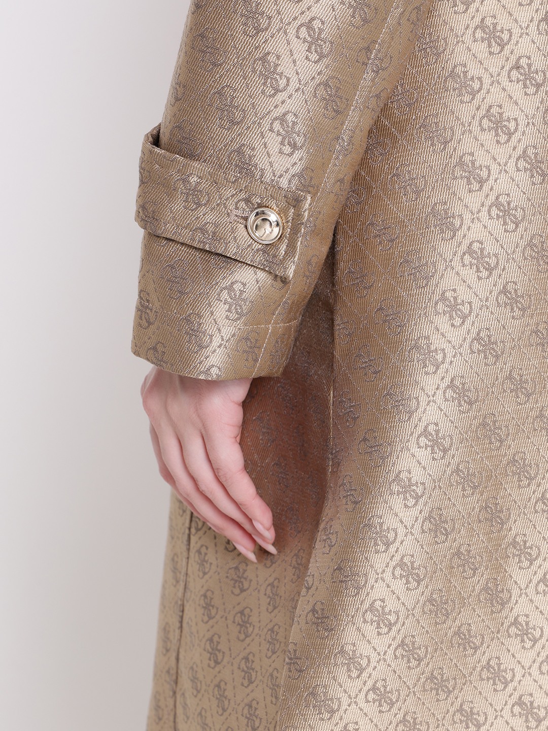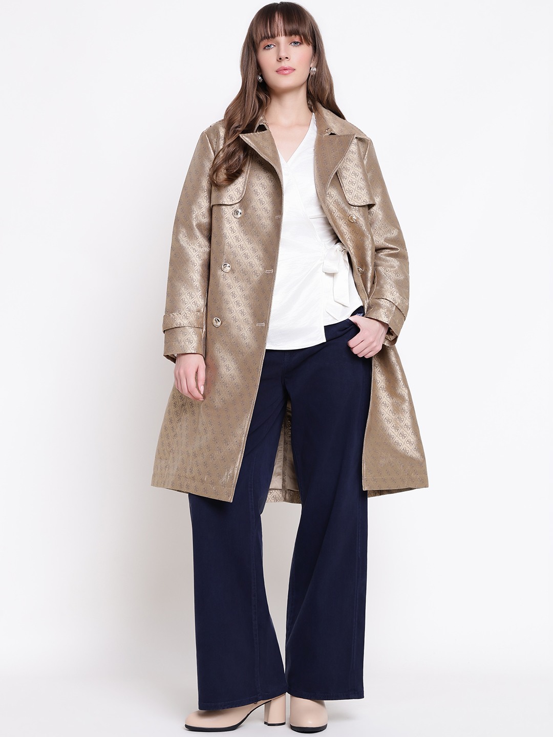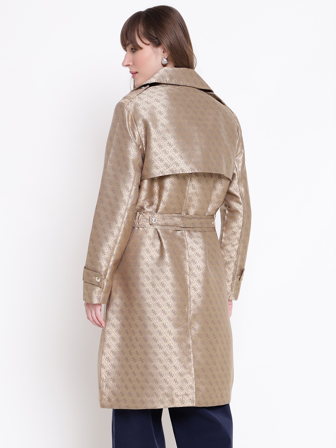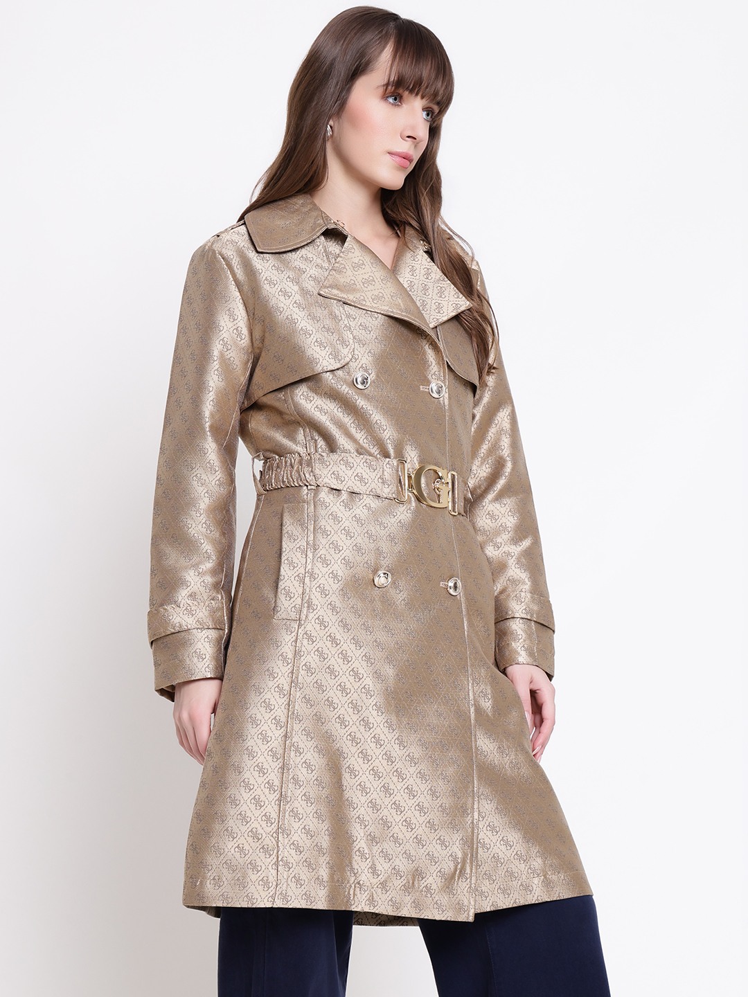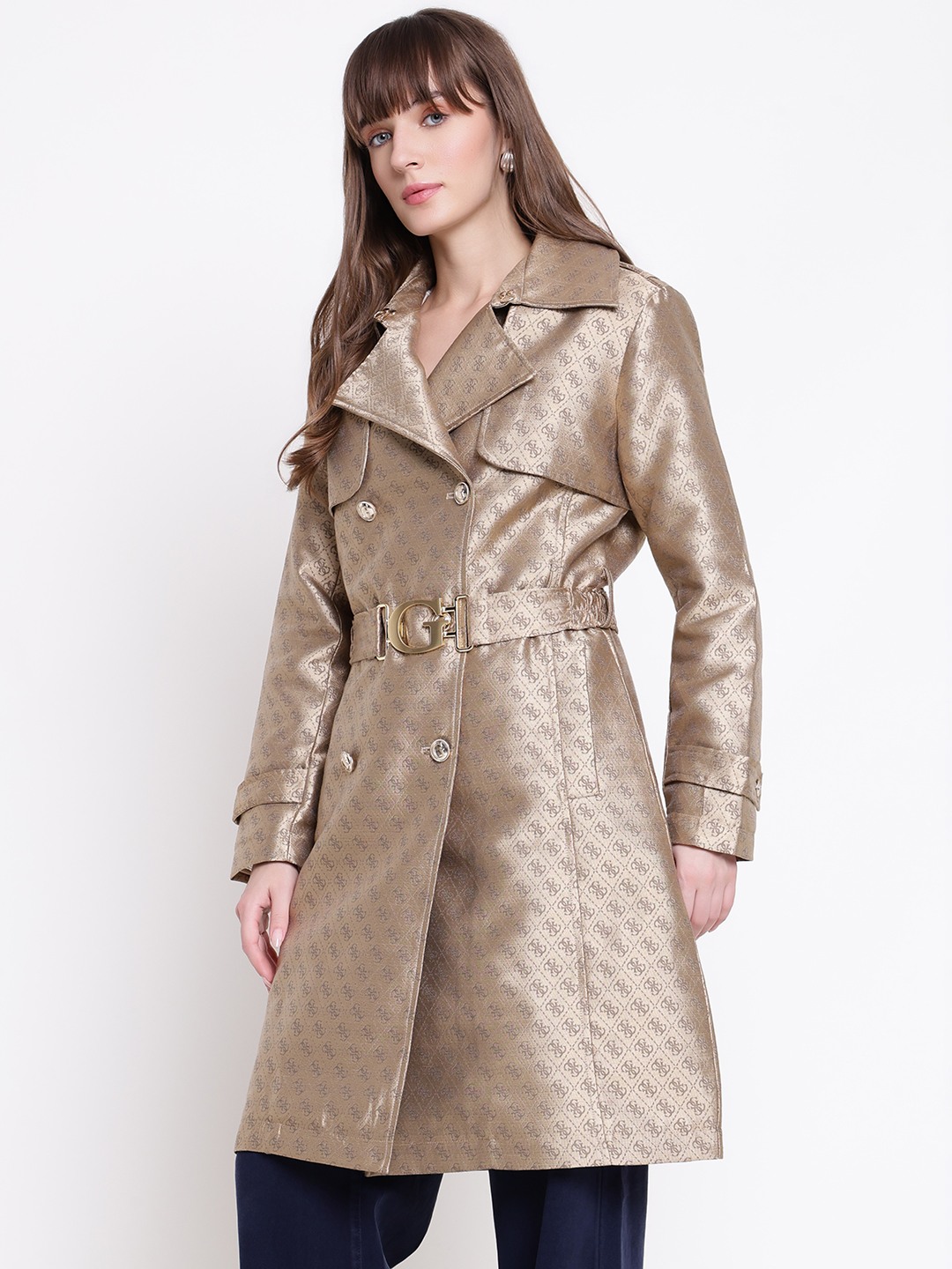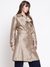 The diletta belted trench coat in brown offers a stylish and versatile addition to any wardrobe. Crafted from durable polyester fabric, it features a jacquard pattern that adds a touch of elegance. Designed with a regular fit, full sleeves, and a classic lapel collar, it provides comfort and sophistication. The coat is secured with a convenient button closure and includes a matching belt to enhance your silhouette. Perfect for both casual and formal occasions, this trench coat combines functionality with timeless style.