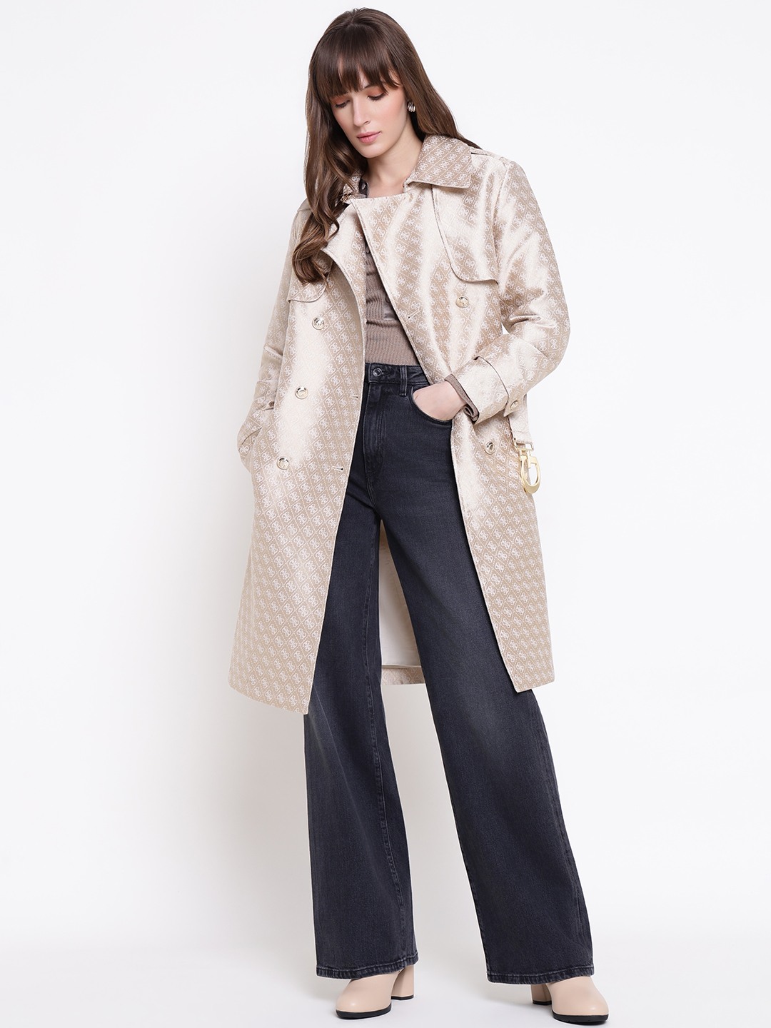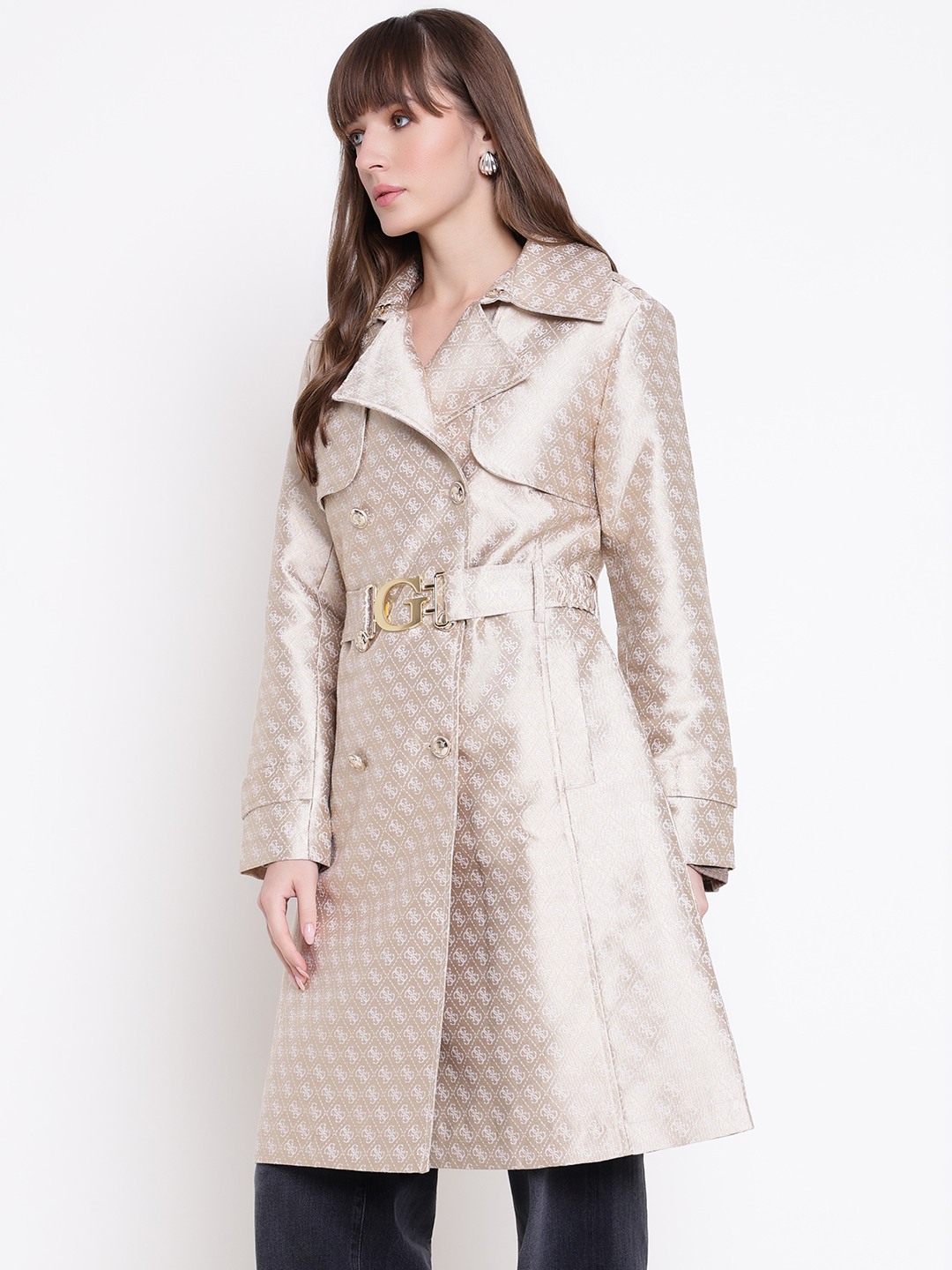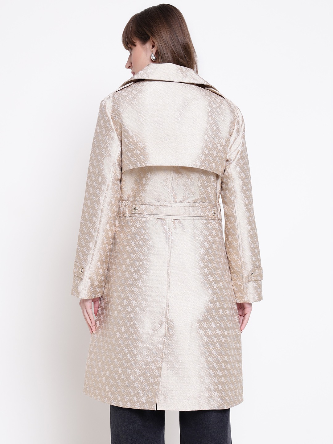 The diletta belted trench coat is a stylish addition to any woman's wardrobe. Crafted from durable polyester fabric, it features a classic jacquard pattern in beige that adds elegance. The regular fit ensures comfort, while the full sleeves and lapel collar provide a sophisticated look. A convenient button closure and a matching belt allow for a customizable fit. Perfect for both casual and formal occasions, this trench coat combines timeless design with practical functionality, making it a versatile and chic choice for any season.
