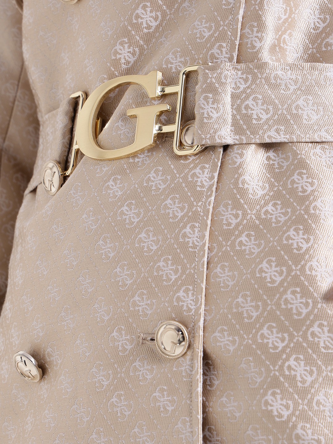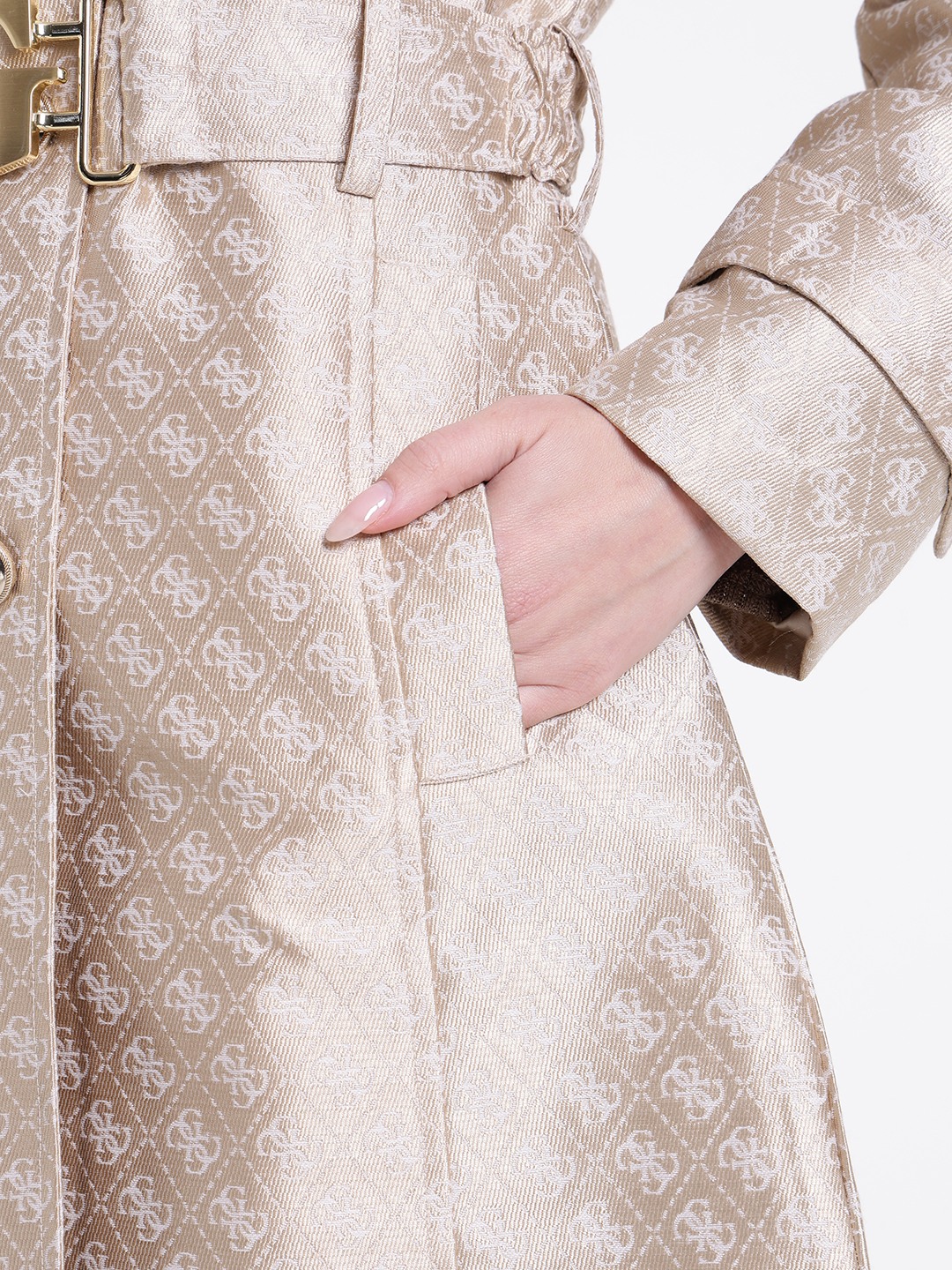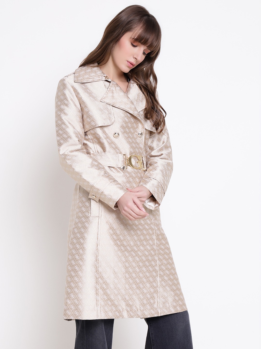 The diletta belted trench coat is a stylish addition to any woman's wardrobe. Crafted from durable polyester fabric, it features a classic jacquard pattern in beige that adds elegance. The regular fit ensures comfort, while the full sleeves and lapel collar provide a sophisticated look. A convenient button closure and a matching belt allow for a customizable fit. Perfect for both casual and formal occasions, this trench coat combines timeless design with practical functionality, making it a versatile and chic choice for any season.