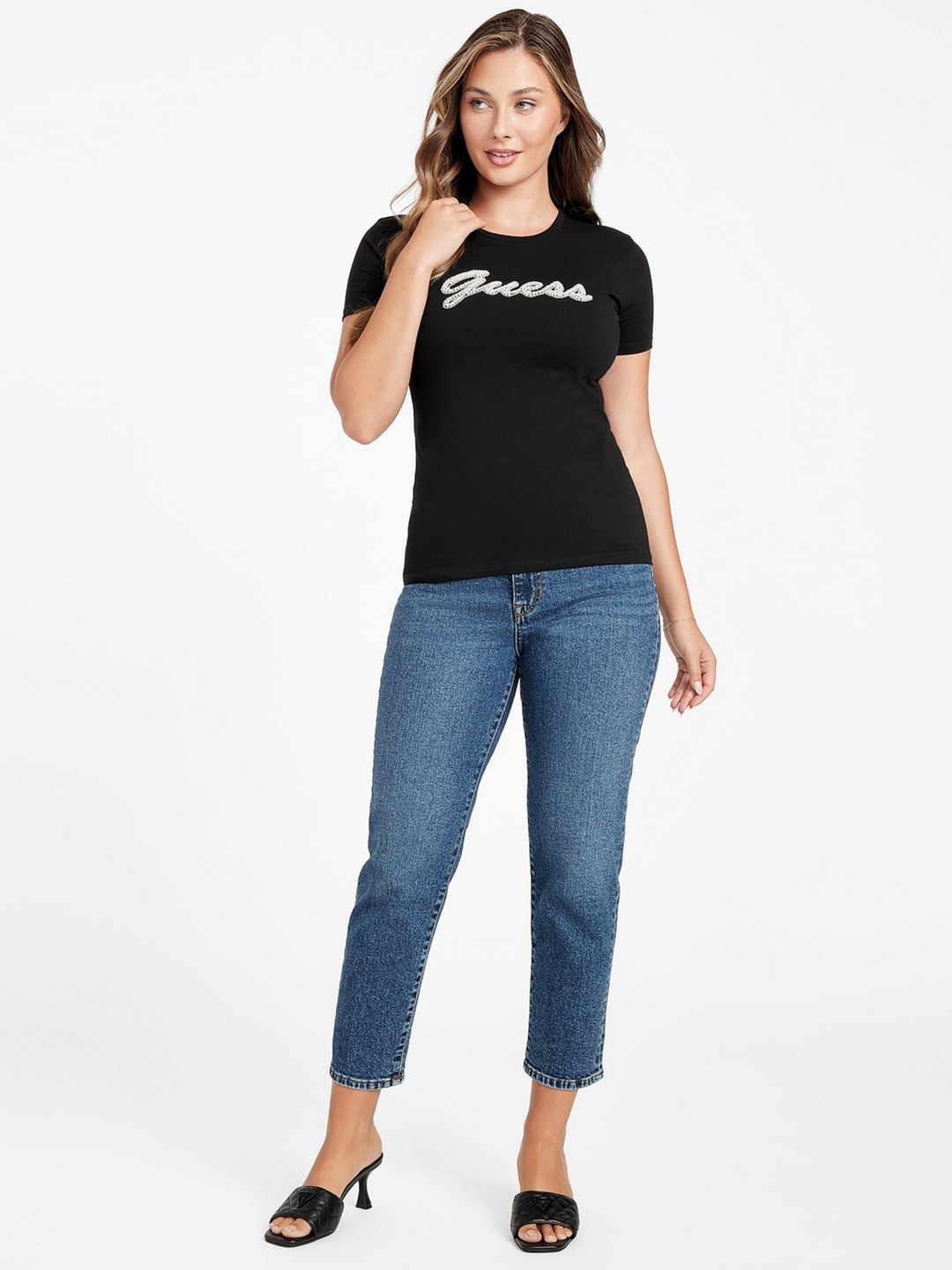 Elevate your wardrobe with our chic black T-shirt, designed for the modern woman who values style and comfort. This elegant piece features an eye-catching embellished pattern that adds a touch of glamour to any outfit. Crafted from a premium cotton blend fabric, it offers a soft, breathable feel perfect for all-day wear. The classic round neck and short sleeves provide a timeless silhouette, while the convenient slip-on closure ensures effortless dressing. Ideal for both casual outings and special occasions, this versatile T-shirt is a must-have addition to your collection.