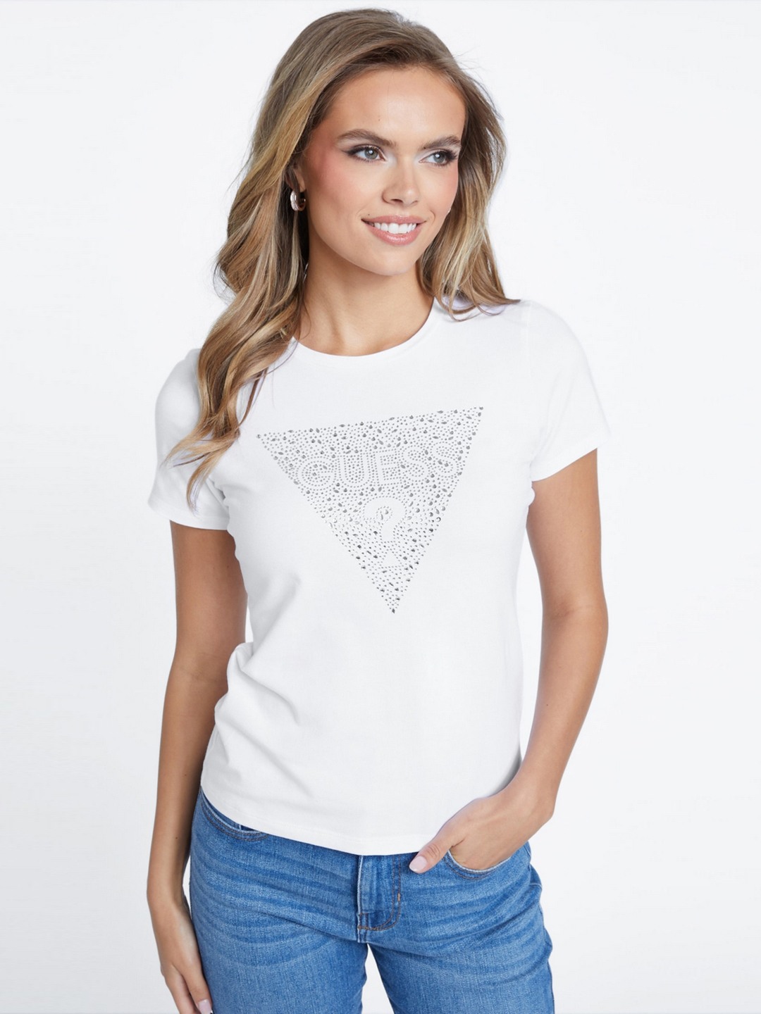 Elevate your wardrobe with our chic white T-shirt, designed for the modern woman who values style and comfort. This elegant piece features an eye-catching embellished pattern that adds a touch of glamour to any outfit. Crafted from a premium cotton blend fabric, it ensures a soft, breathable feel for all-day wear. The classic round neck and short sleeves offer a timeless silhouette, while the slip-on closure provides effortless dressing. Perfect for casual outings or dressed-up occasions, this versatile T-shirt is a must-have staple.