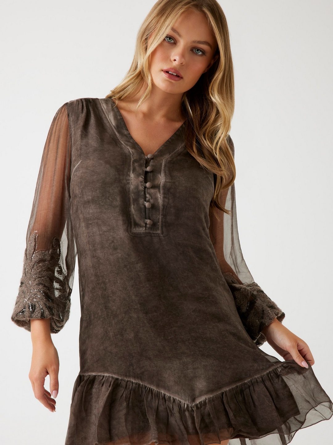 Elevate your wardrobe with our exquisite brown shift dress, designed for the modern woman who appreciates timeless elegance. This fit & flare dress features an intricate embroidered pattern that adds a touch of sophistication to any occasion. Crafted from a luxurious viscose blend fabric, it offers a soft, comfortable fit. The long sleeves and flattering V-neckline enhance its classic appeal, while the button and loop closure ensures a secure fit. Perfect for day-to-night transitions, this dress is a must-have addition to your collection.