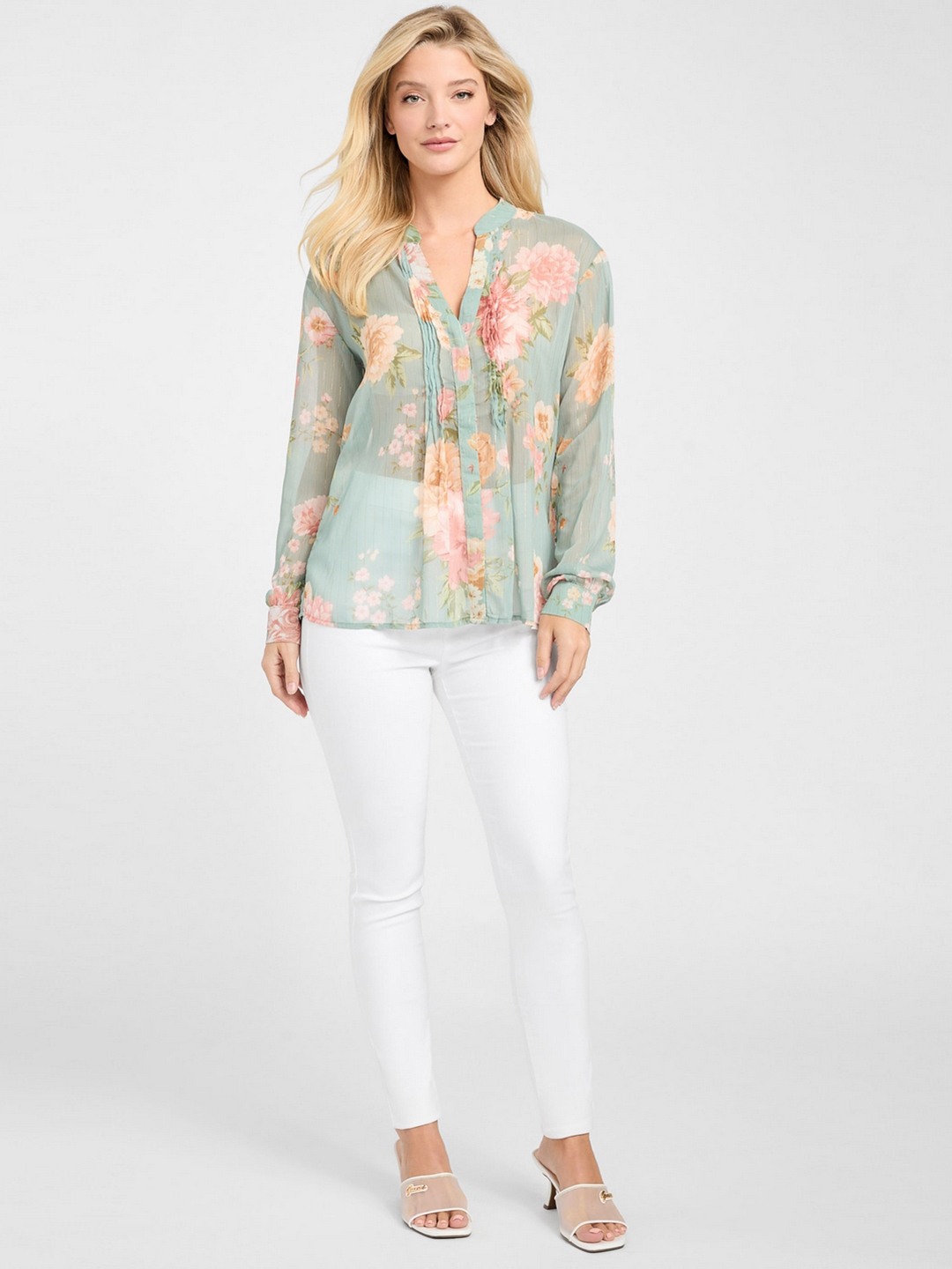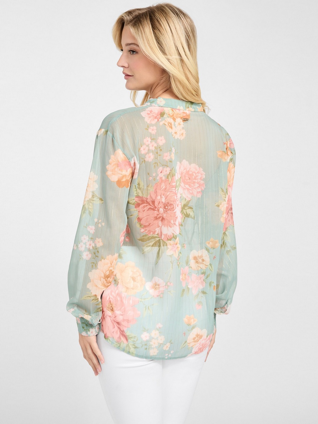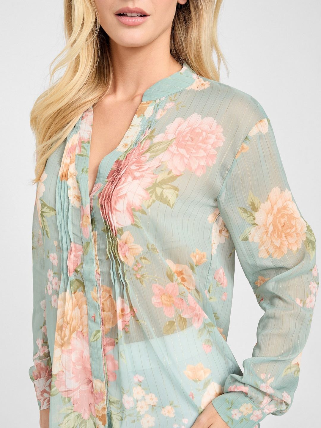 Elevate your wardrobe with this chic green floral shirt-style top, designed for the modern woman. Crafted from high-quality polyester, it offers a soft, lightweight feel perfect for any season. The elegant floral pattern adds a touch of femininity, while the long sleeves provide versatile styling options. Featuring a sophisticated mandarin collar and convenient button closure, this top effortlessly combines style and comfort. Ideal for both casual outings and formal occasions, it's a must-have addition to your collection.