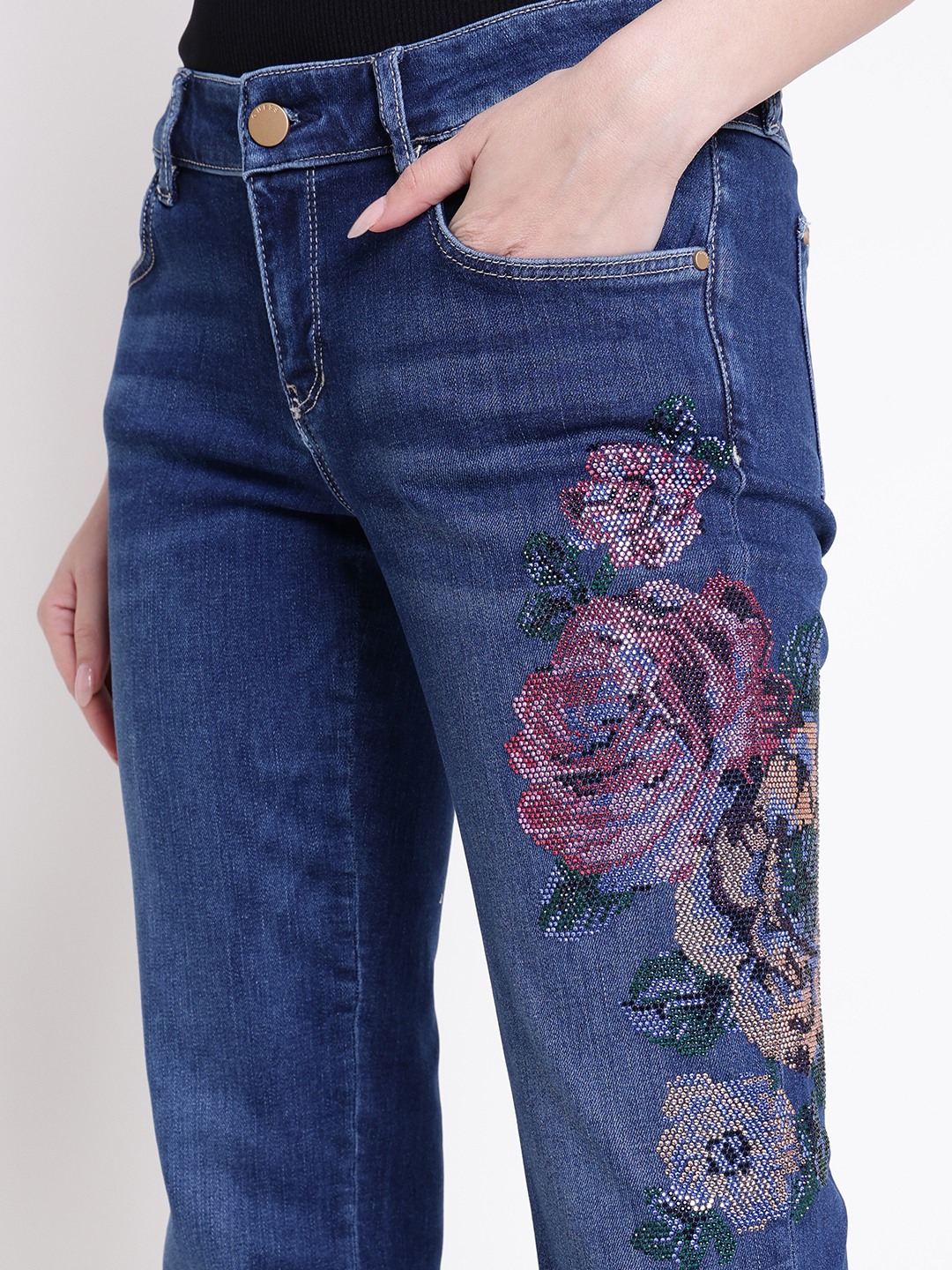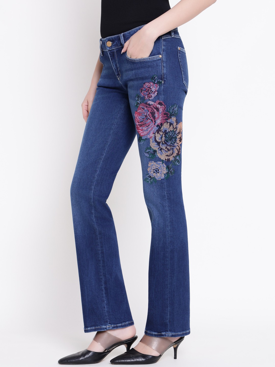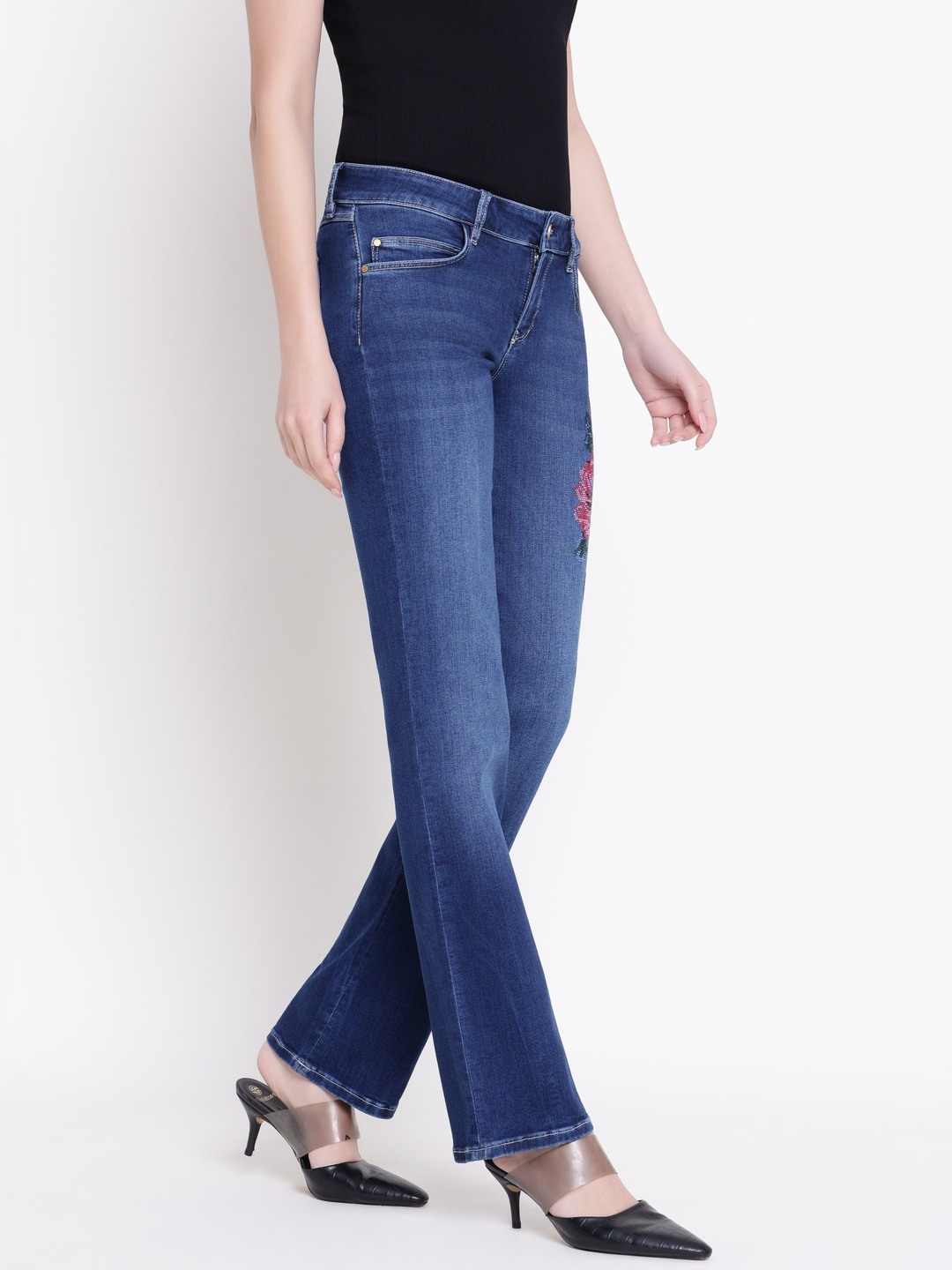 Hermosa denim jeans in a vibrant blue color offer a stylish flare fit that enhances your silhouette. Crafted from comfortable cotton fabric, these high-rise jeans provide a flattering and secure fit. The embellished pattern adds a touch of elegance and uniqueness to your look. Featuring a classic button closure, they are easy to wear and versatile for various occasions. Perfect for women who want a blend of comfort and fashion, these jeans are a must-have addition to your wardrobe.