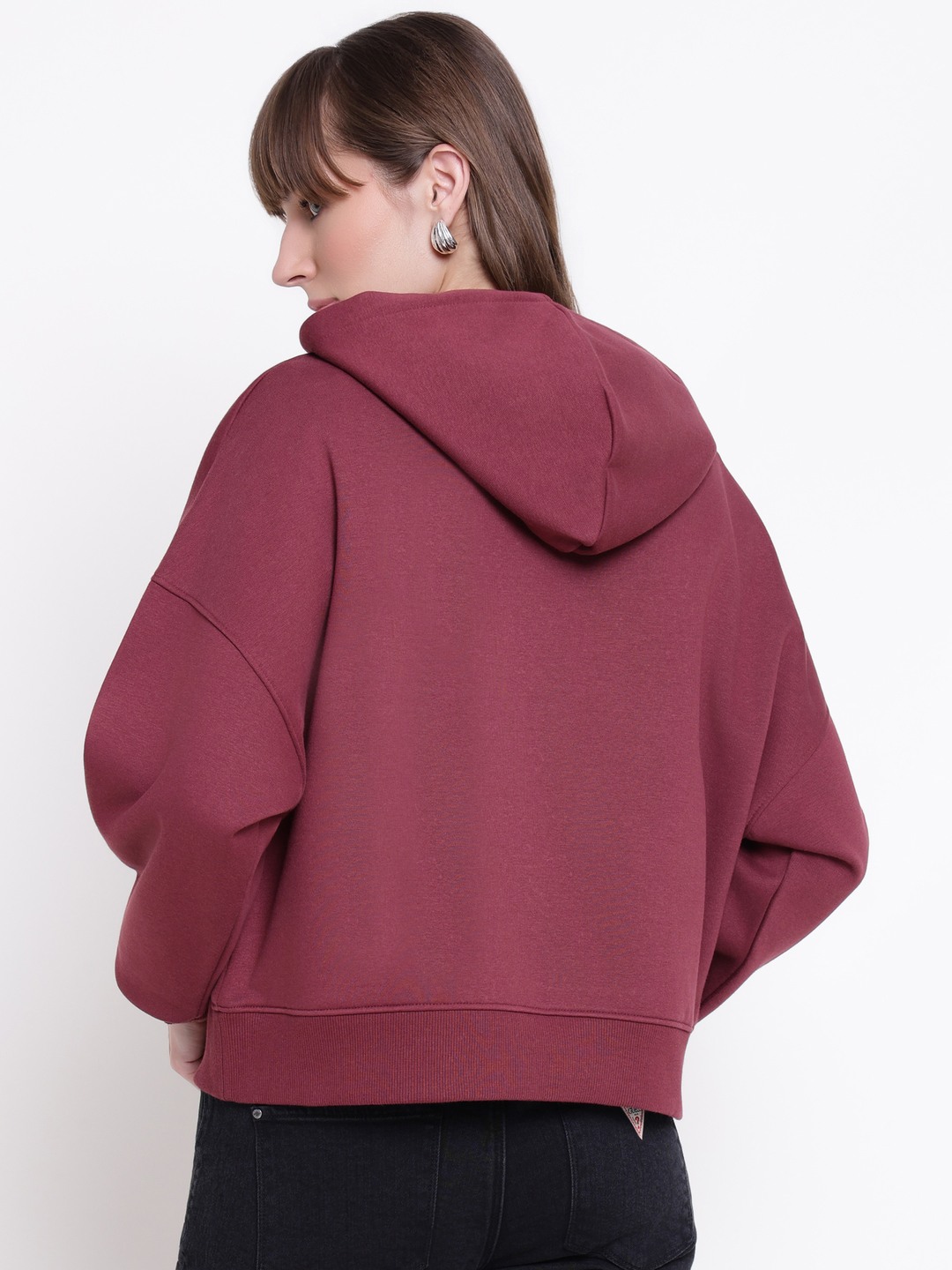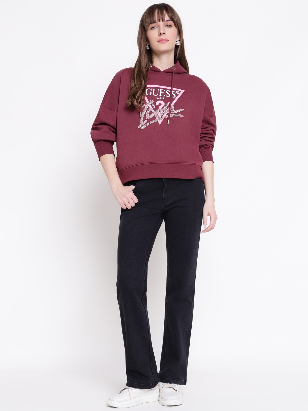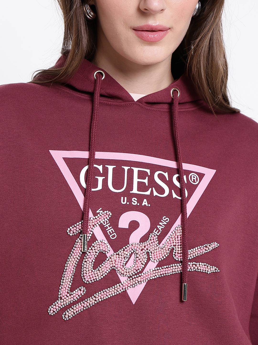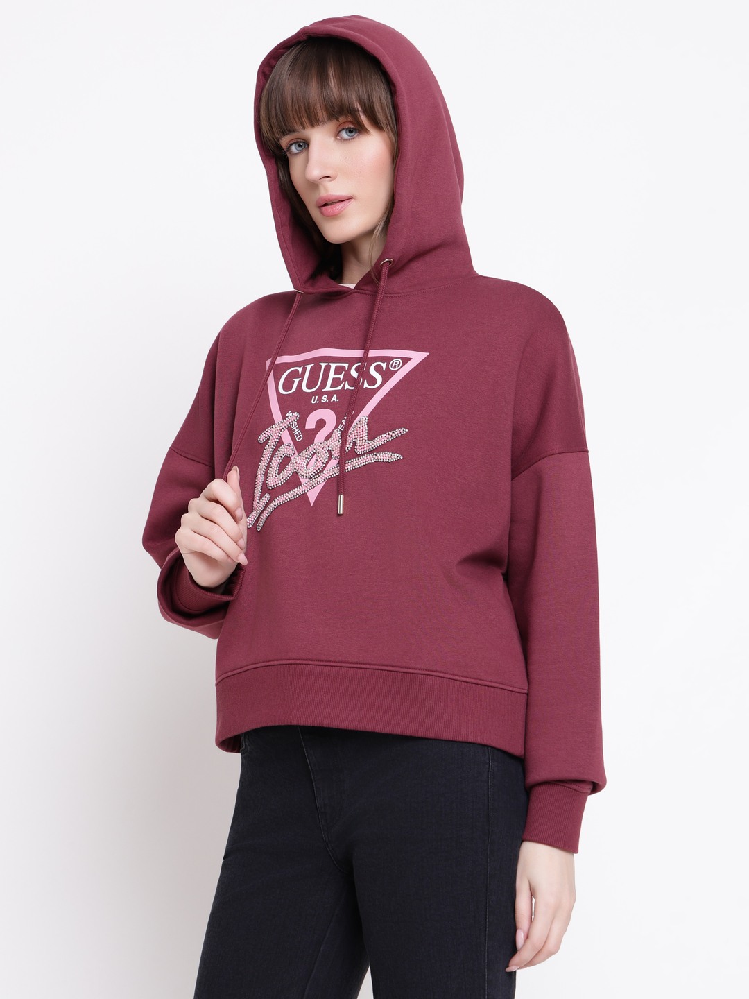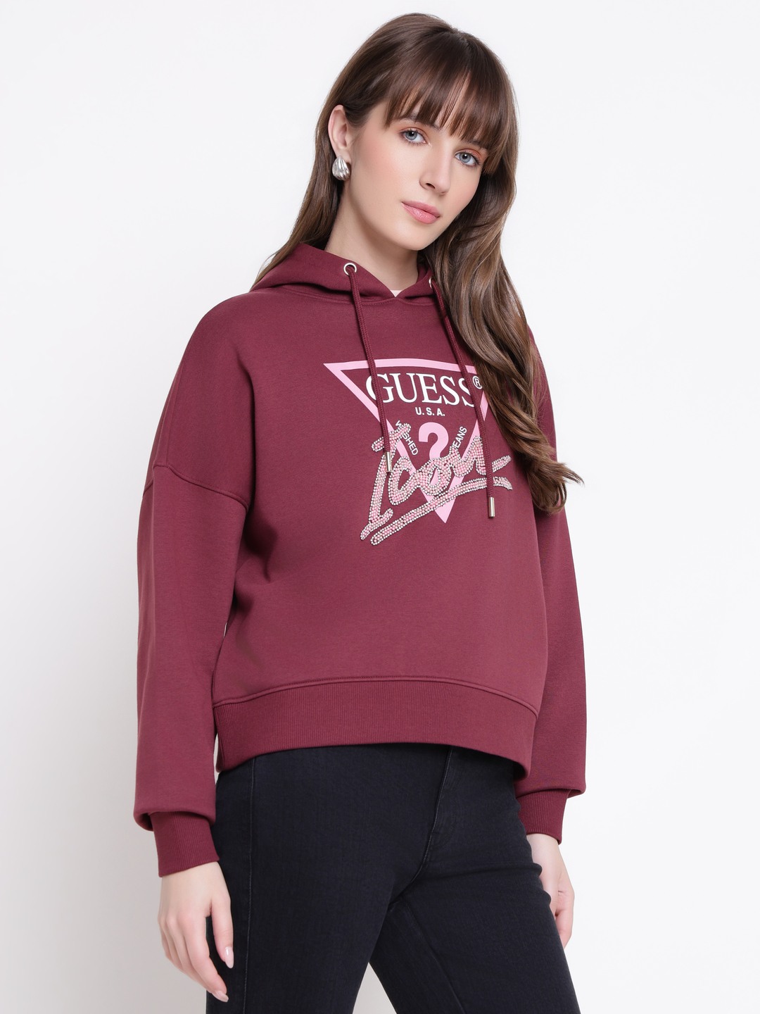 Discover the stylish icon sweatshirt designed for women in a rich maroon color. Featuring a regular fit, it offers comfort and a flattering silhouette. The full sleeves and hooded neck add a trendy touch, perfect for casual outings. Crafted from soft cotton fabric, it ensures all-day comfort. The embellished pattern adds a unique flair, making it stand out. Easy to wear with a pull-on closure, this sweatshirt combines fashion and functionality effortlessly. Elevate your casual wardrobe with this versatile and chic piece.