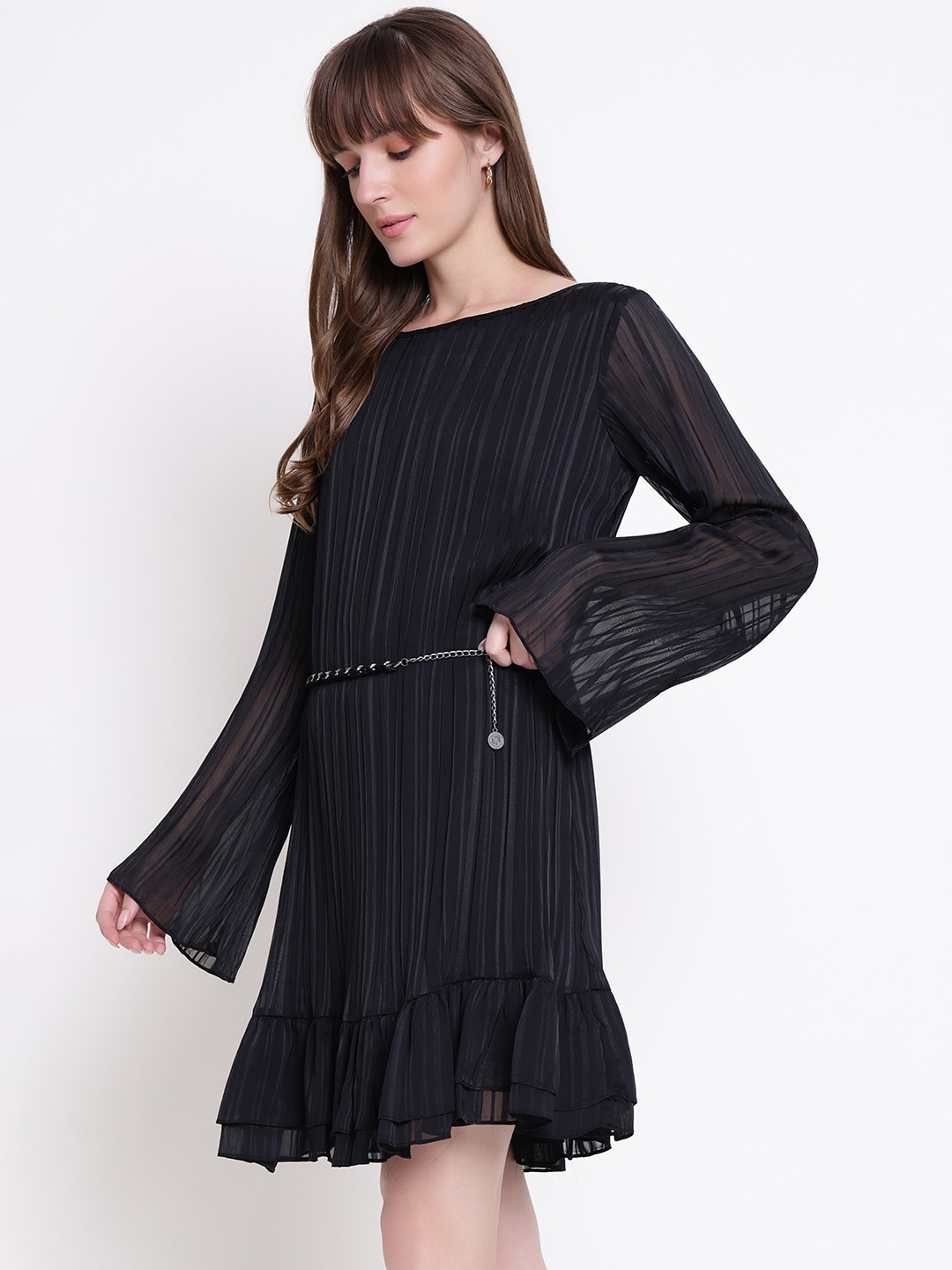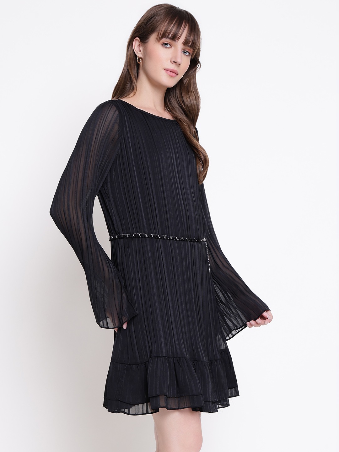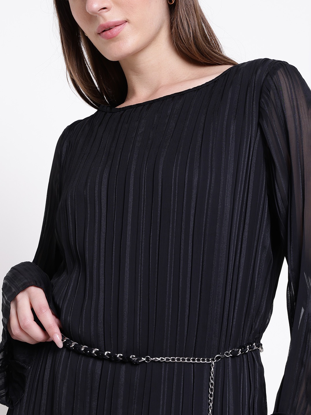 The ilenia pleat tiered dress in black offers a timeless and elegant look for women. Designed with a regular fit, it features a solid pattern with full sleeves and a boat neck for a sophisticated touch. Crafted from comfortable polyester fabric, this dress ensures ease of movement and durability. The button closure adds a stylish detail while making it easy to wear. Perfect for both casual and semi-formal occasions, this dress combines comfort and style effortlessly.
