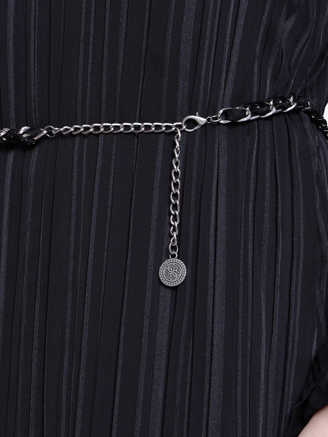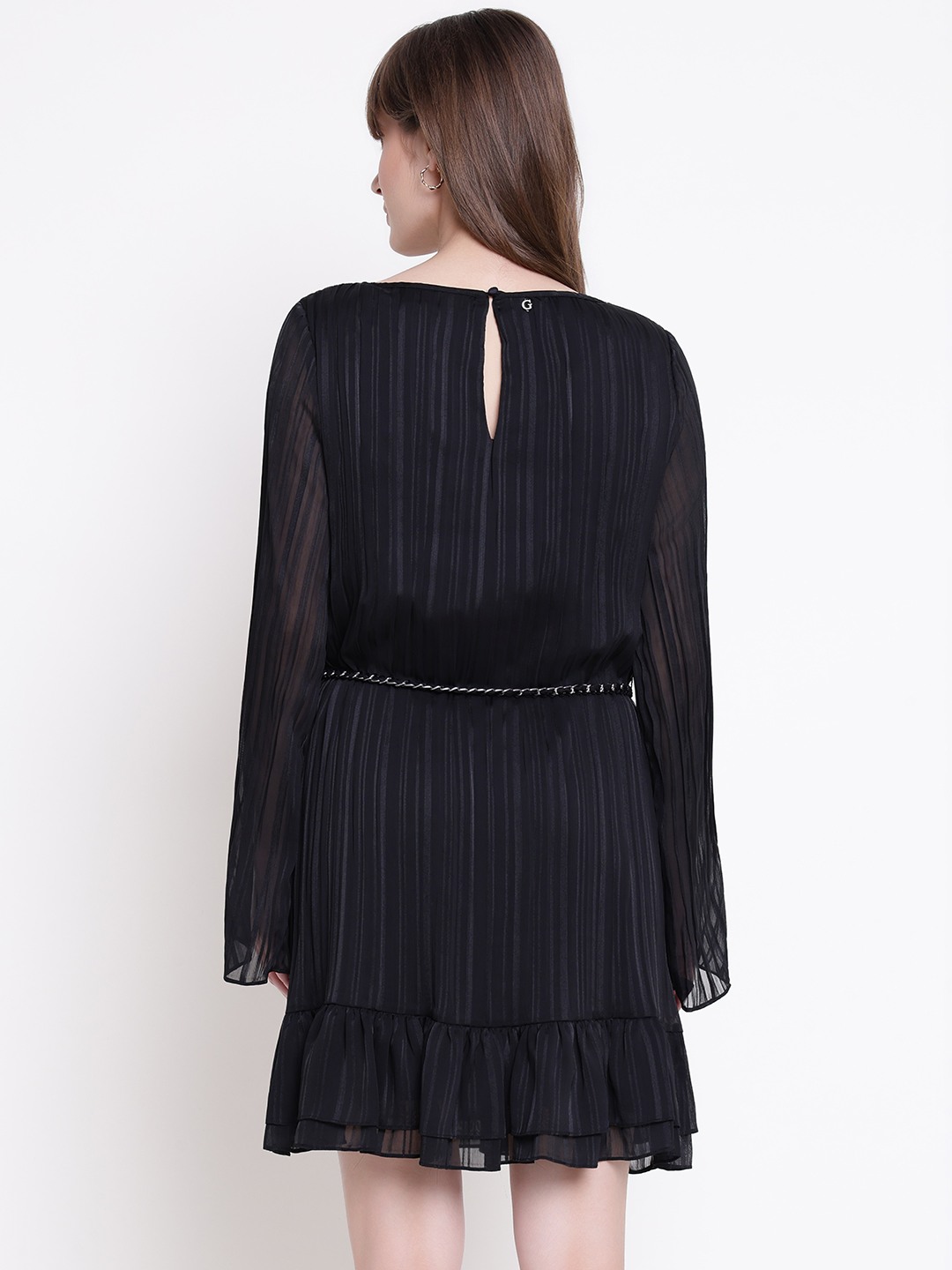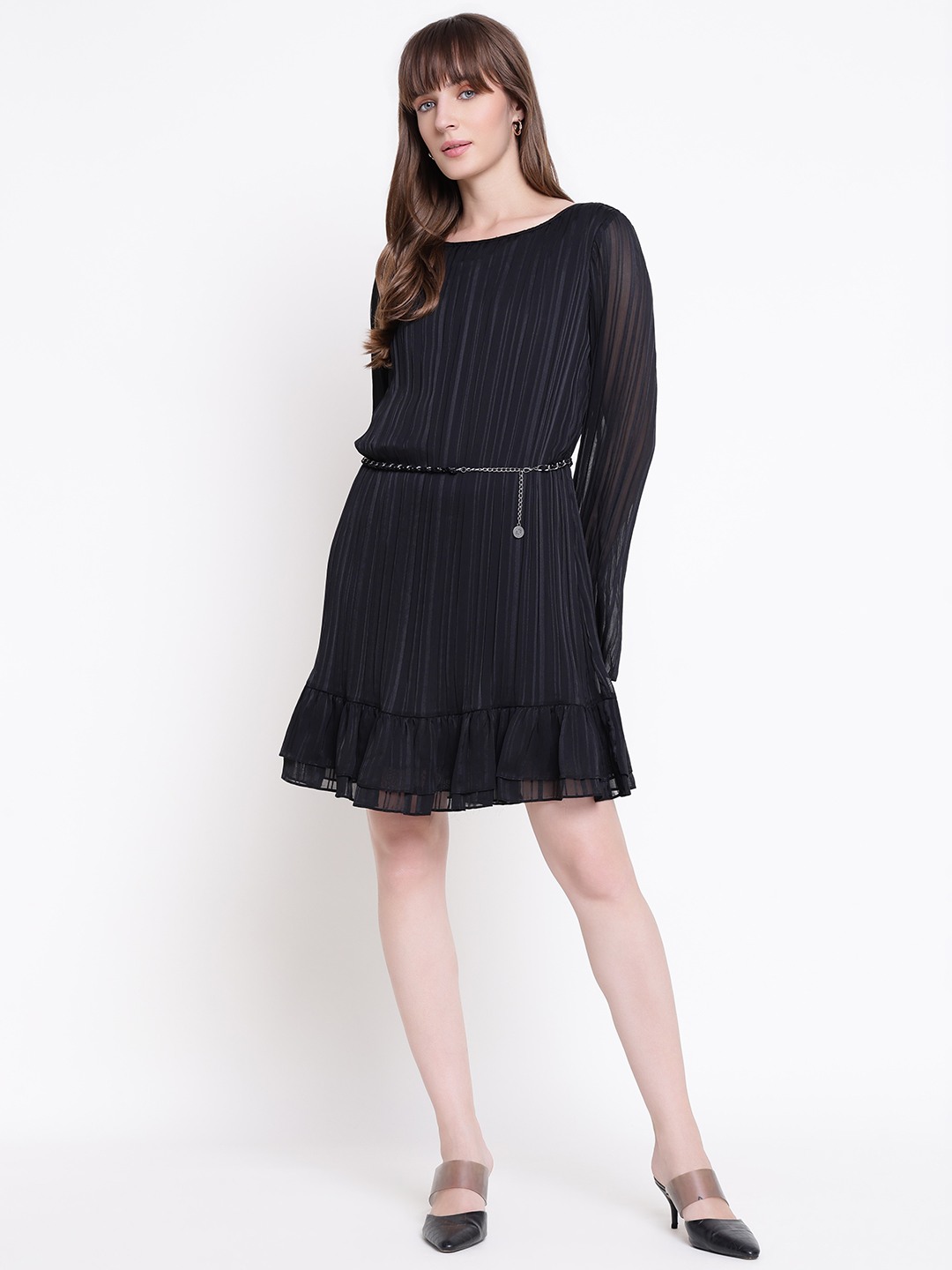 The ilenia pleat tiered dress in black offers a timeless and elegant look for women. Designed with a regular fit, it features a solid pattern with full sleeves and a boat neck for a sophisticated touch. Crafted from comfortable polyester fabric, this dress ensures ease of movement and durability. The button closure adds a stylish detail while making it easy to wear. Perfect for both casual and semi-formal occasions, this dress combines comfort and style effortlessly.