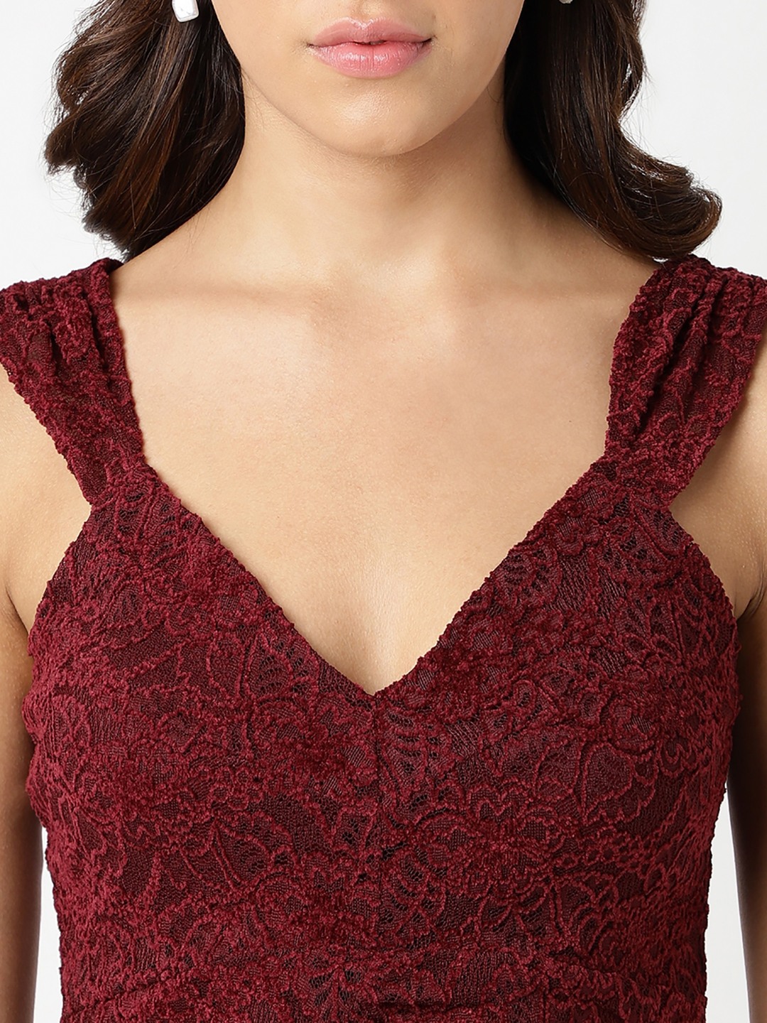 Maroon Self Design Sweetheart Neck Shoulder Straps Ruched Bodycon Dress