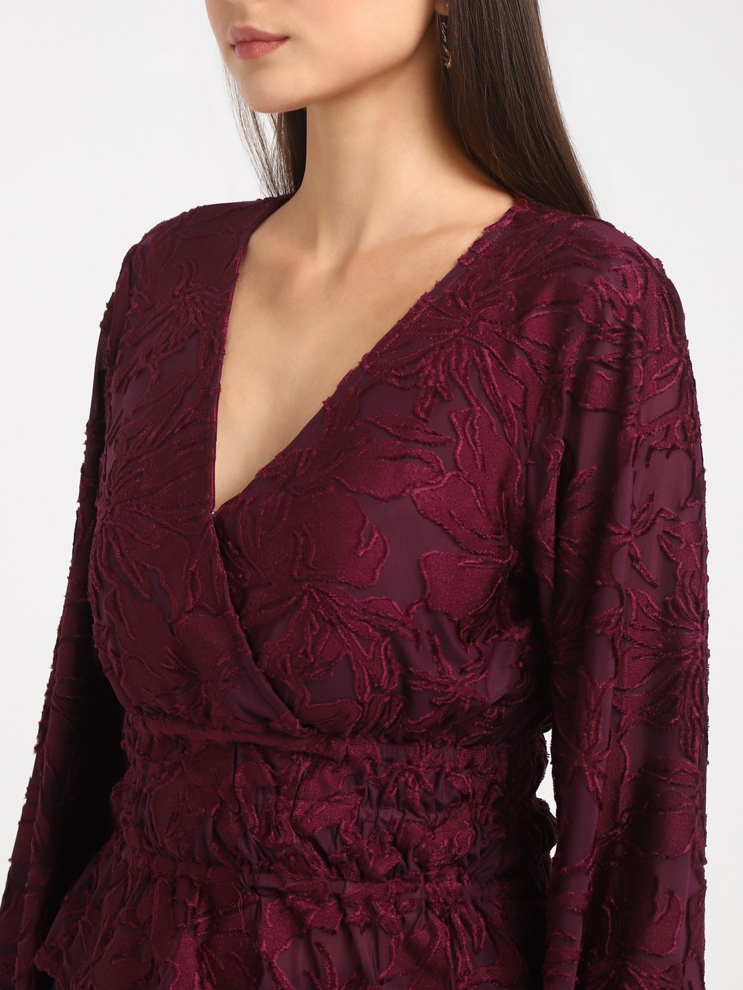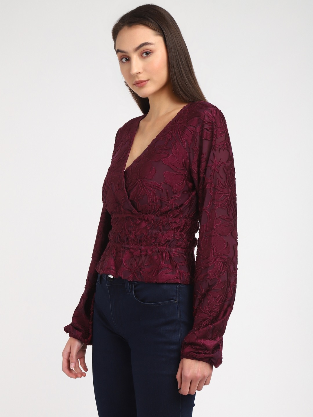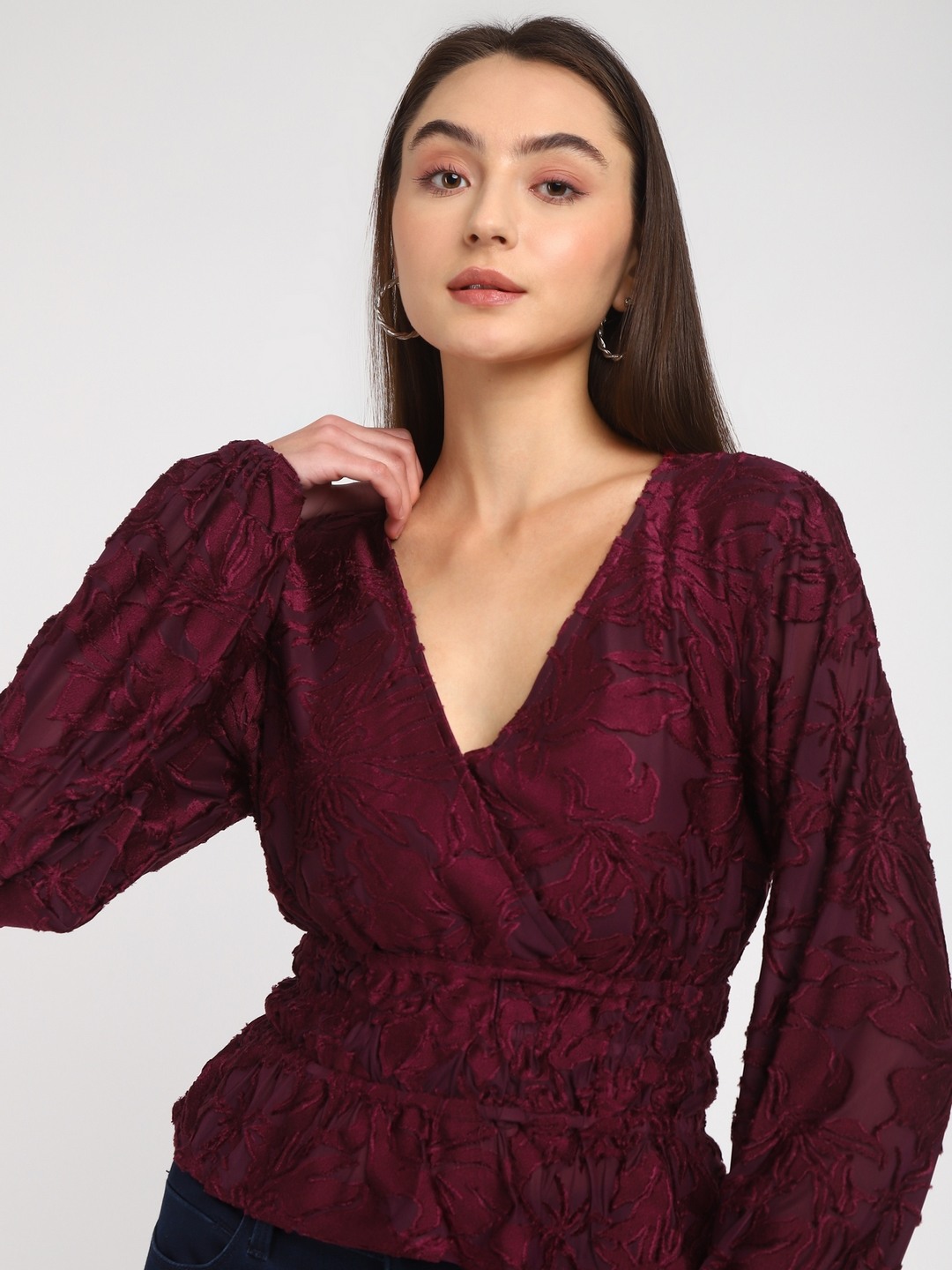 Maroon Self Design V-Neck Full Sleeves Wrap Top