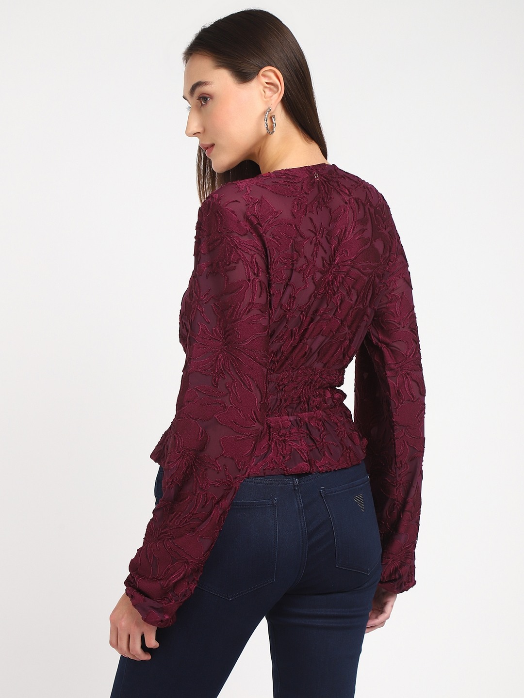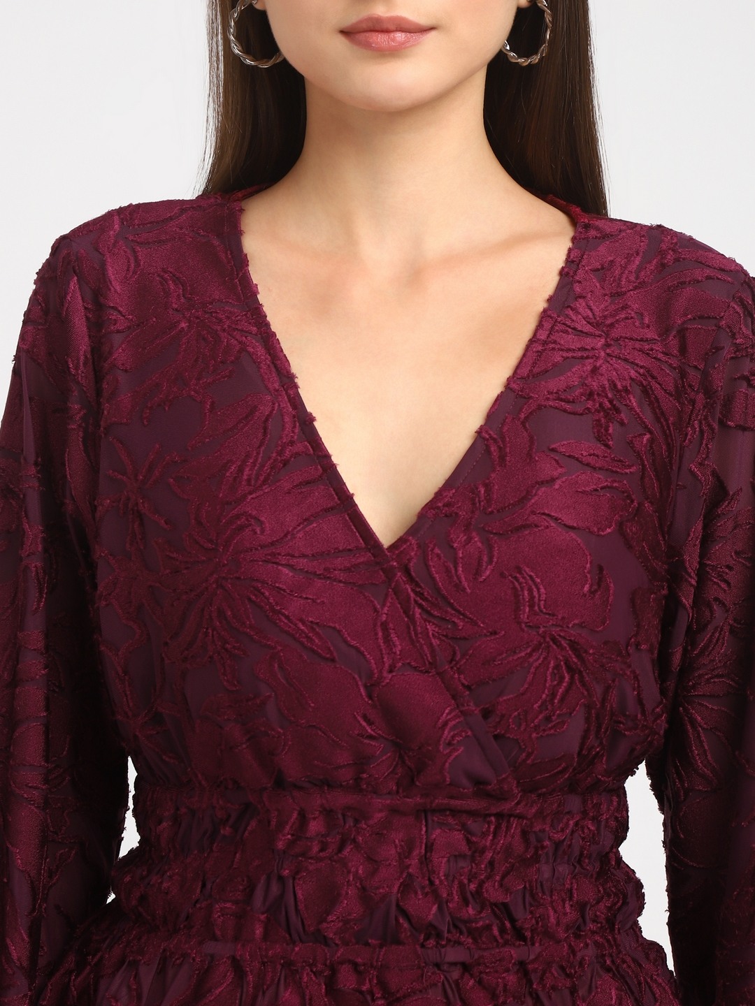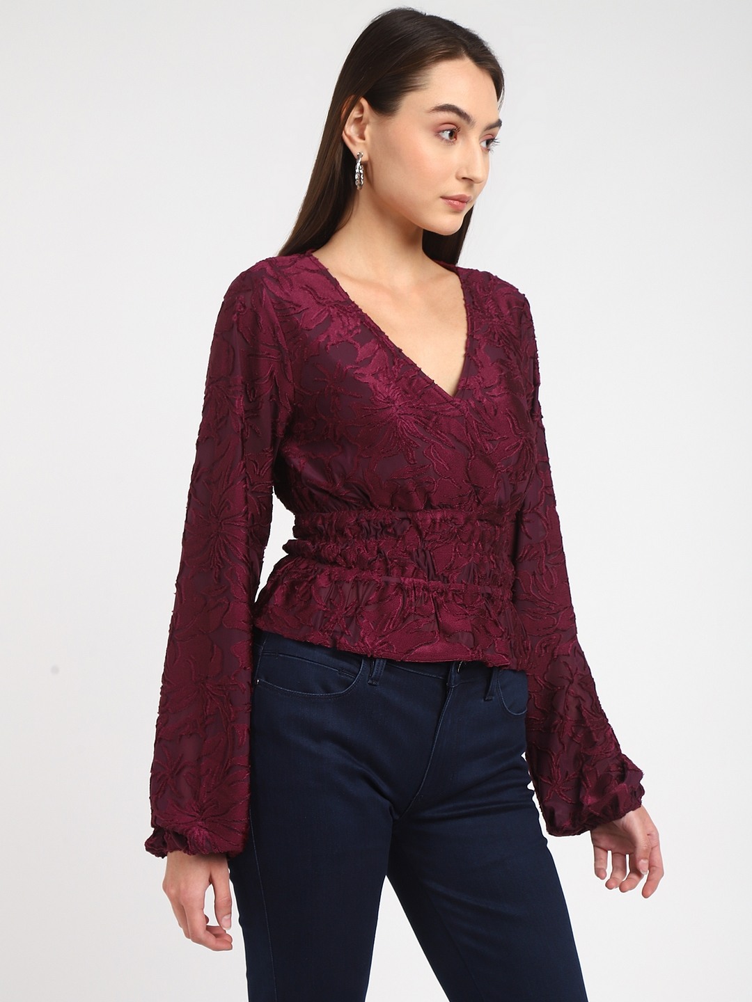 Maroon Self Design V-Neck Full Sleeves Wrap Top