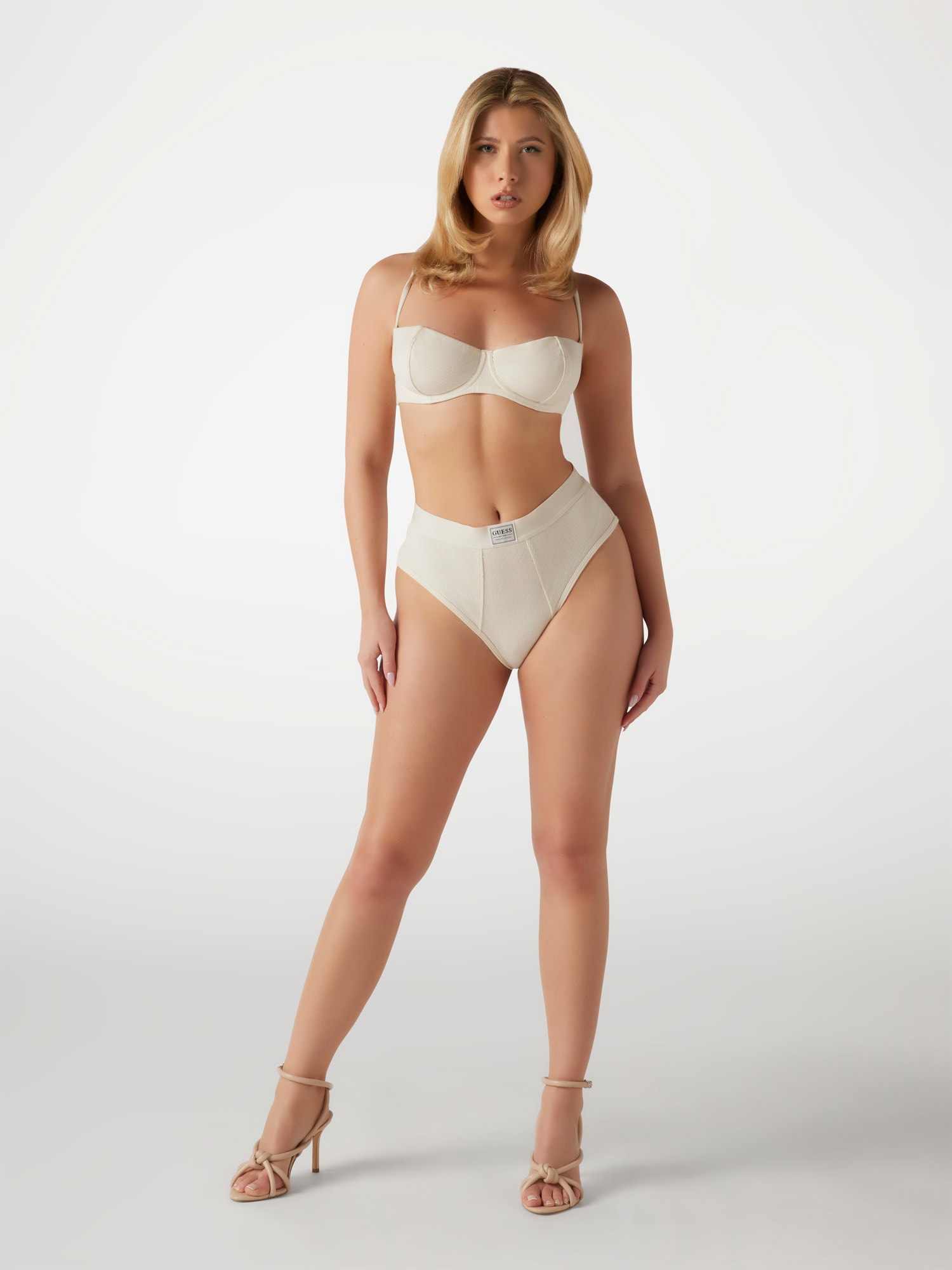 The Tessa Wired Balconette Bra by Guess in a warm off-white (Brun/Regency Beige) is a sophisticated everyday essential. Crafted from eco-friendly 92% Modal and 8% Elastane/Spandex, its solid, smooth ribbed fabric offers breathability and a second-skin feel. The underwired, padded design delivers excellent half-cup coverage with a flattering balconette lift. Adjustable straps and a Hook and Eye closure allow for a fully customised fit. Comfort, support, and understated elegance in one.