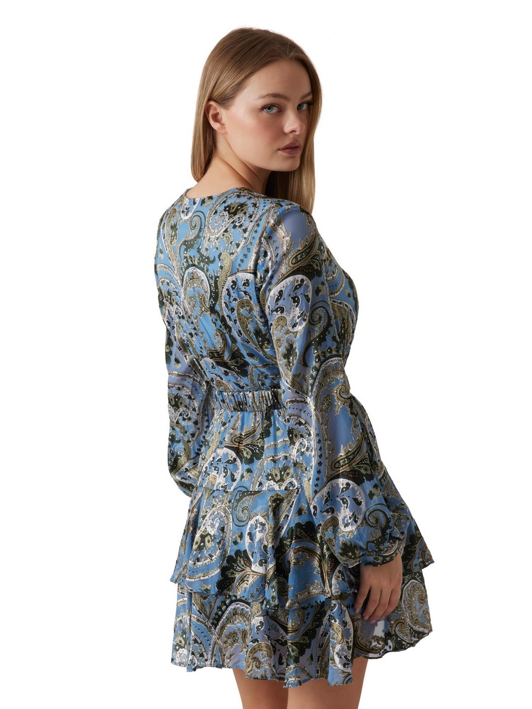 Elevate your wardrobe with our stunning blue layered dress, designed to captivate with its fit & flare silhouette and enchanting paisley pattern. Crafted from a luxurious viscose blend, this dress offers a soft, breathable feel, perfect for any occasion. The elegant long sleeves and flattering V-neckline add a touch of sophistication, while the pull-on closure ensures effortless wear. Whether you're attending a daytime event or an evening gathering, this versatile dress promises to make a statement, combining comfort with timeless style.