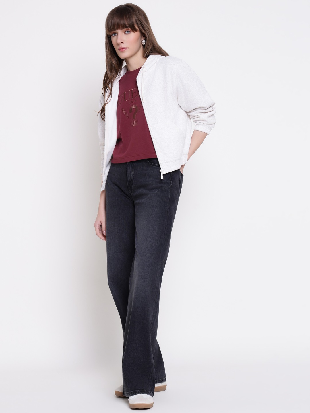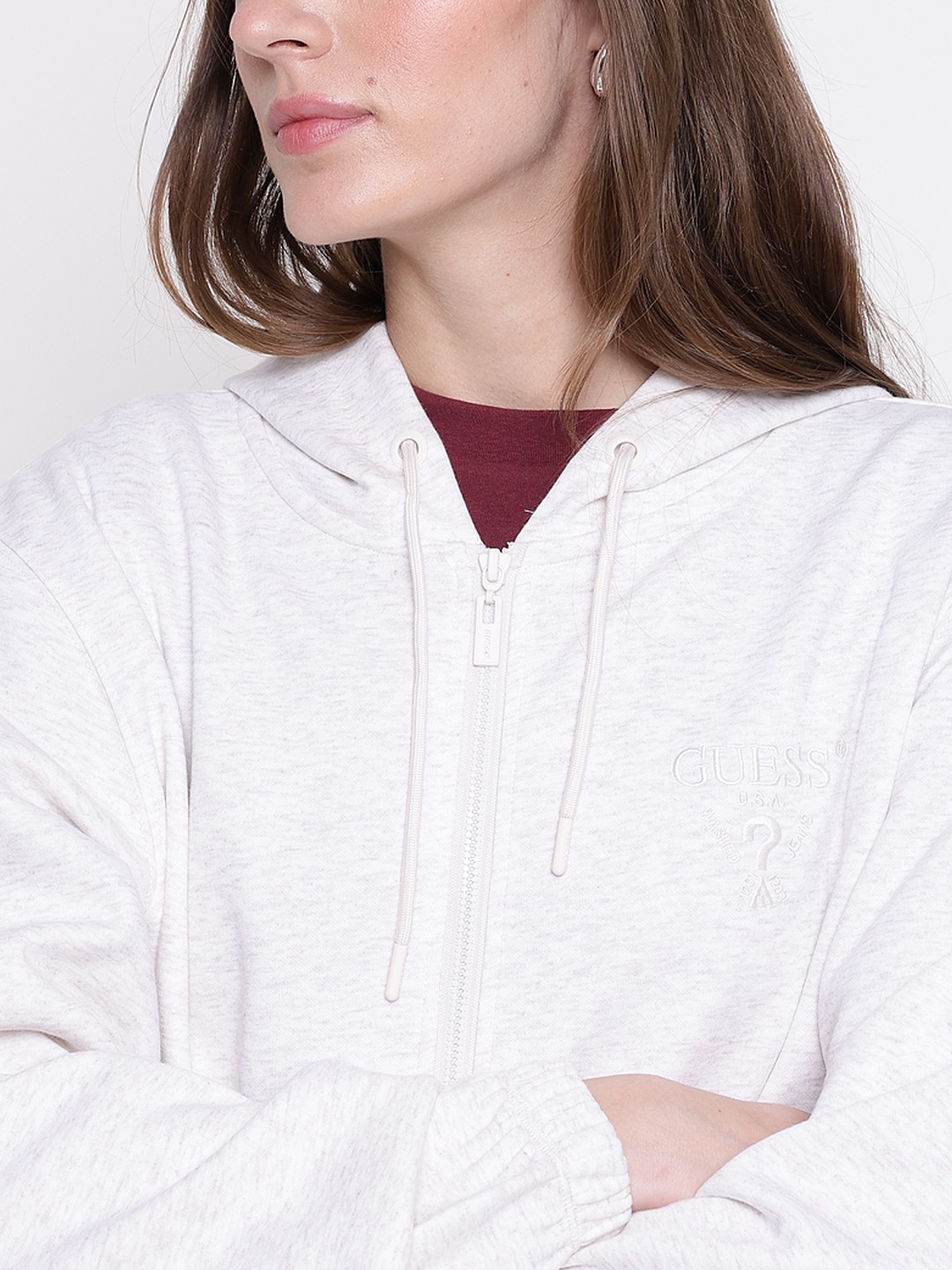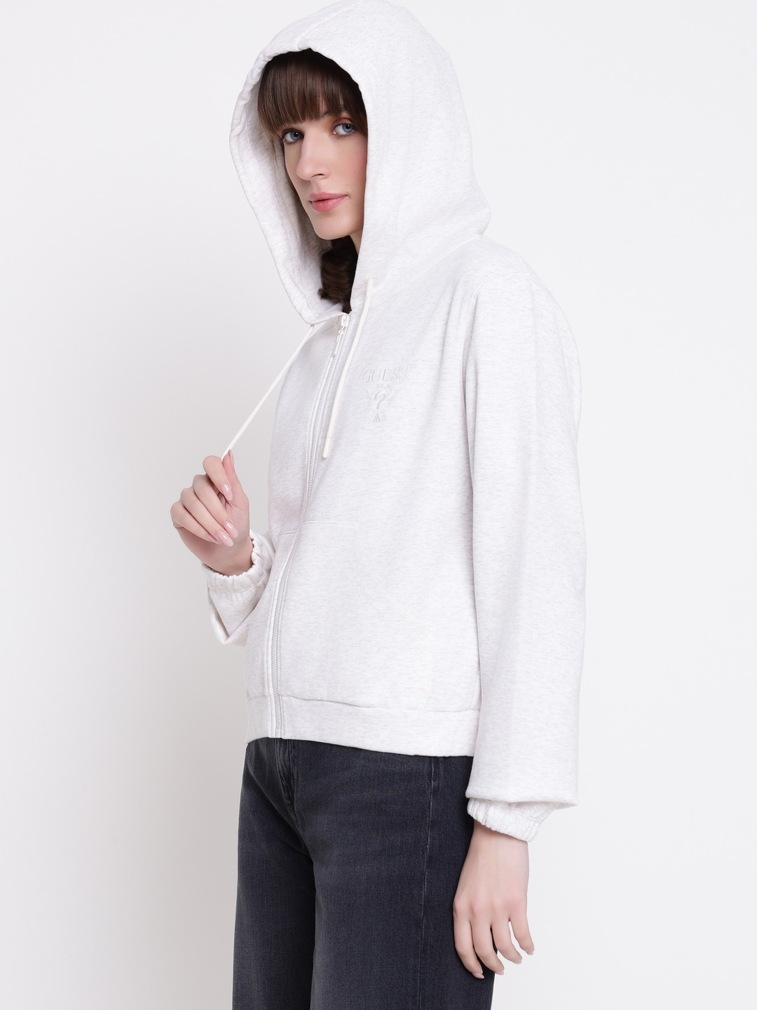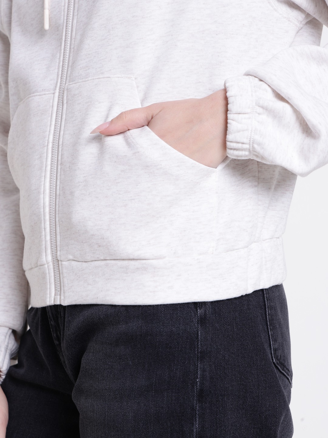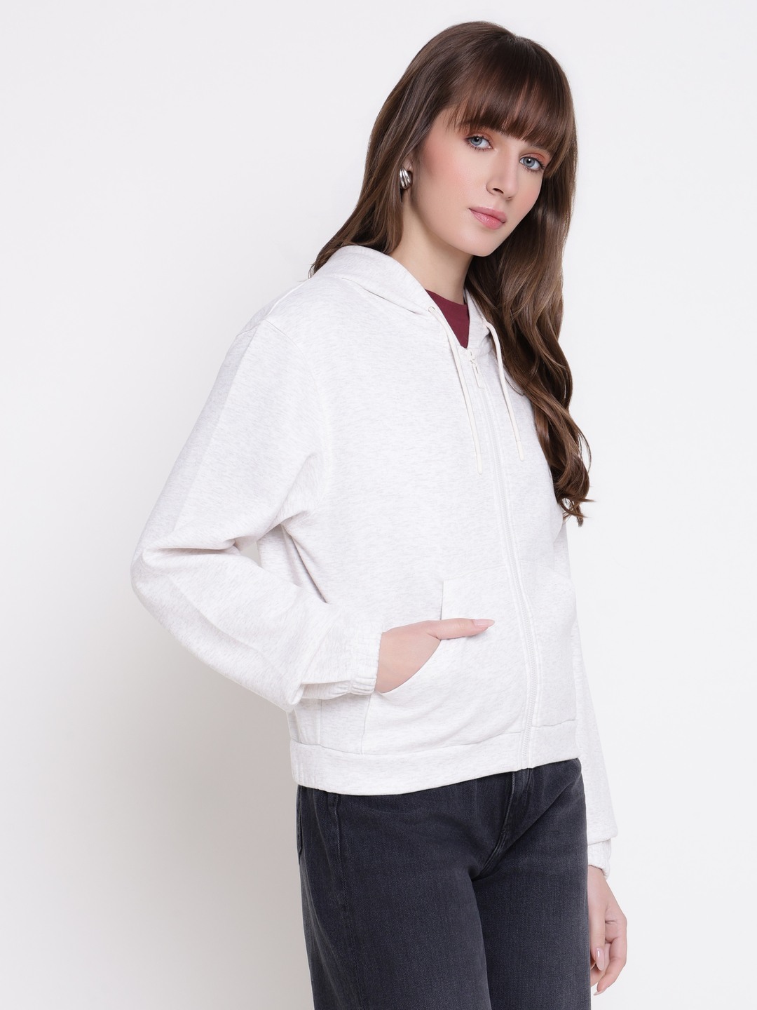 The roberta full zip cotton fleece sweatshirt offers women a comfortable and stylish option for casual wear. Designed in a cream solid pattern, it features a regular fit that suits various body types. The full sleeve design and hooded neck provide added warmth and versatility. Made from soft polyester fabric, it ensures durability and comfort throughout the day. The front zipper closure allows easy wear and removal, making it perfect for layering or standalone use. A must-have for a relaxed, fashionable look.