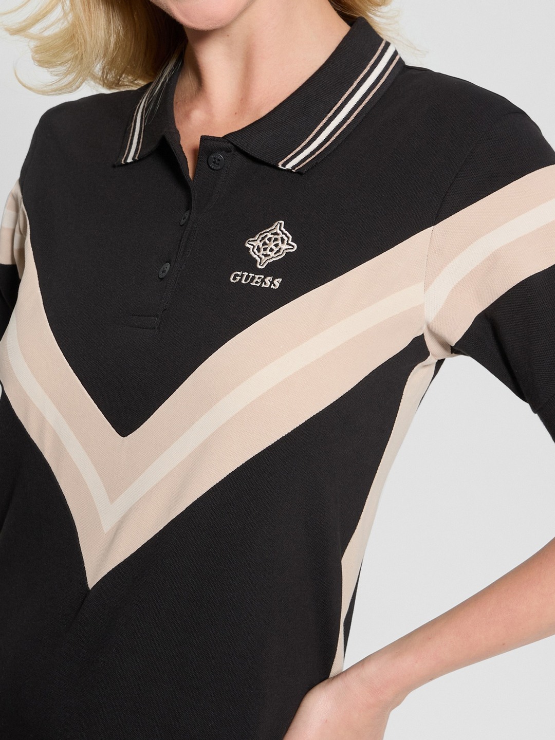 Elevate your wardrobe with this chic black dress, featuring a timeless striped pattern. Designed for a regular fit, it boasts short sleeves and a classic collar. Crafted from a comfortable cotton blend, it ensures all-day wearability. The button closure adds a touch of sophistication, making it perfect for any occasion.
