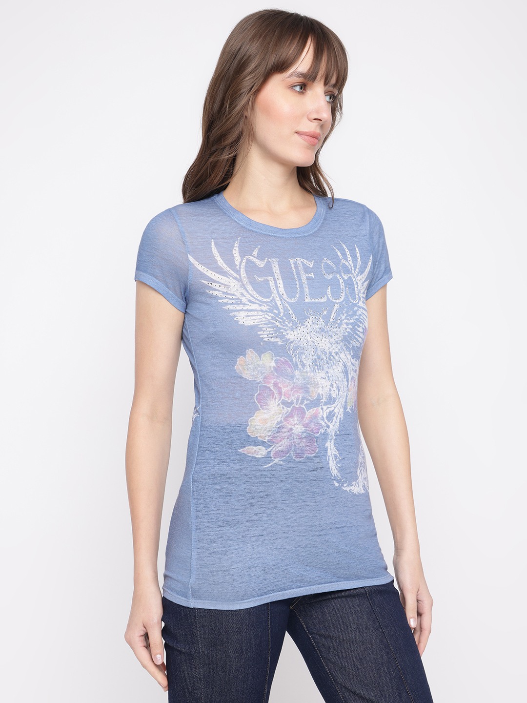 Elevate your wardrobe with this chic blue floral-patterned T-shirt. Designed for a slim fit, it features short sleeves and a classic crew neck. Crafted from a soft cotton blend, it ensures comfort and style. The slip-on closure makes it easy to wear, perfect for any casual outing.