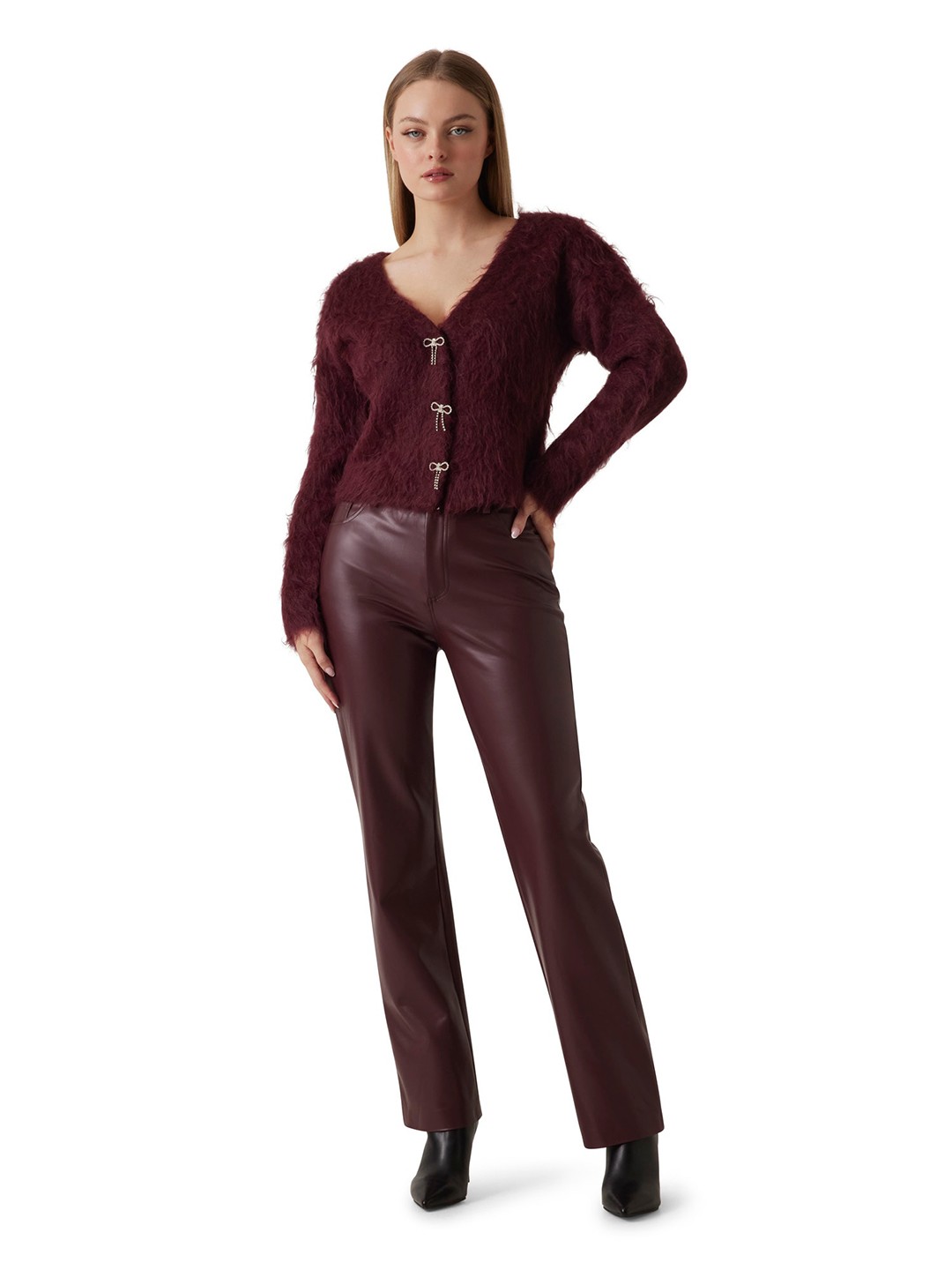 Elevate your wardrobe with our elegant maroon cardigan, designed for the modern woman who values both style and comfort. This regular-fit cardigan features a sophisticated solid/fur pattern, offering a touch of luxury to any ensemble. Crafted from high-quality acrylic fabric, it ensures warmth and durability while maintaining a soft, cozy feel. The full sleeves and classic v-neck design provide a timeless silhouette, complemented by a secure button closure. Perfect for layering, this versatile piece is a must-have for any season.