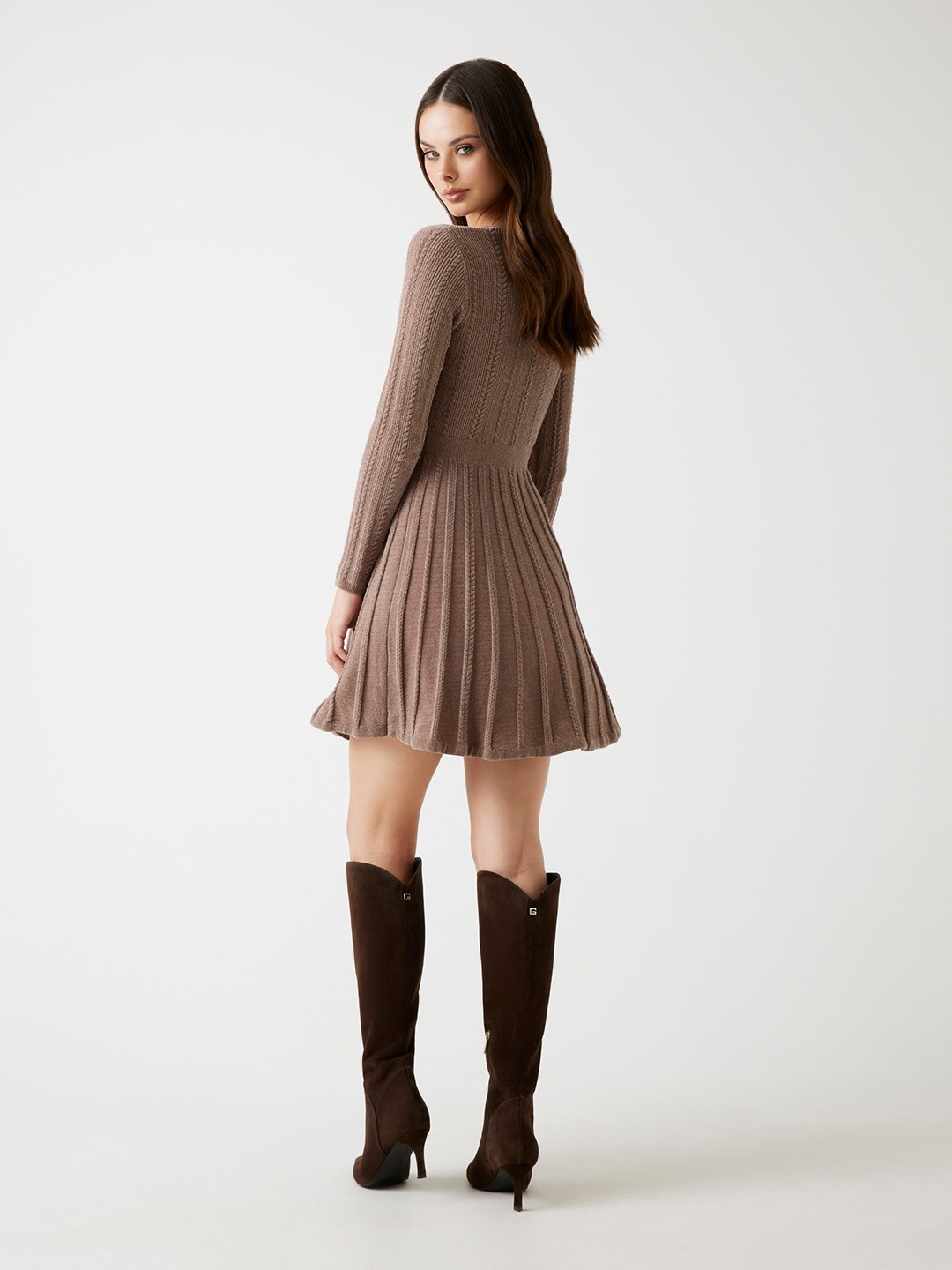 Elevate your wardrobe with our elegant taupe dress, designed for the modern woman who values both style and comfort. This regular fit dress features a sophisticated cable knit pattern that adds texture and depth, making it perfect for any occasion. Crafted from high-quality polyester fabric, it offers a soft, luxurious feel against the skin. The full sleeves and classic round neck provide a timeless silhouette, while the convenient pull-on closure ensures ease of wear. Ideal for day-to-night transitions, this dress is a versatile addition to your collection.
