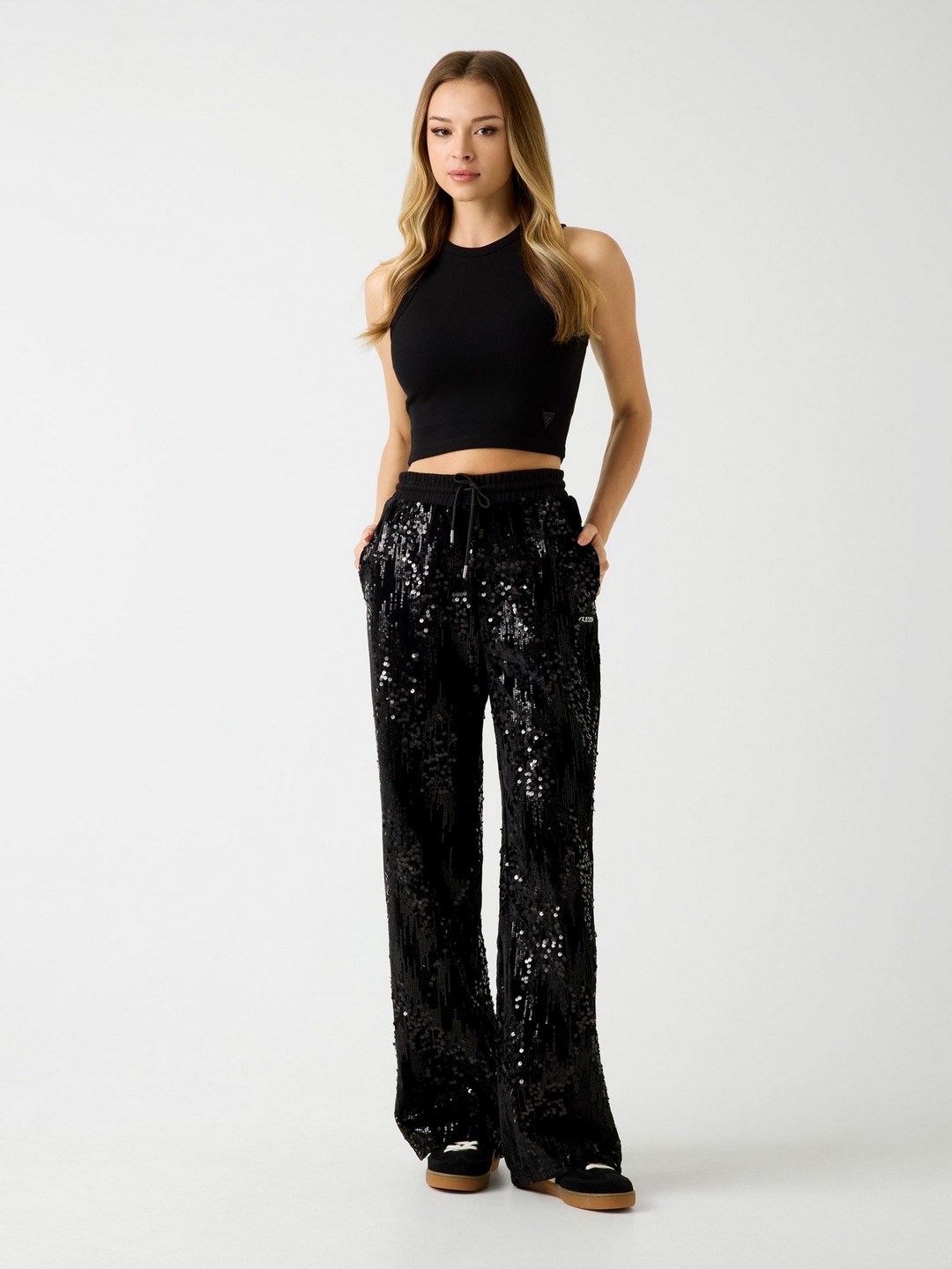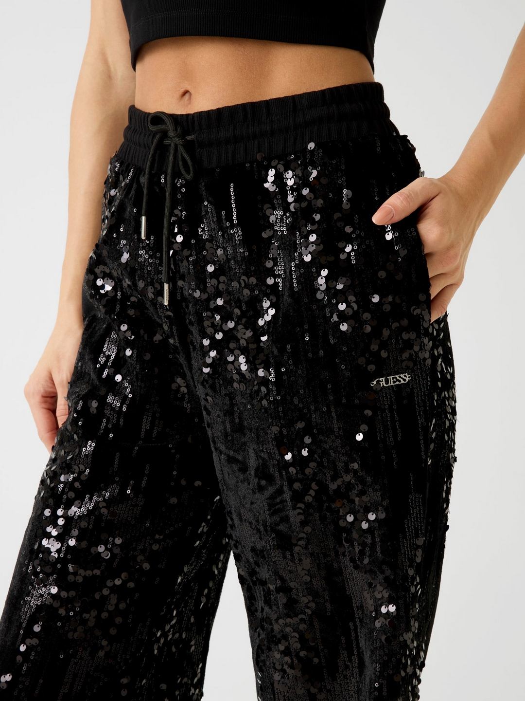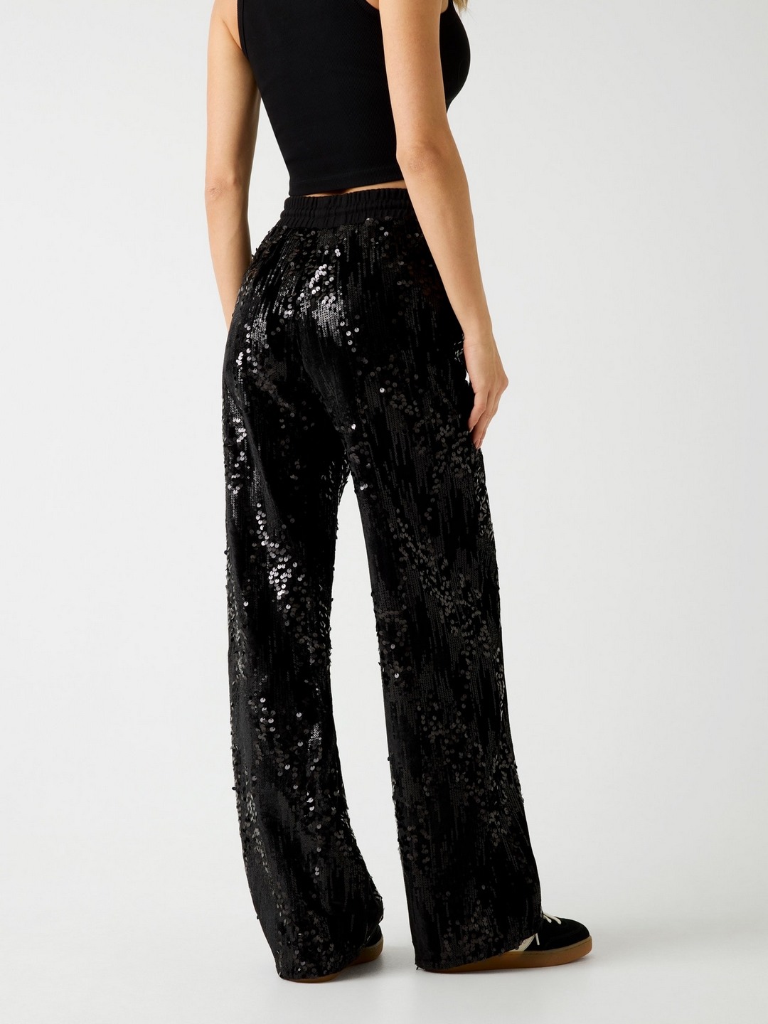 Elevate your wardrobe with our stunning black sequined trousers designed for the modern woman. These high-rise trousers feature a chic sequined pattern that adds a touch of glamour to any outfit. Crafted from premium polyester fabric, they offer a comfortable fit and a sleek silhouette. The drawstring closure ensures a customizable fit, making them perfect for any occasion. Whether you're heading to a party or a night out, these trousers will make you shine. Pair them with your favorite top and heels for an effortlessly stylish look.