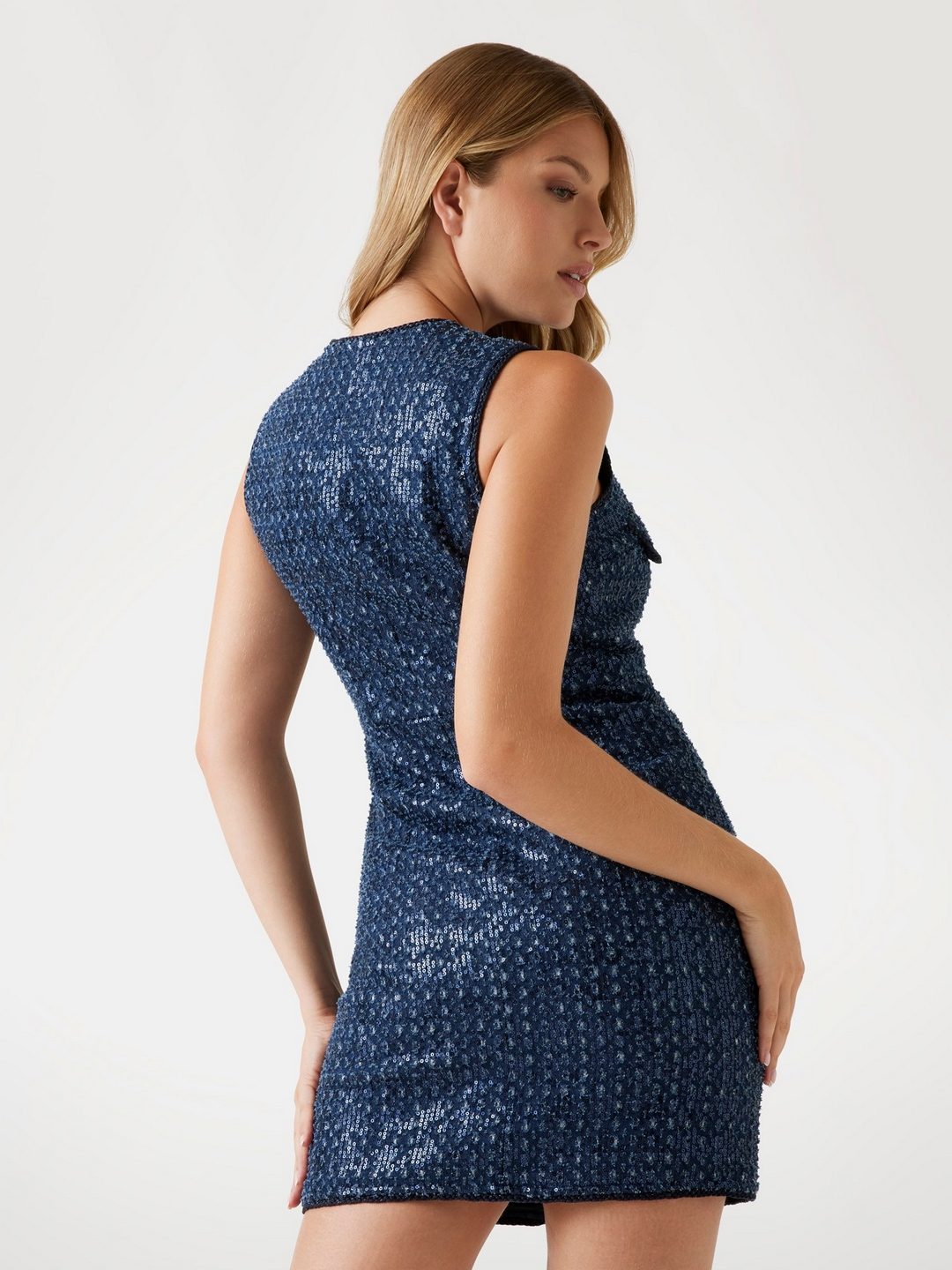 Elevate your style with our stunning navy blue bodycon dress, designed to make a statement. This exquisite piece features a regular fit that flatters your silhouette, while the sequined pattern adds a touch of glamour. Crafted from a premium cotton blend fabric, it ensures comfort and breathability. The sleeveless design and v-neckline enhance its chic appeal, making it perfect for any occasion. A button closure at the back adds a sophisticated finish. Ideal for evening events or a night out, this dress is a must-have addition to your wardrobe.