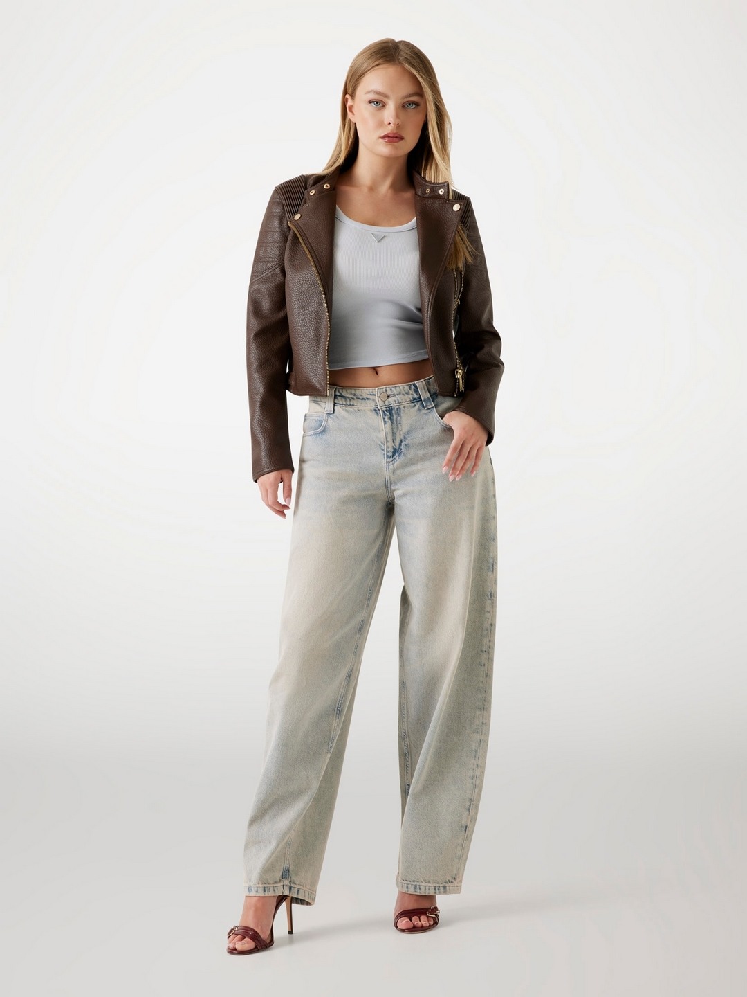 Elevate your wardrobe with our chic brown jacket, designed for the modern woman who values style and comfort. This regular-fit jacket features a sophisticated textured pattern that adds a touch of elegance to any outfit. Crafted from high-quality polyurethane fabric, it offers durability and a sleek finish. The long sleeves and notch collar provide a classic silhouette, while the zip closure ensures a secure and flattering fit. Perfect for both casual outings and formal occasions, this versatile jacket is a must-have addition to your collection.