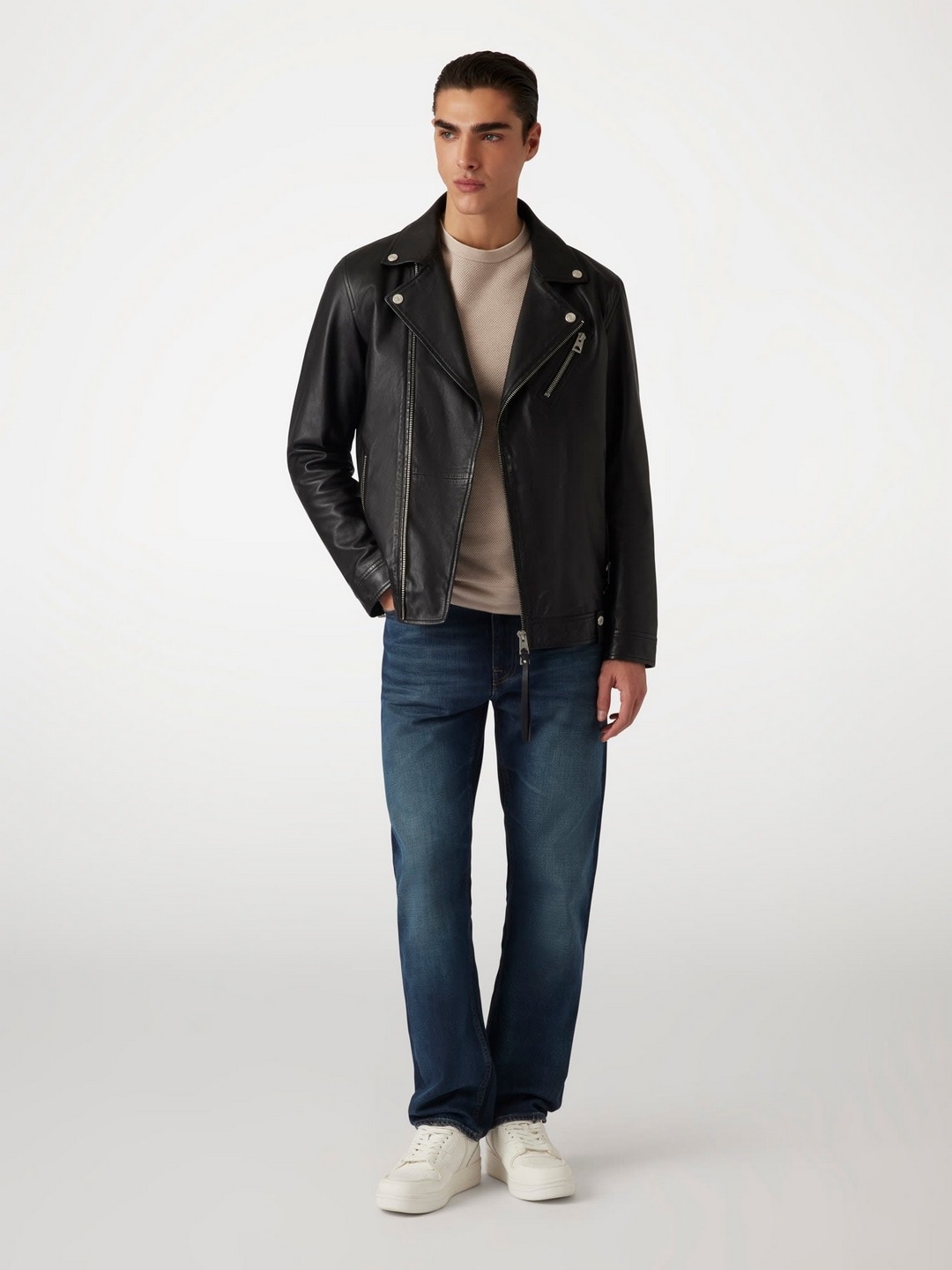 Introducing the perfecto leather biker jacket, a quintessential piece for the modern man. Crafted in premium black leather, this jacket is designed to withstand heavy winter conditions while exuding timeless style. Its solid pattern and full sleeves offer a sleek silhouette, complemented by a classic lapel collar. The durable leather fabric ensures longevity, while the zip closure provides a snug fit against the cold. Perfect for the fashion-forward individual, this jacket combines functionality with edgy sophistication, making it a must-have for any wardrobe.