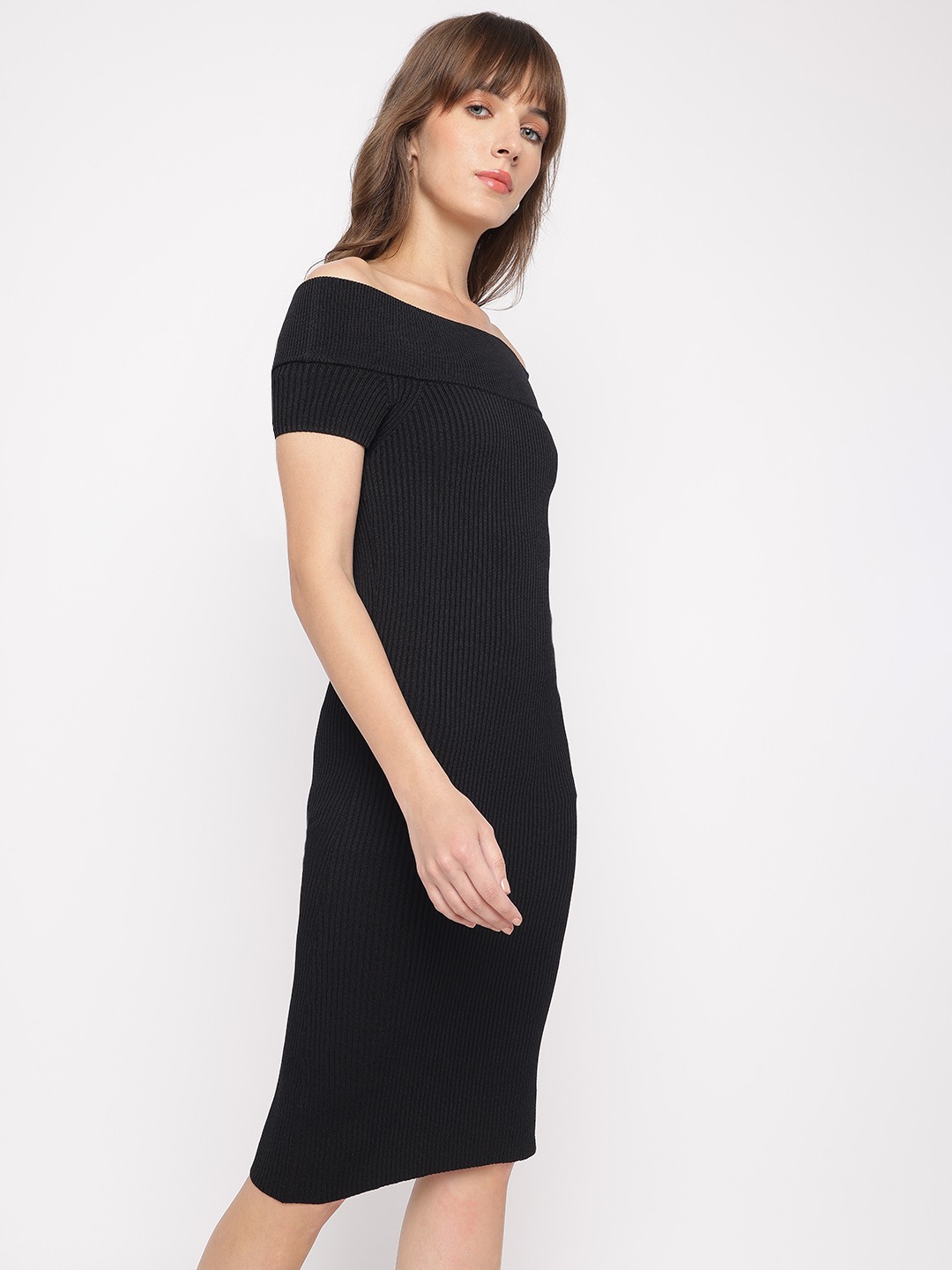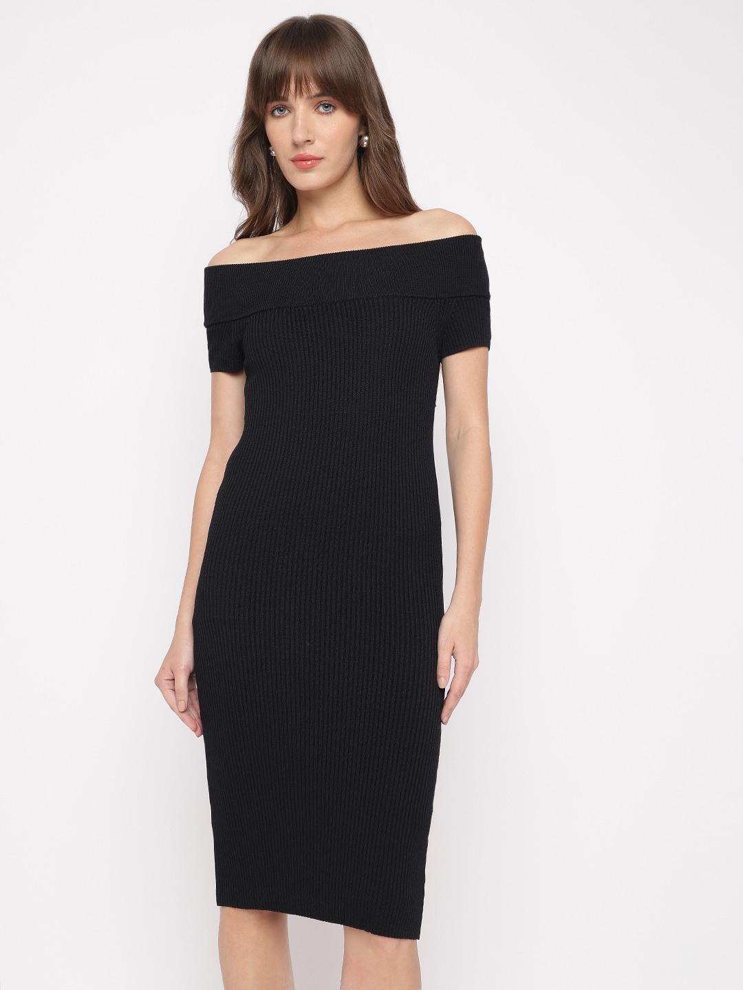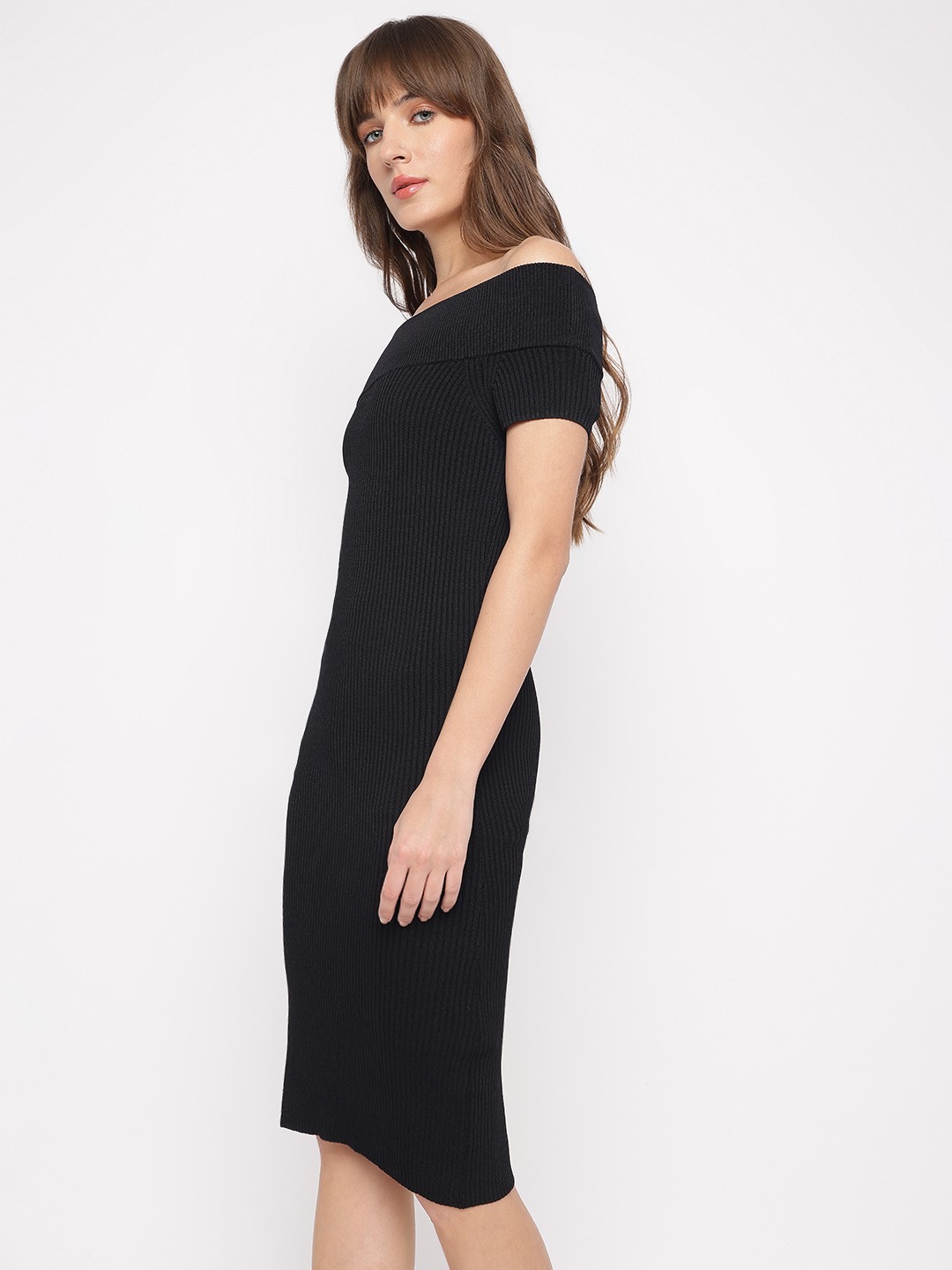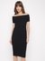 Jet Black Textured Off-Shoulder Short Sleeves Lidia Bodycon Dress