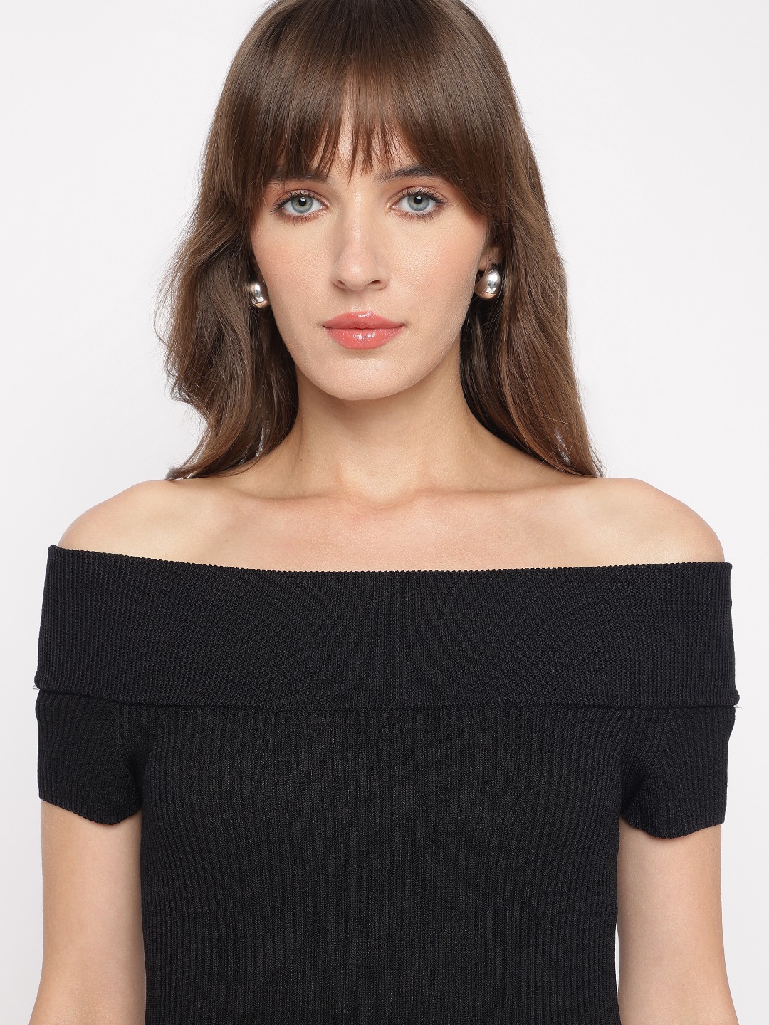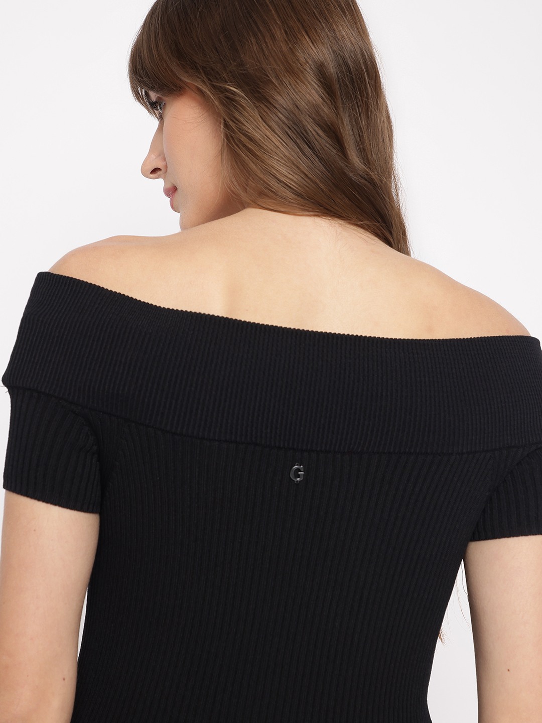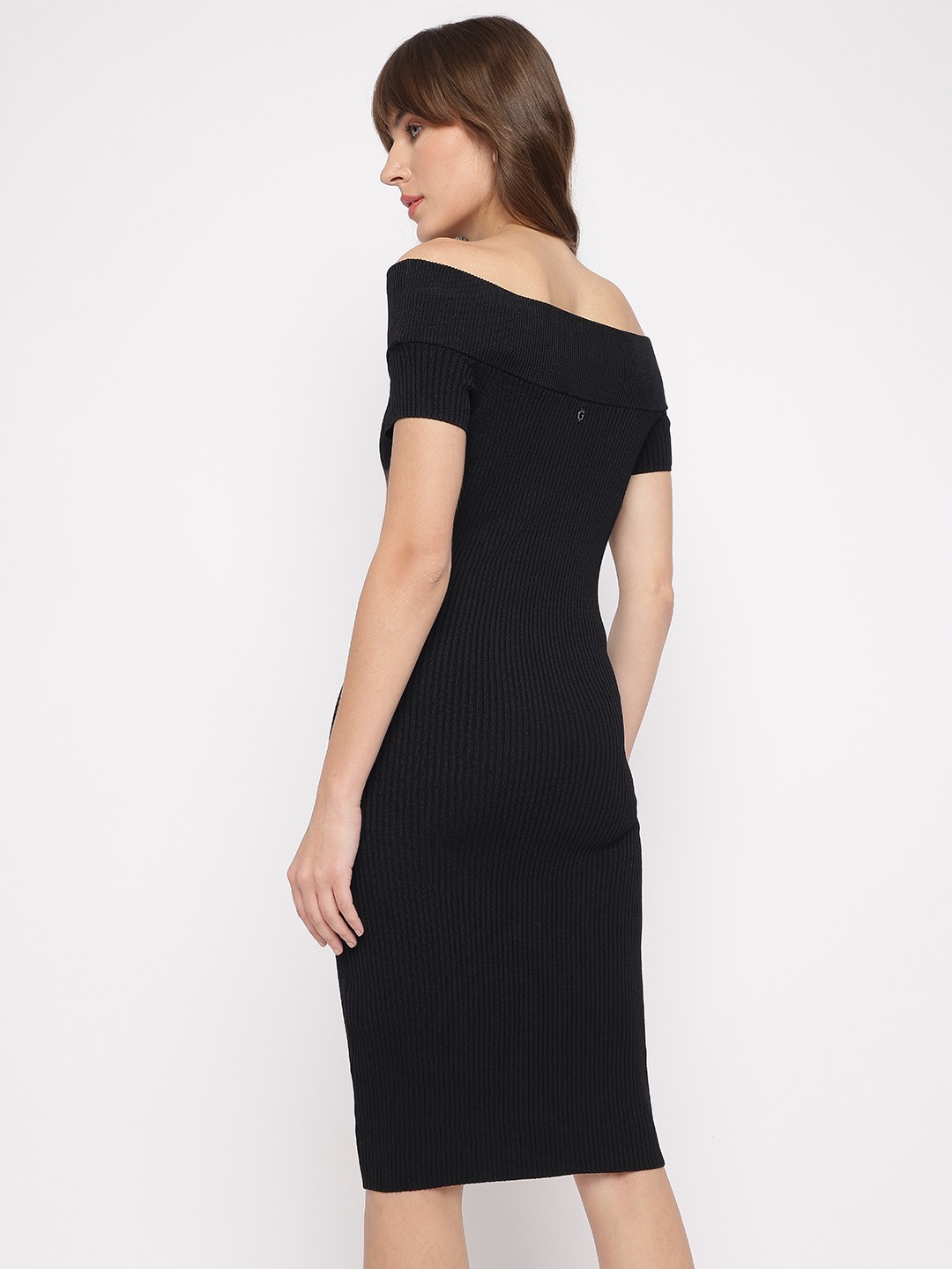 Jet Black Textured Off-Shoulder Short Sleeves Lidia Bodycon Dress
