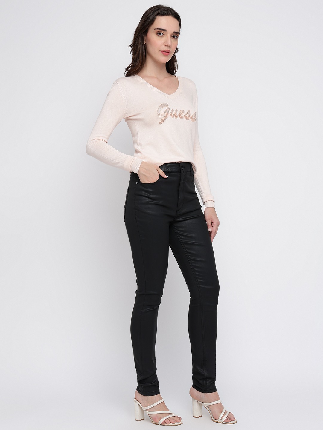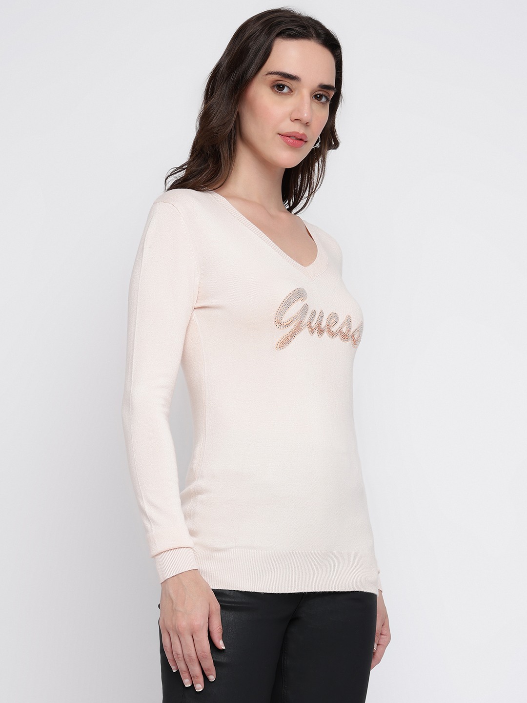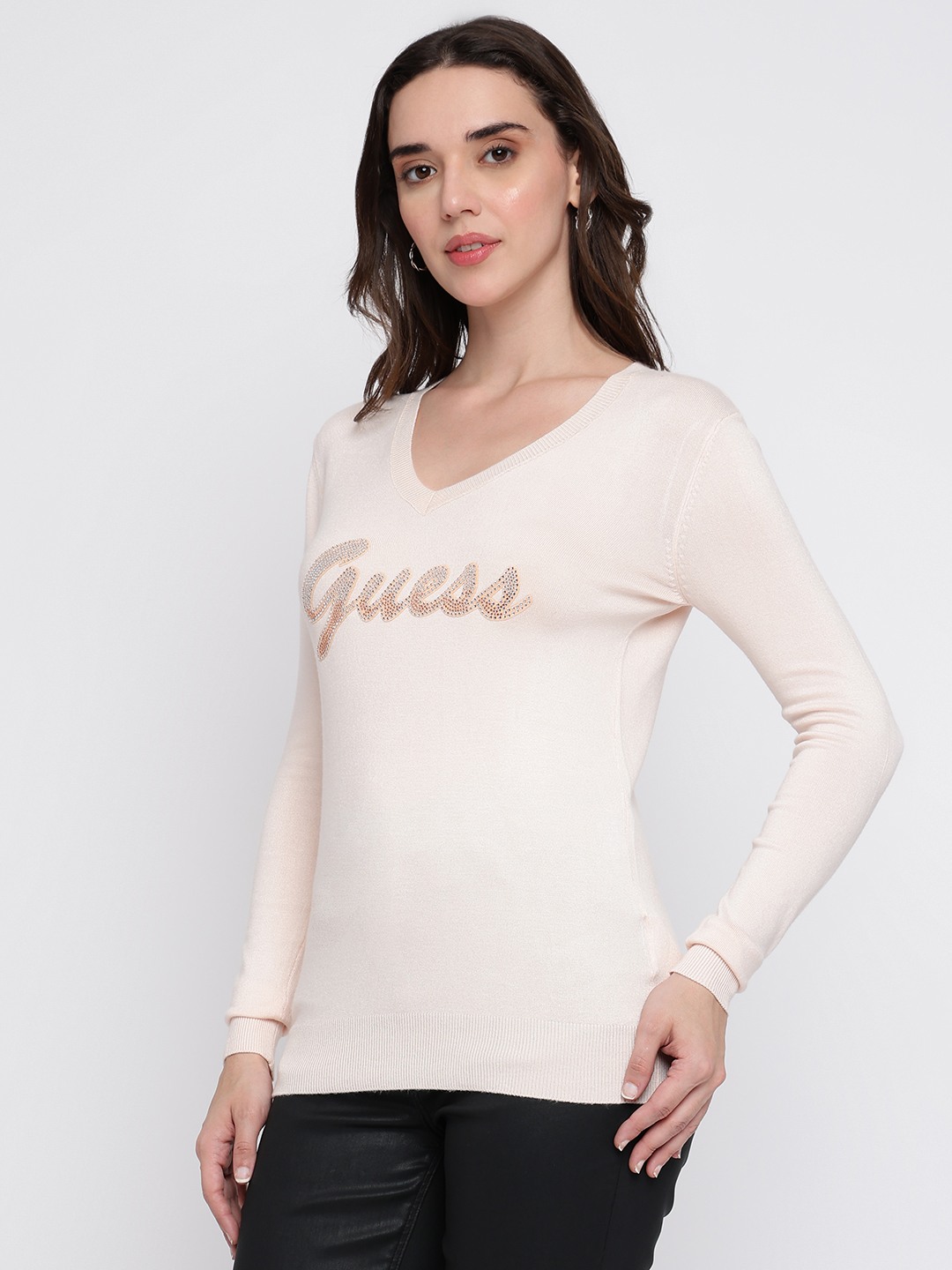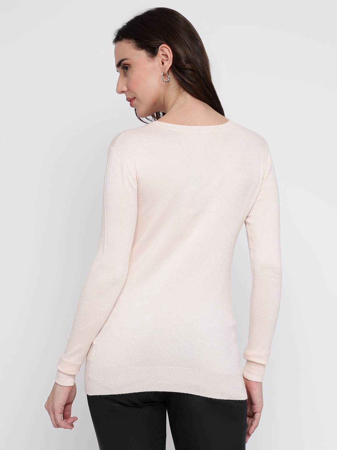 Wrap yourself in elegance with our light pink sweater, designed for the modern woman who values both style and comfort. This regular fit piece features an exquisite embellished pattern that adds a touch of sophistication to any outfit. Crafted from a luxurious blend of 82% viscose, 16% polyamide, and 2% elastane, it offers a soft, stretchy feel that moves with you. The full sleeves and flattering V-neckline make it perfect for layering or wearing solo. With a convenient pull-on closure, it's your go-to for effortless chic.