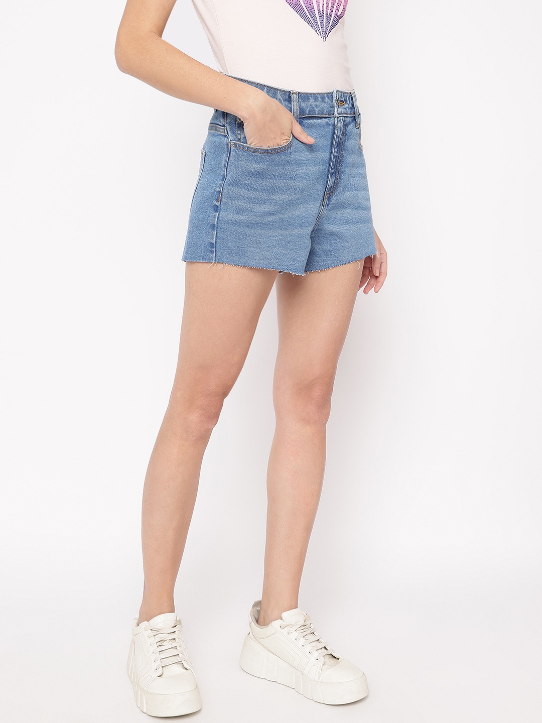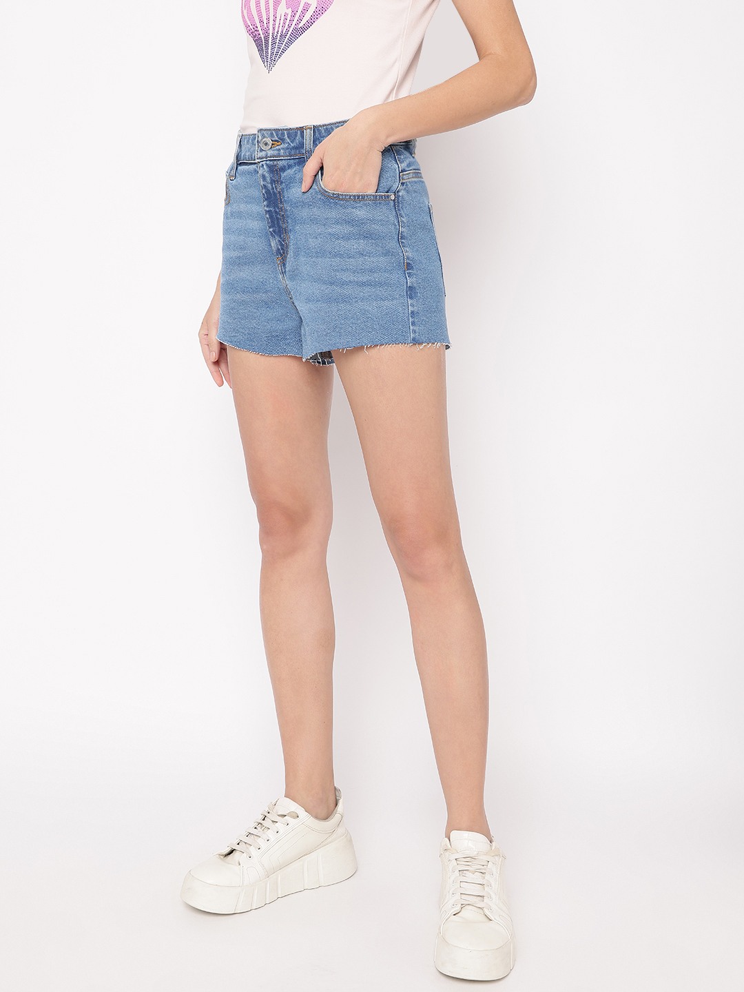 Loto Mid Solid High Rise Denim Mom Shorts