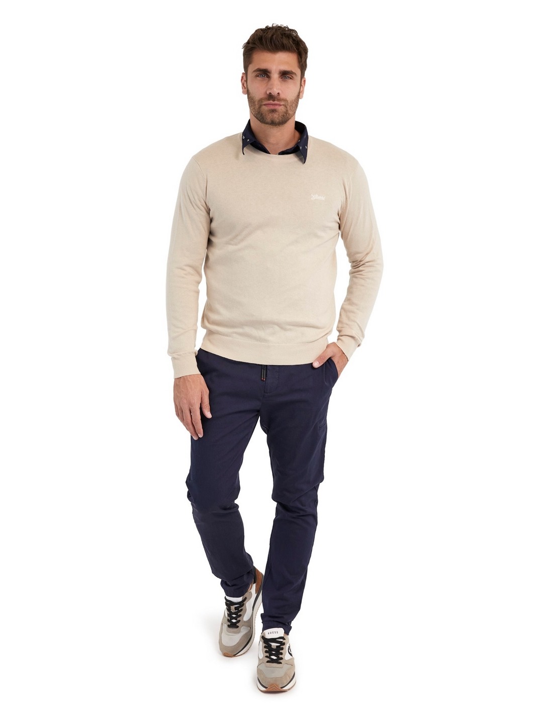 • Guess Men Beige Solid Round Neck Full Sleeves Pullover Style Sweater