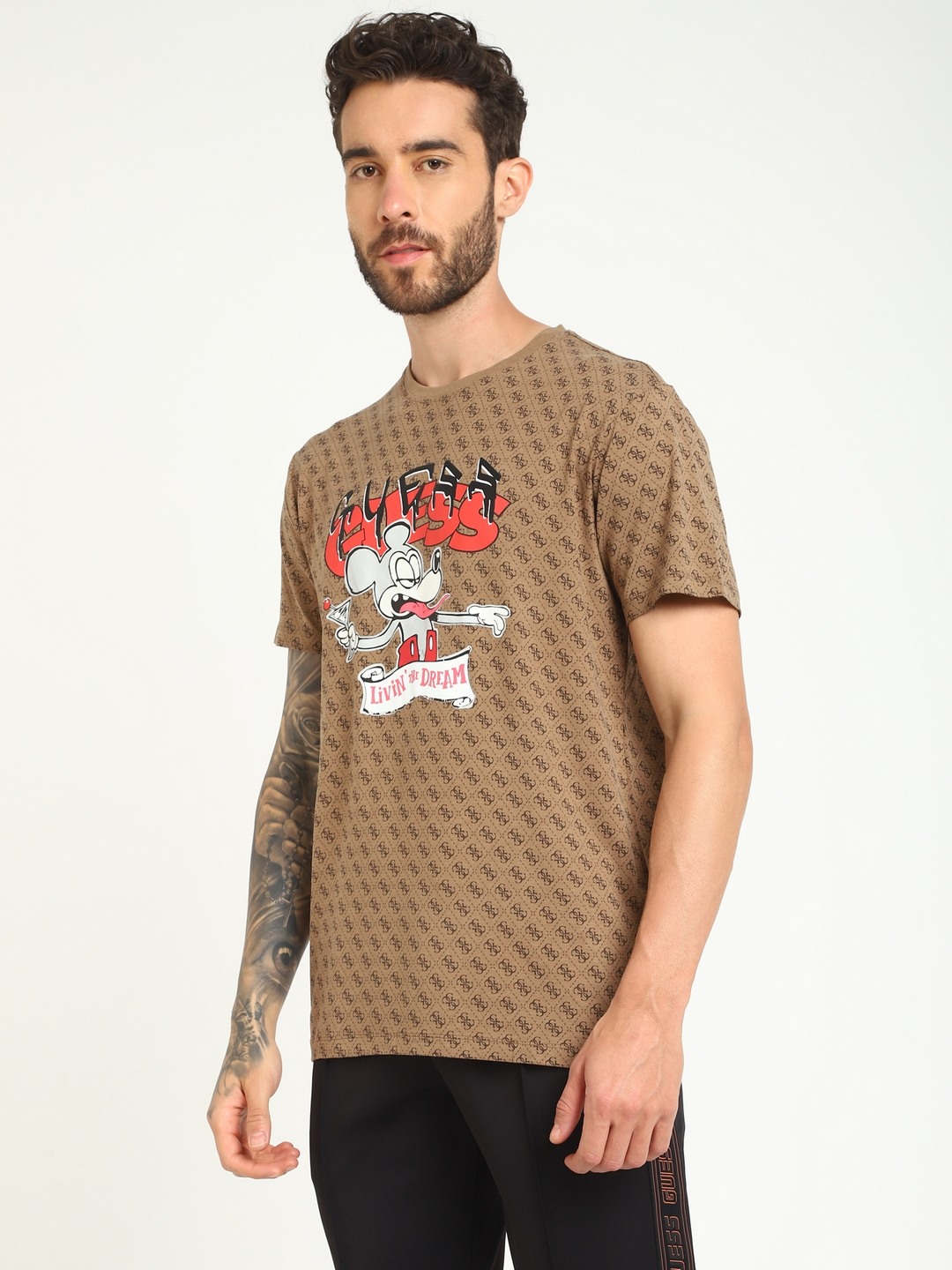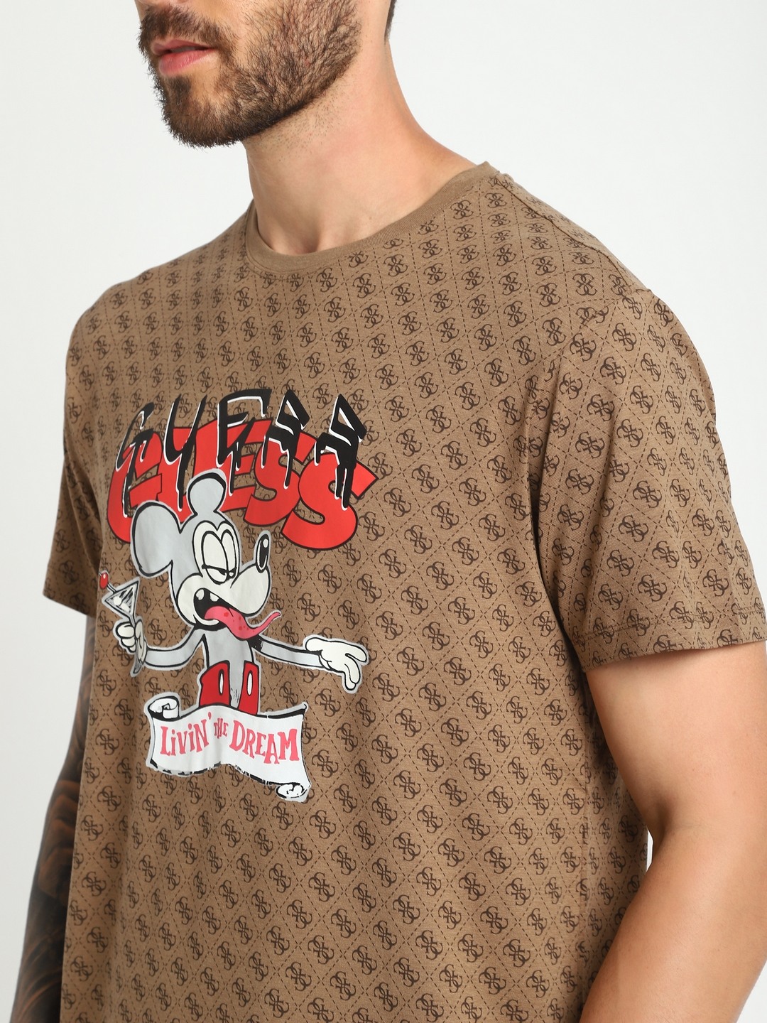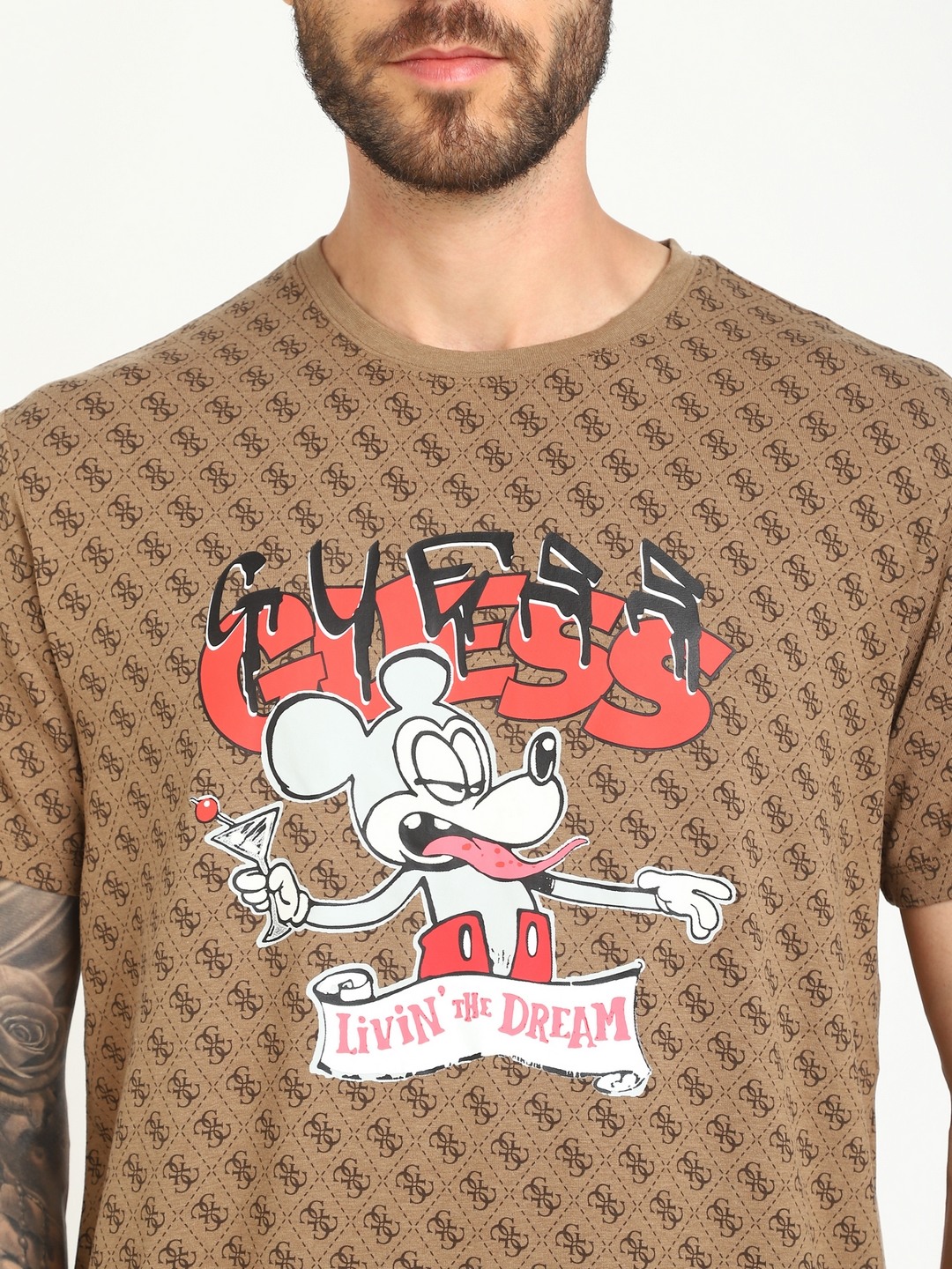 • Guess Men Brown Printed Round Neck Short Sleeves T-shirt