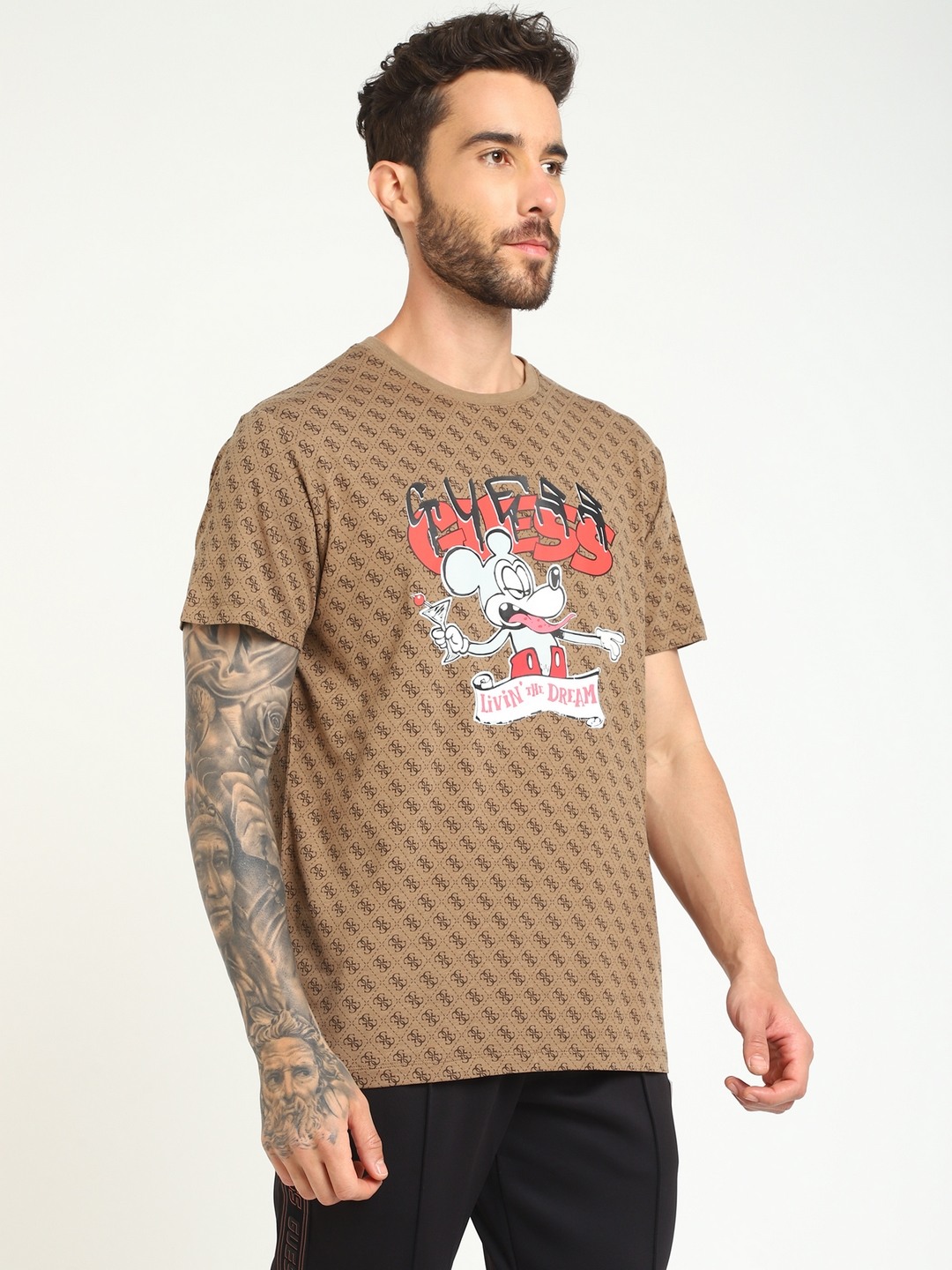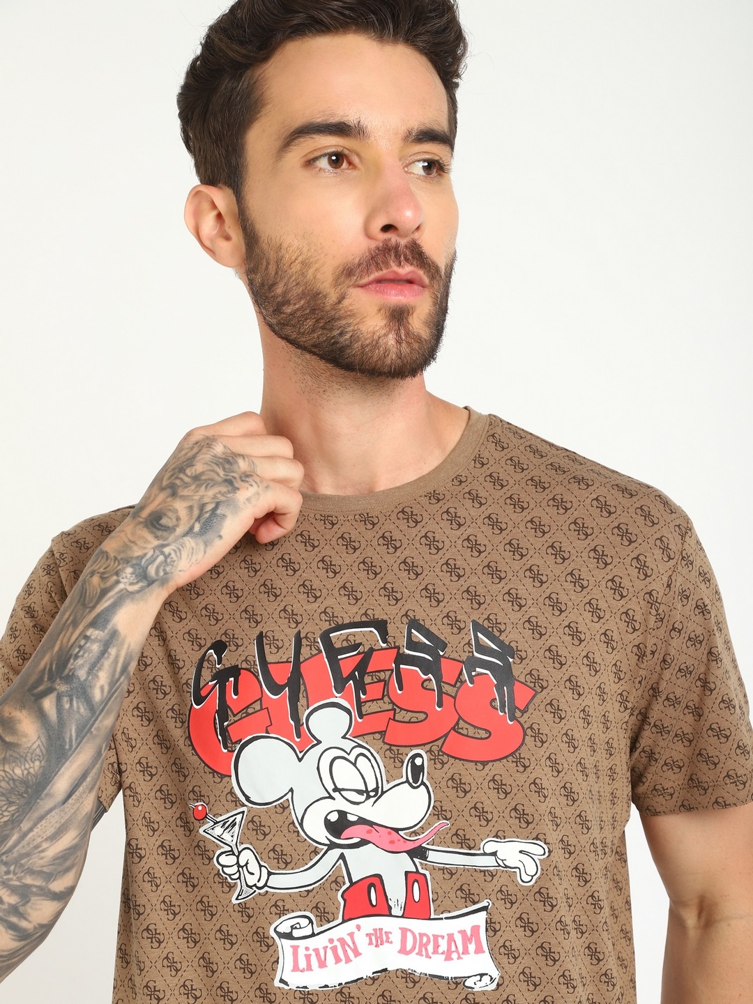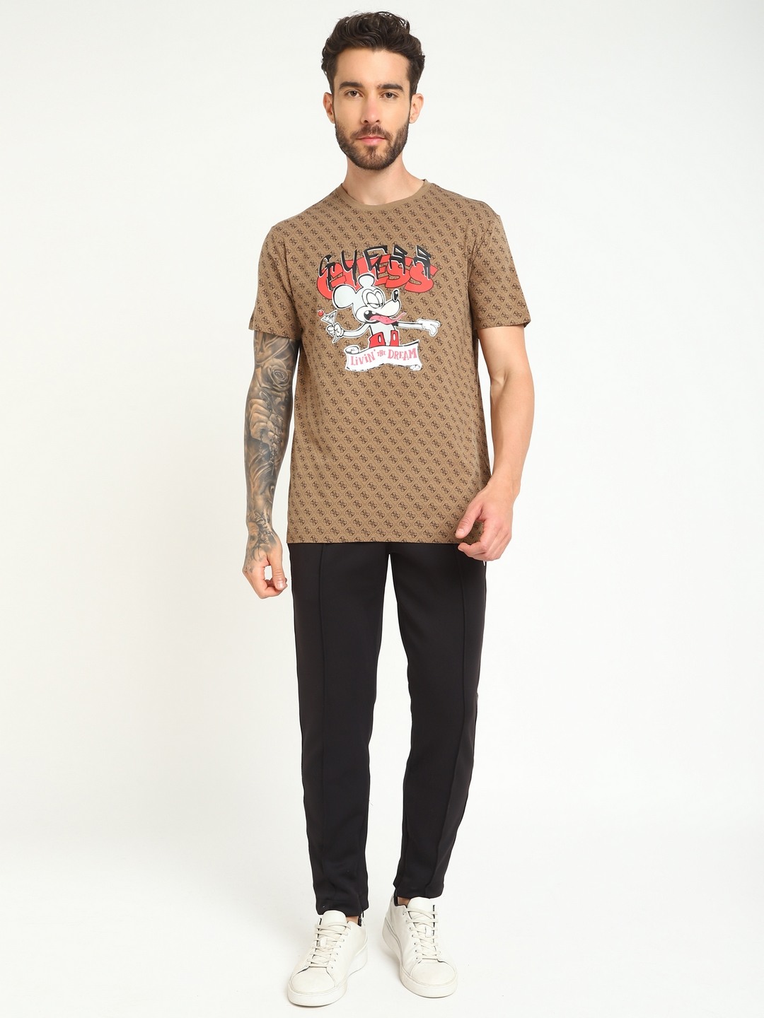 • Guess Men Brown Printed Round Neck Short Sleeves T-shirt