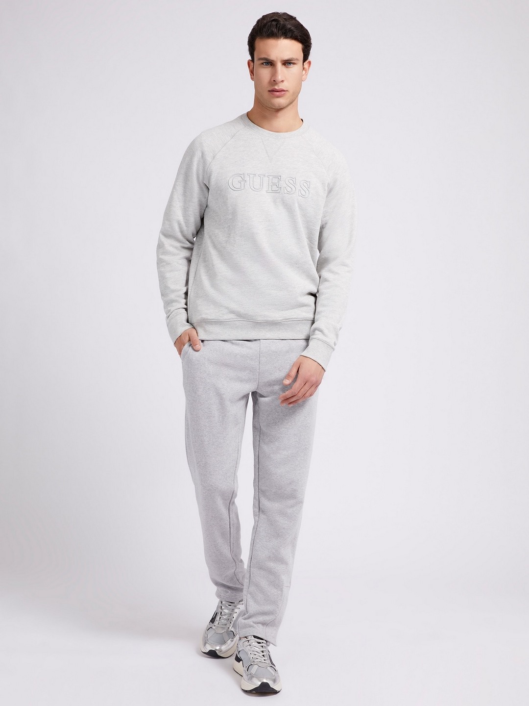 Guess Men Grey Solid Round Neck Full Sleeves Pullover Style Sweatshirt