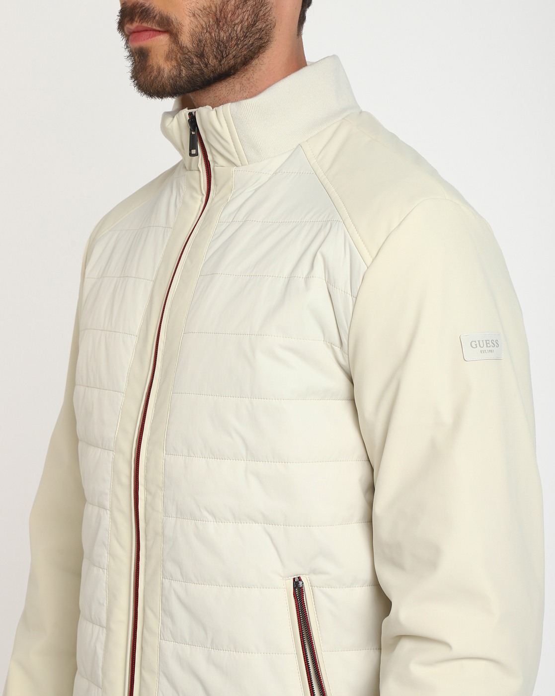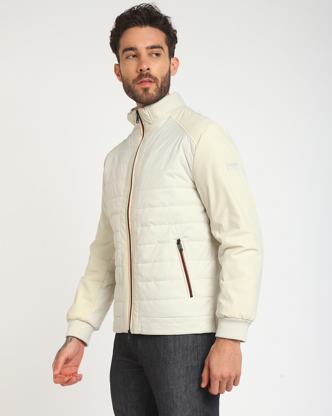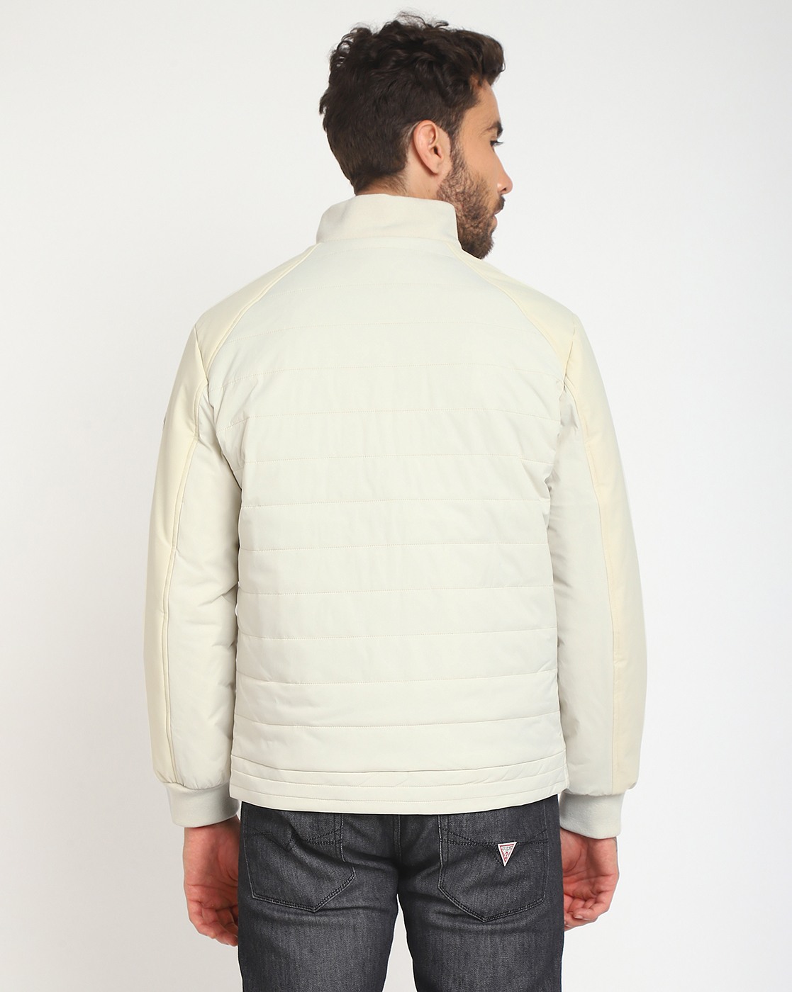 • Guess Men's Beige Polyamide Quilted Regular Fit High Neck Full Sleeve Jacket