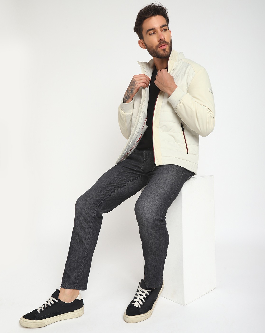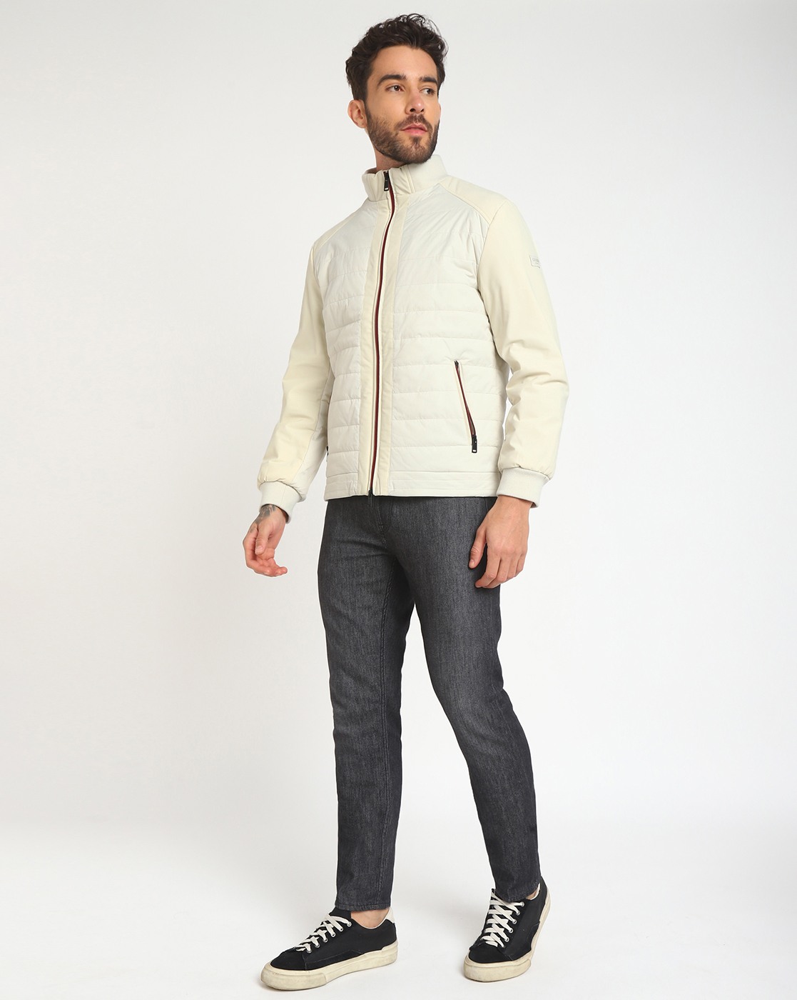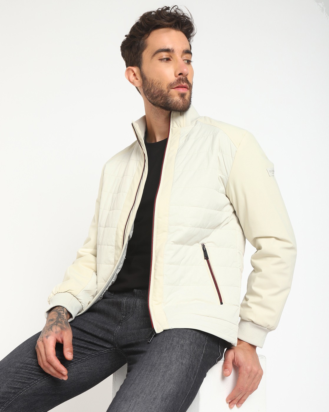 • Guess Men's Beige Polyamide Quilted Regular Fit High Neck Full Sleeve Jacket