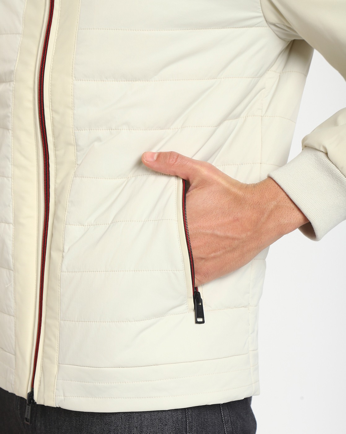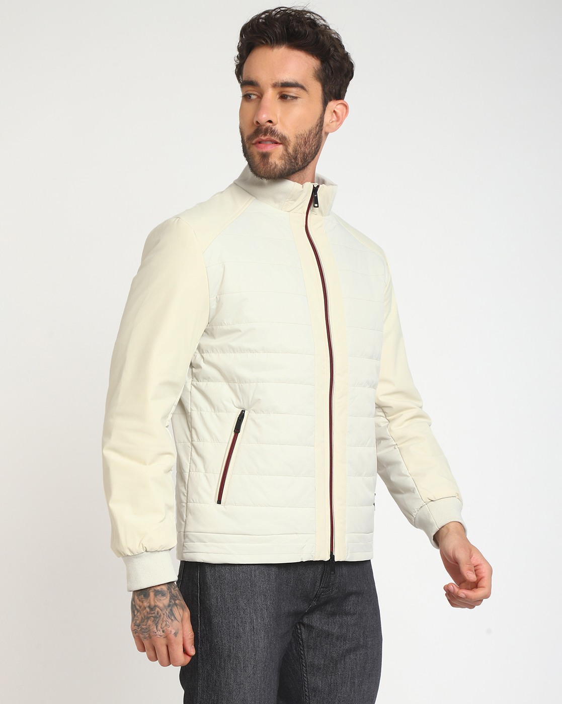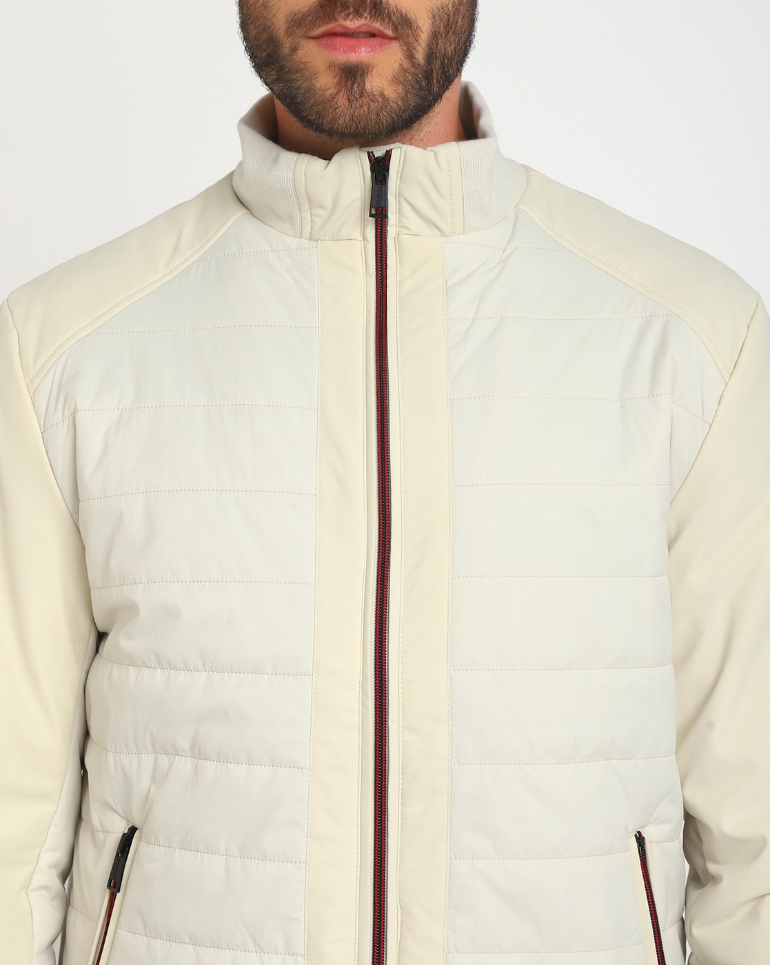 Men's Beige Polyamide Quilted Regular Fit High Neck Full Sleeve Jacket