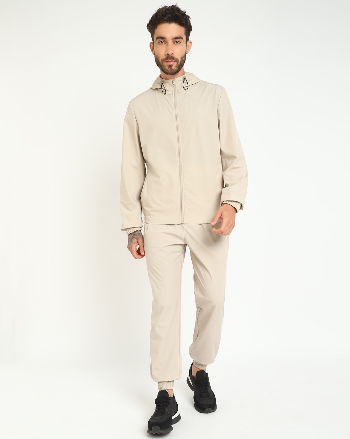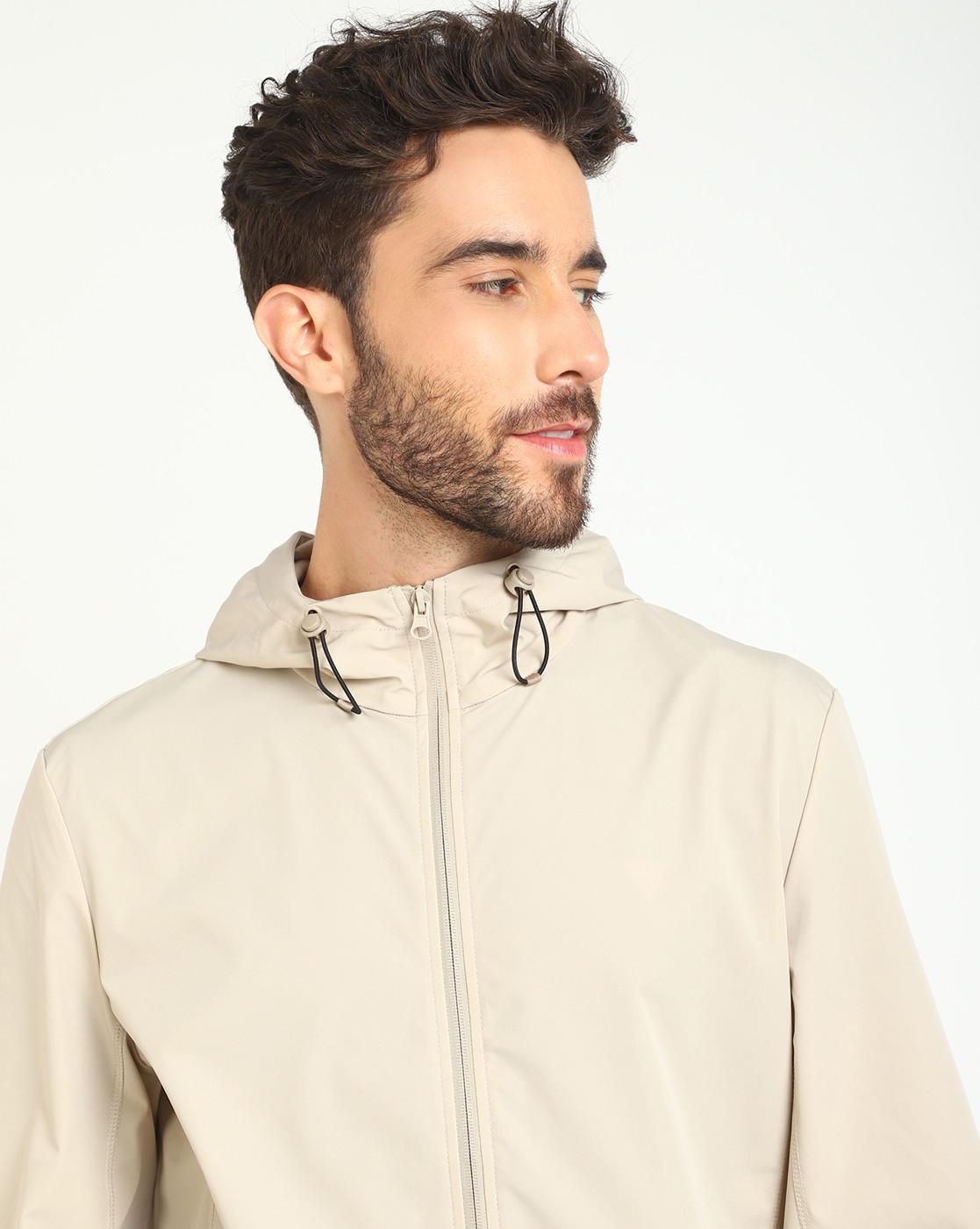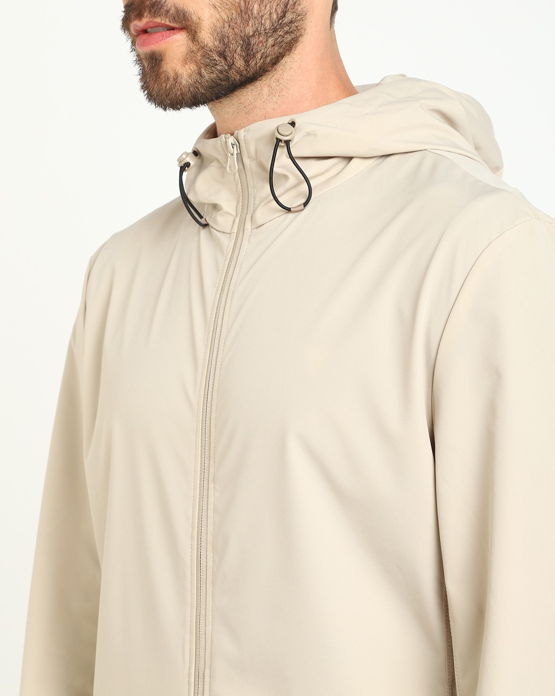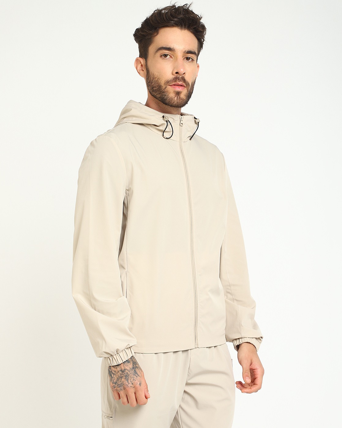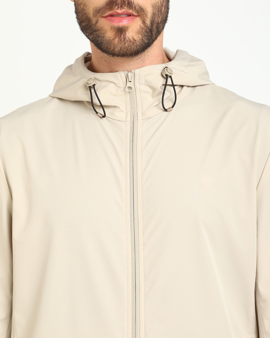 Men's Beige Polyamide Solid Regular Fit Hooded Neck Full Sleeve Jacket