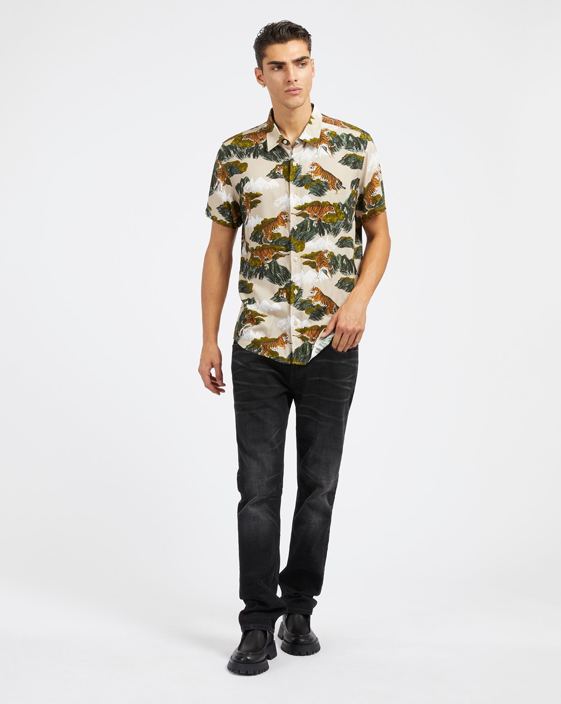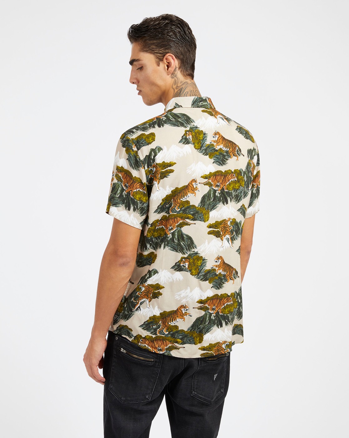 • Guess Men's Beige Viscose Printed Slim Fit Spread Collar Short Sleeve Shirts