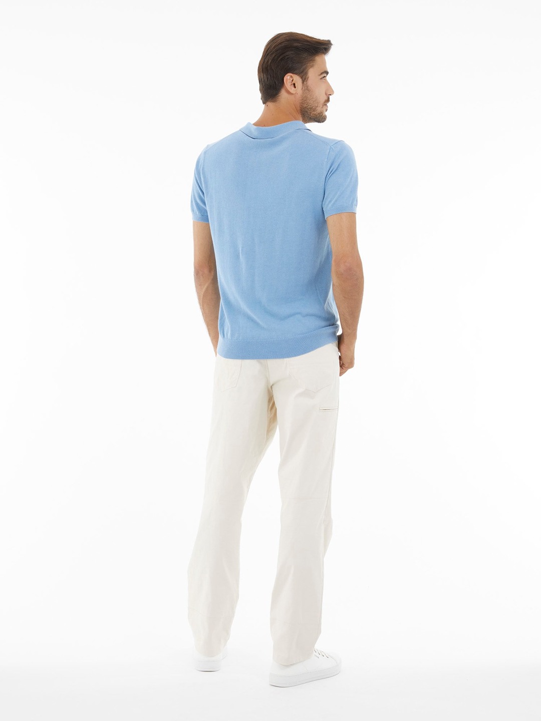 Men's Blue Cotton Blend Solid Regular Fit Spread Collar Short Sleeve Sweater