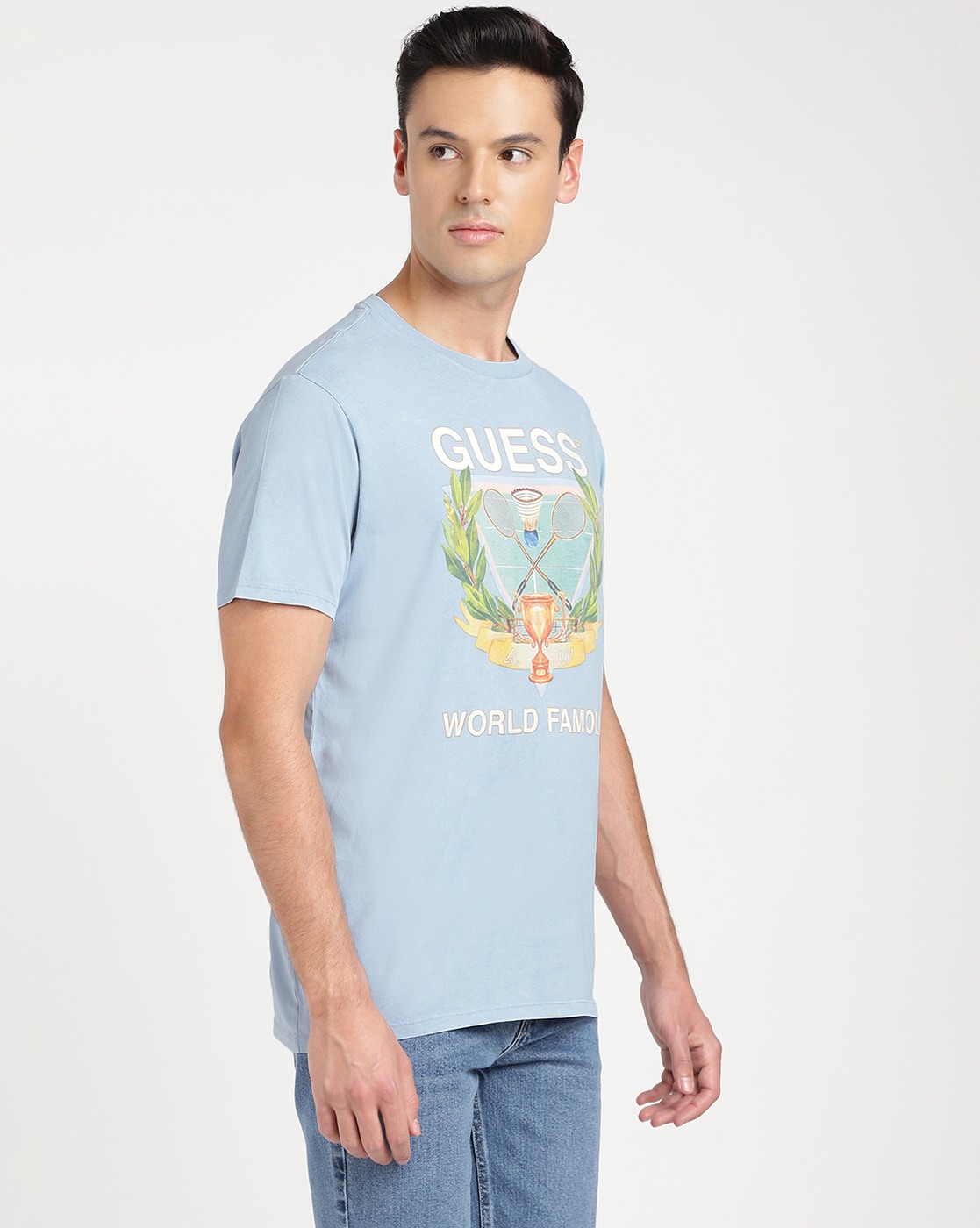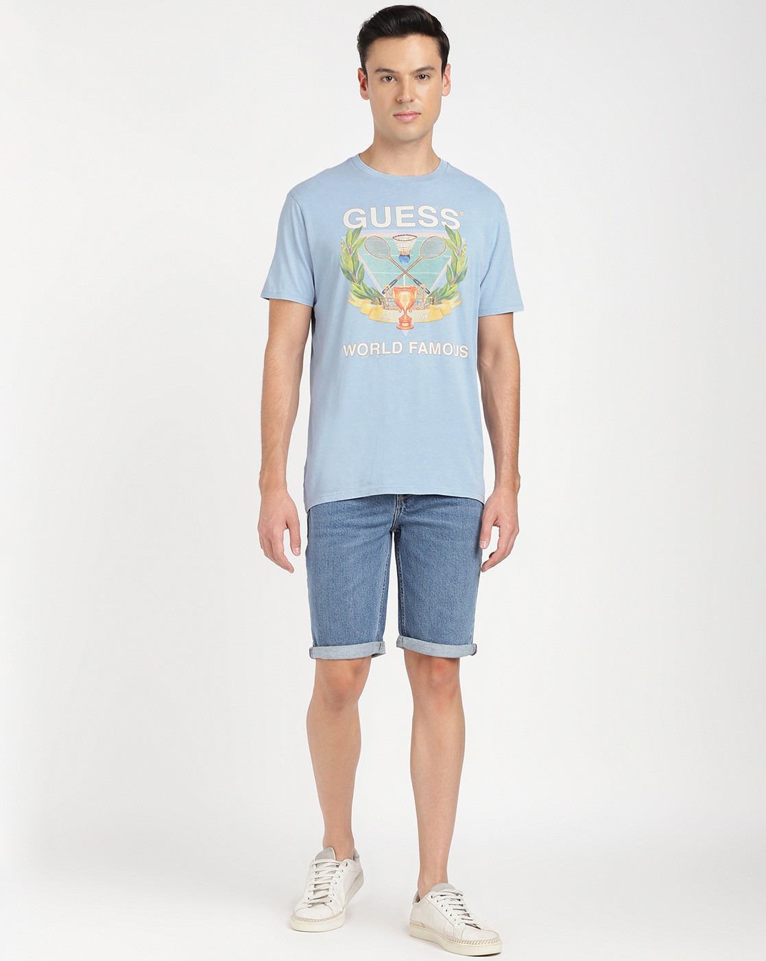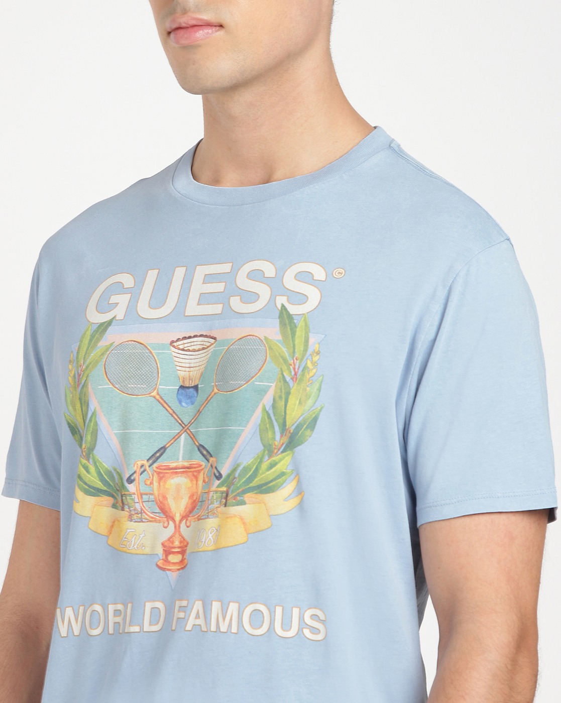 • Guess Men's Blue Cotton Printed Regular Fit Crew Neck Short Sleeve T-shirt