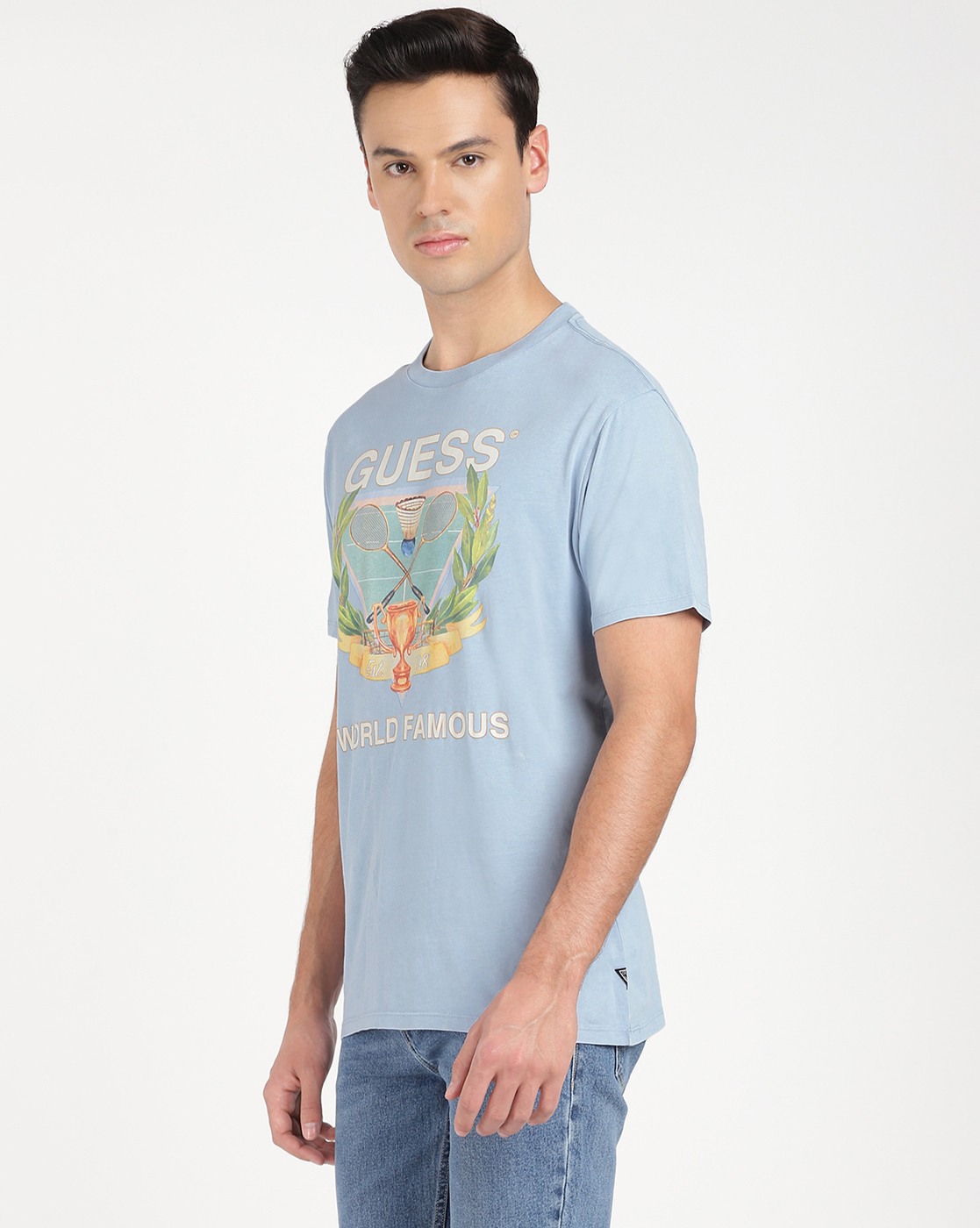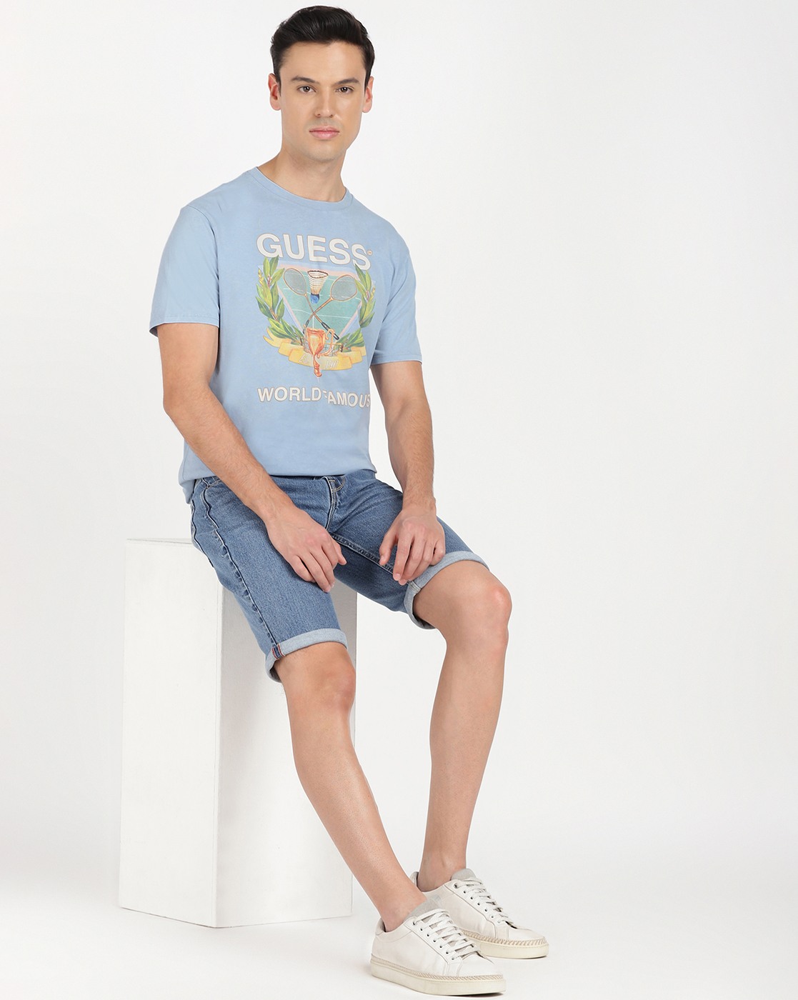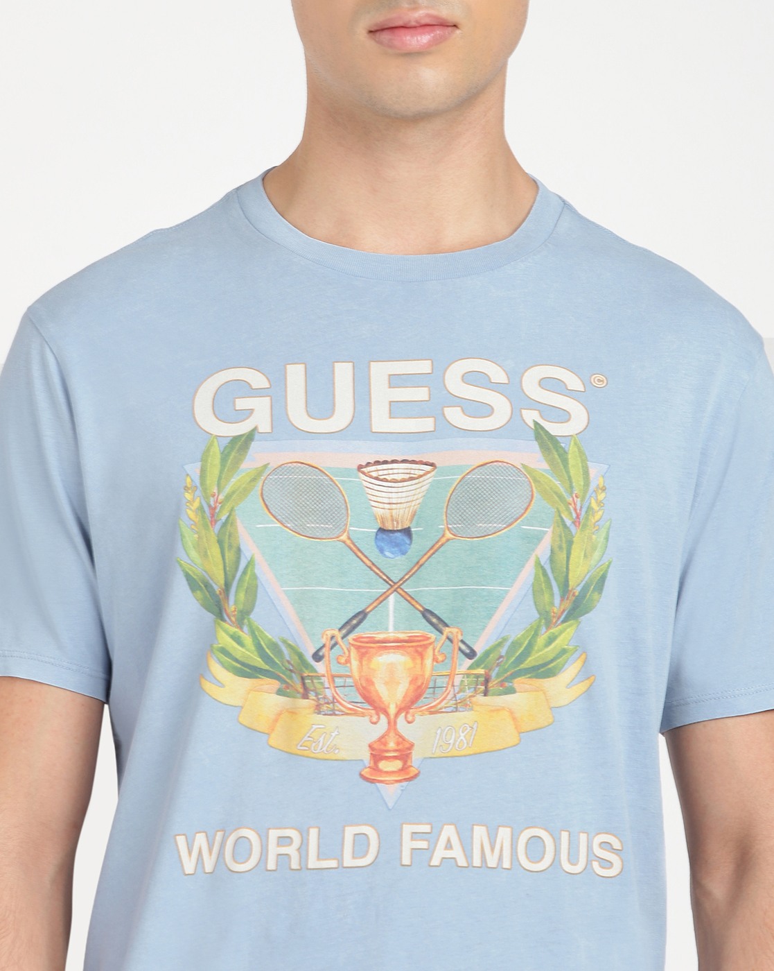 • Guess Men's Blue Cotton Printed Regular Fit Crew Neck Short Sleeve T-shirt