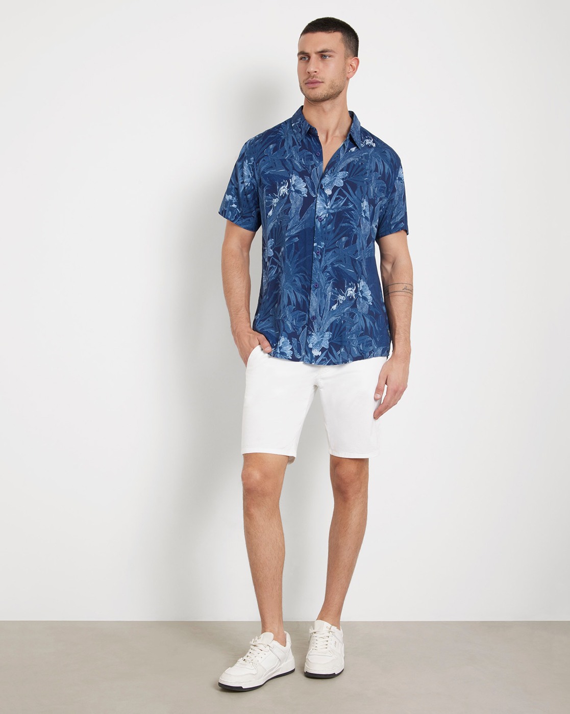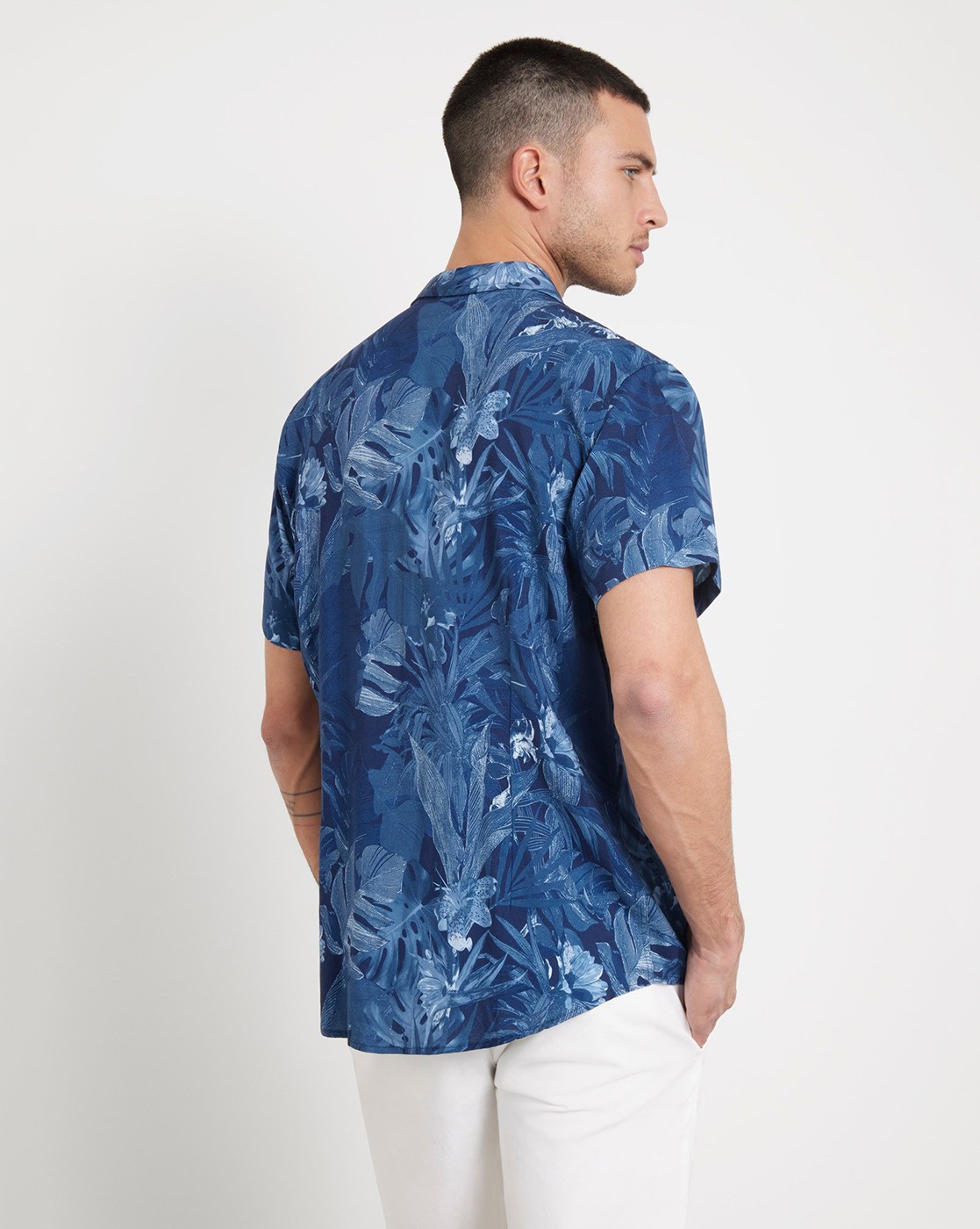 • Guess Men's Blue Viscose Printed Slim Fit Spread Collar Short Sleeve Shirts