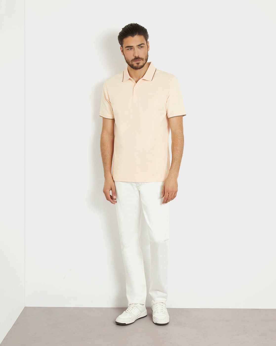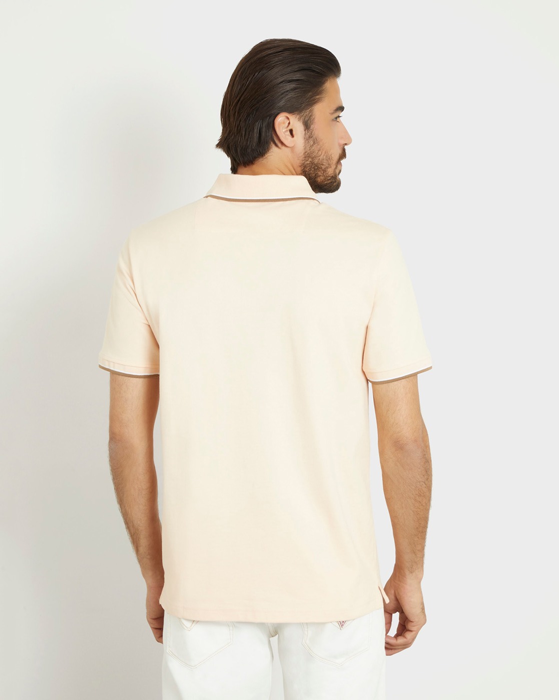 • Guess Men's Peach Cotton Blend Solid Slim Fit Spread Collar Short Sleeve Polo T-shirt