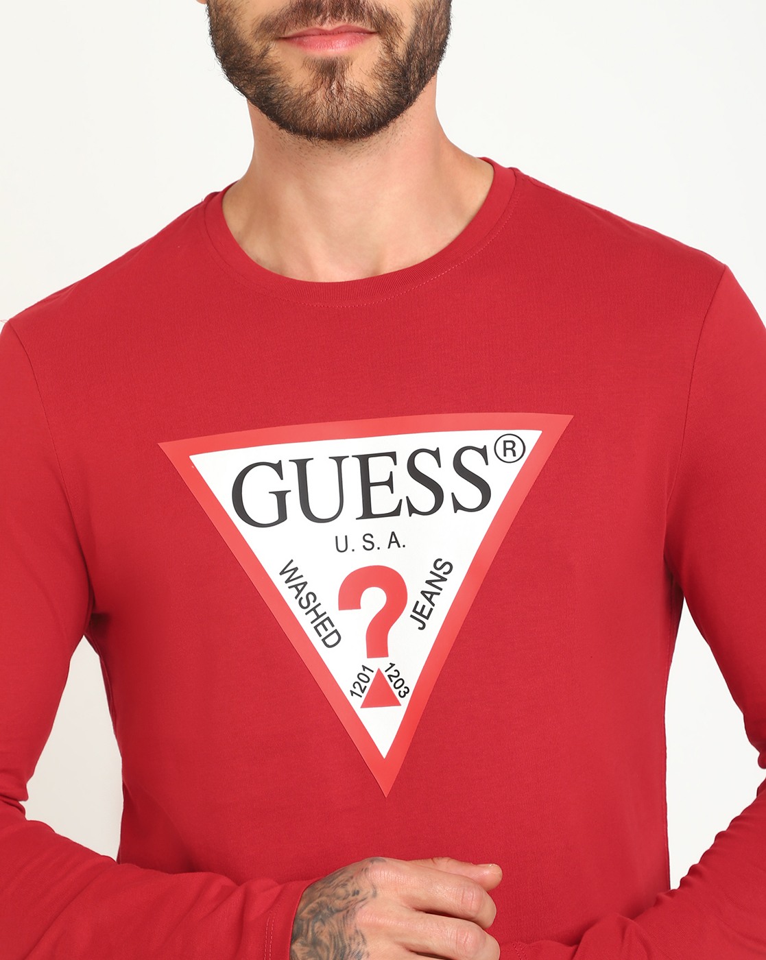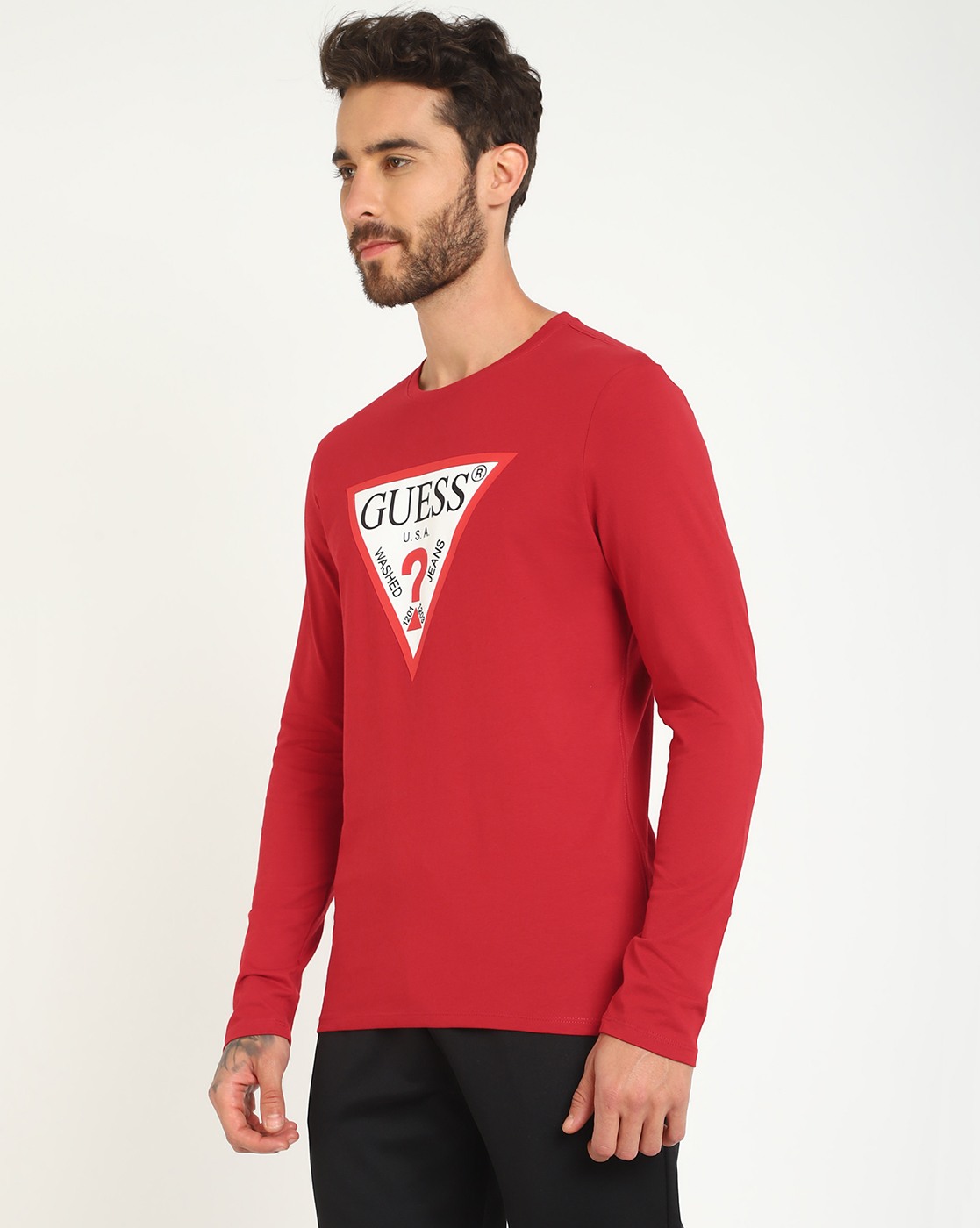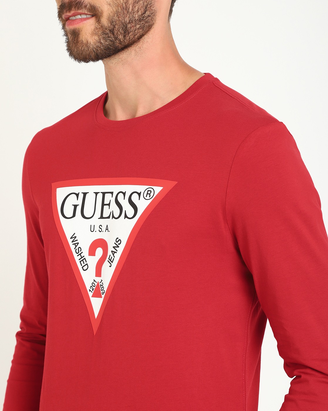 • Guess Men's Red Cotton Printed Slim Fit Round Neck Full Sleeve T-shirt