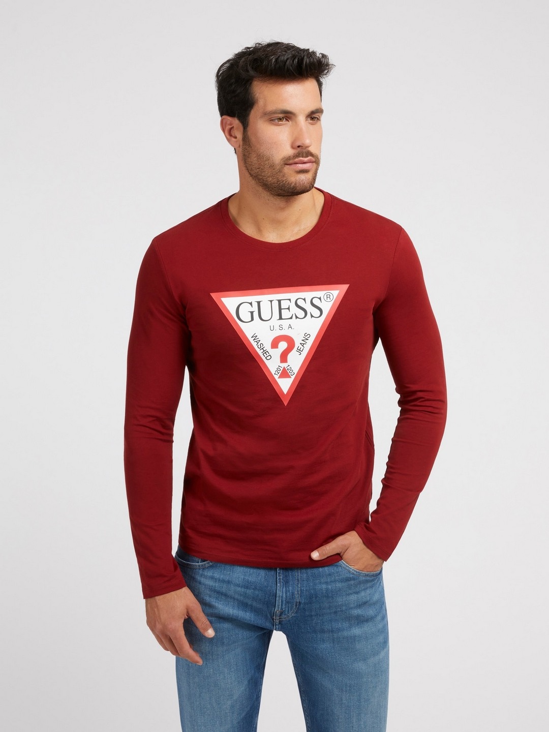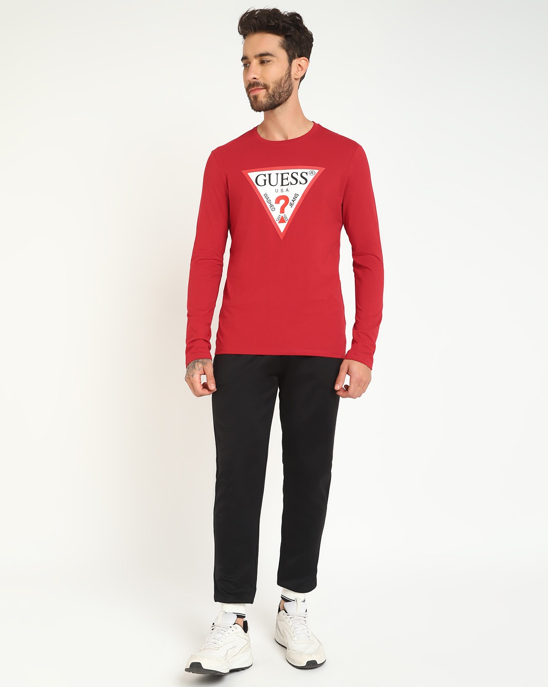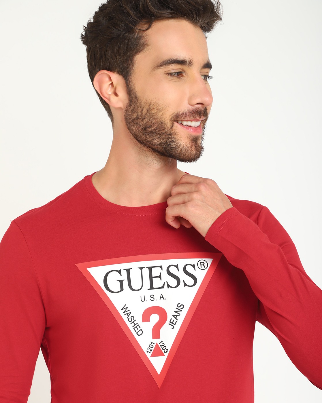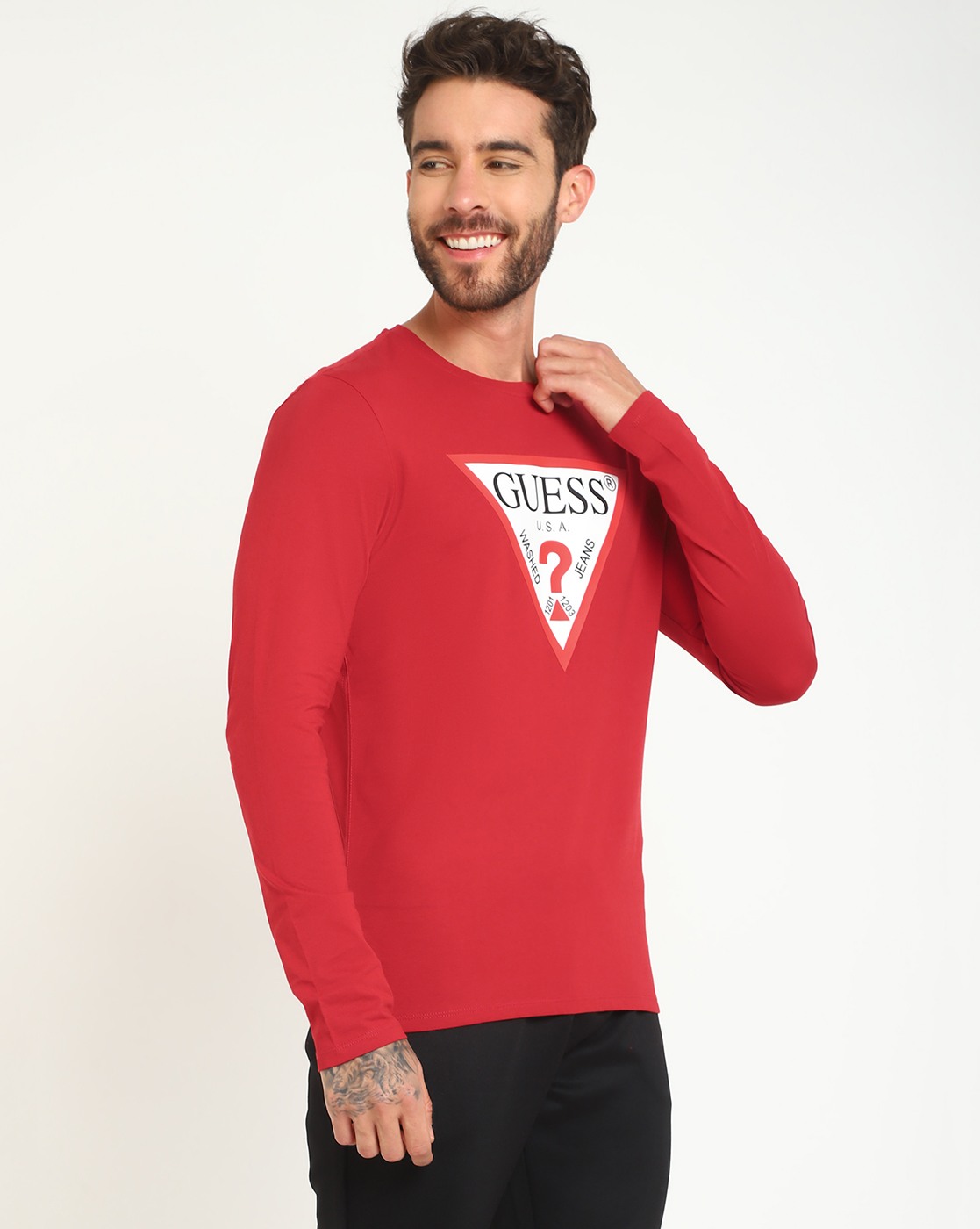 • Guess Men's Red Cotton Printed Slim Fit Round Neck Full Sleeve T-shirt