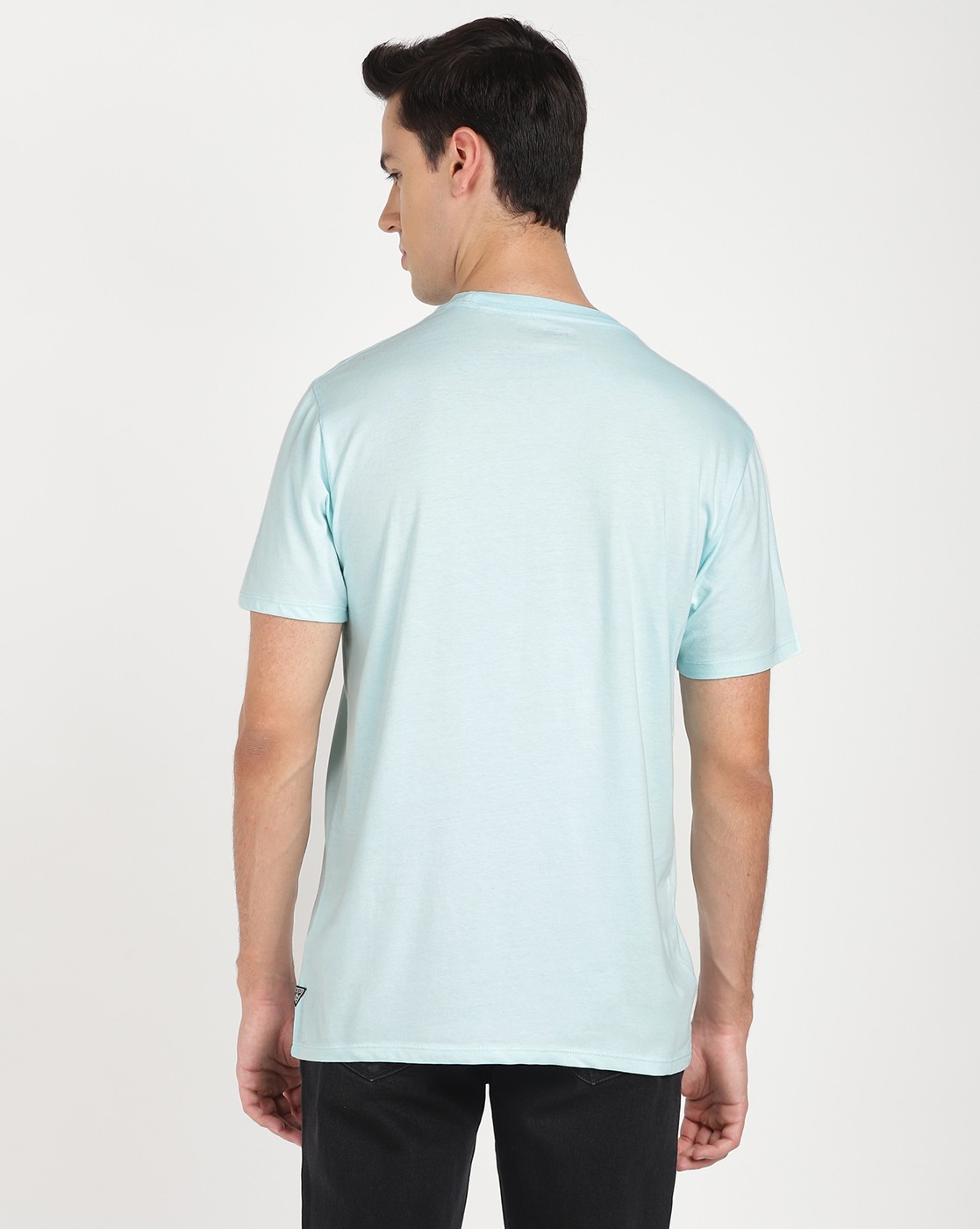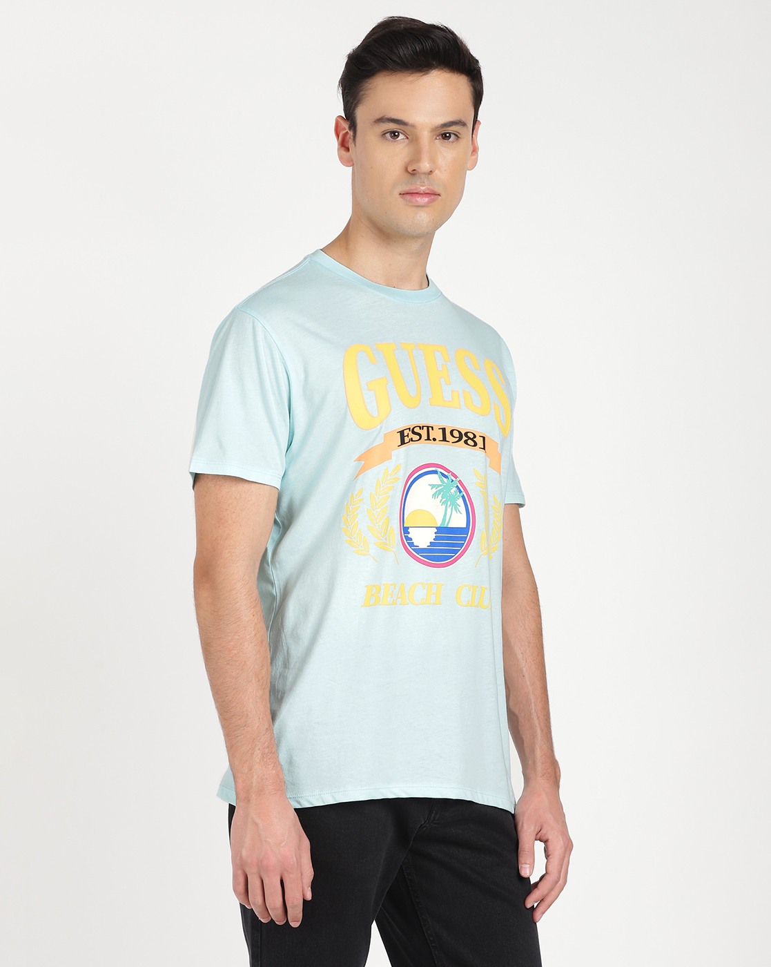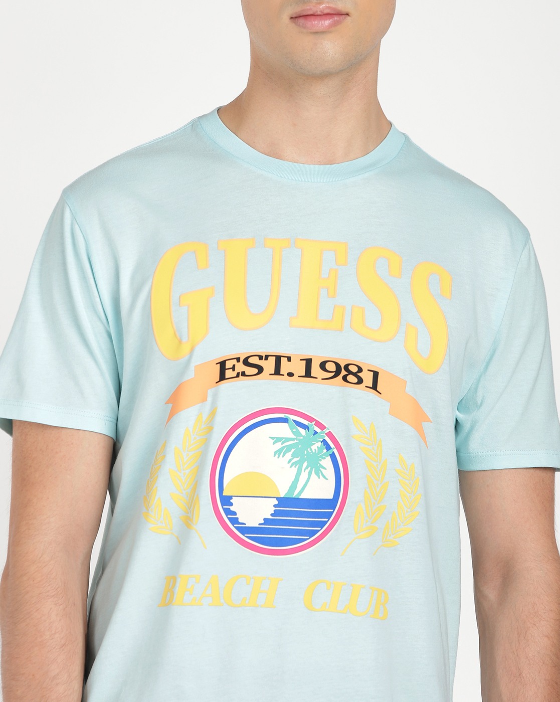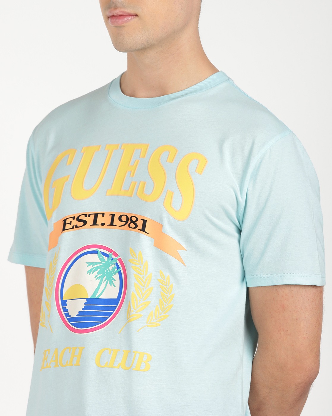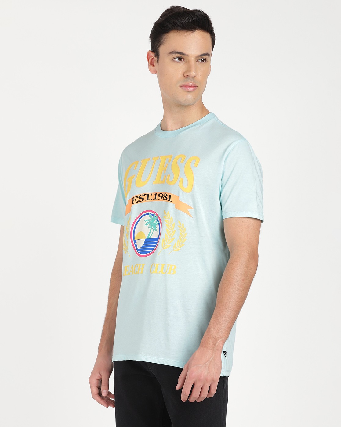 • Guess Men's Turquoise Cotton Printed Regular Fit Crew Neck Short Sleeve T-shirt