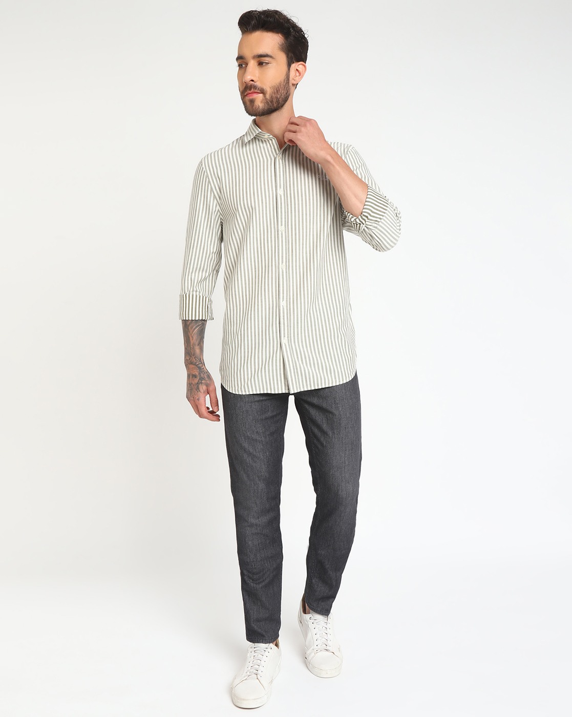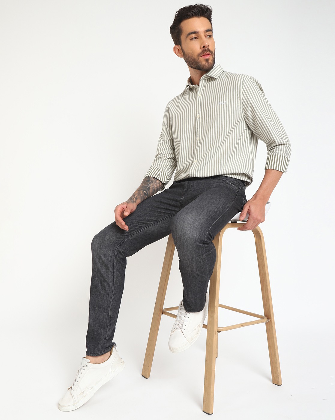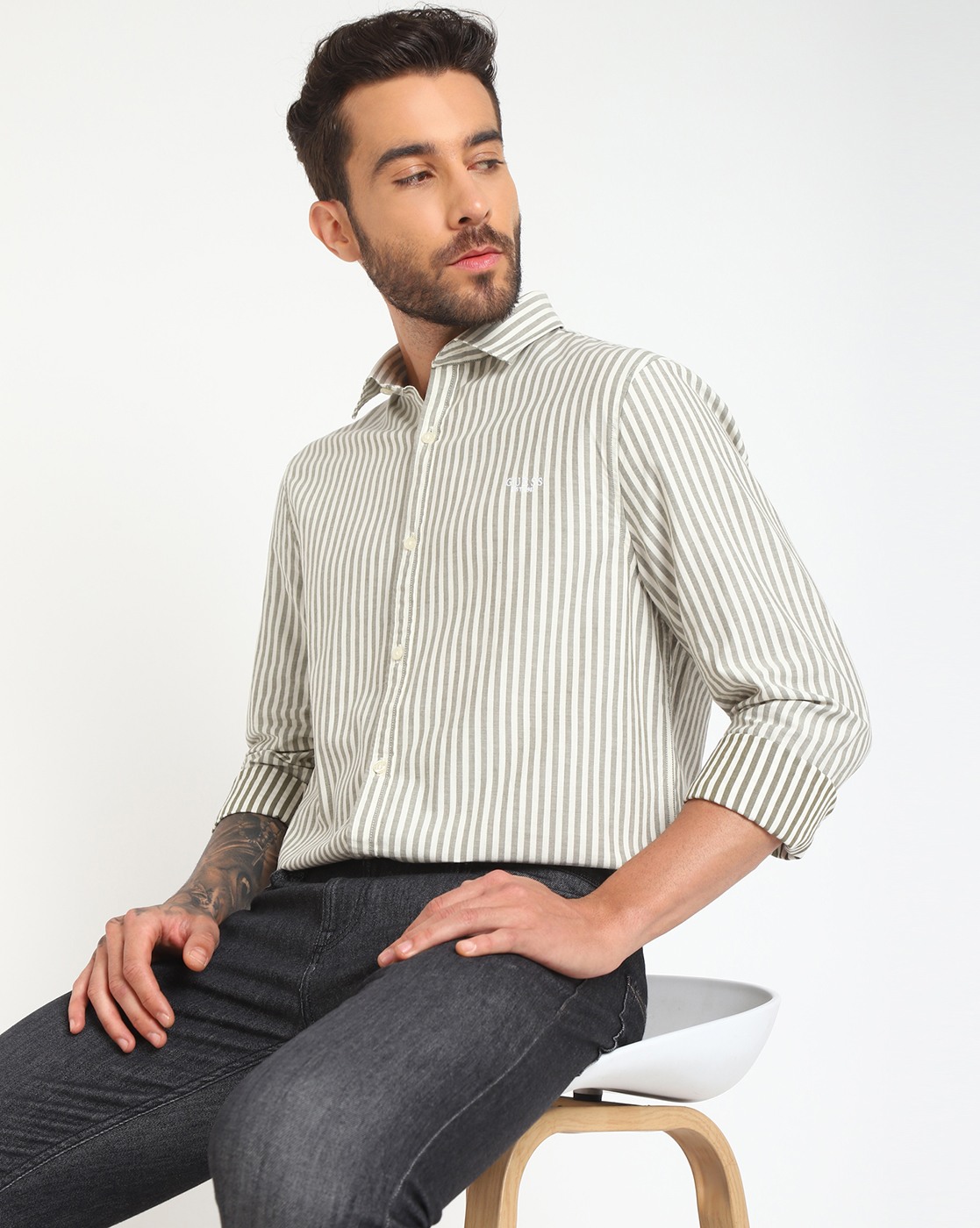 • Guess Men's White Cotton Stripes Regular Fit Full Sleeves Shirts