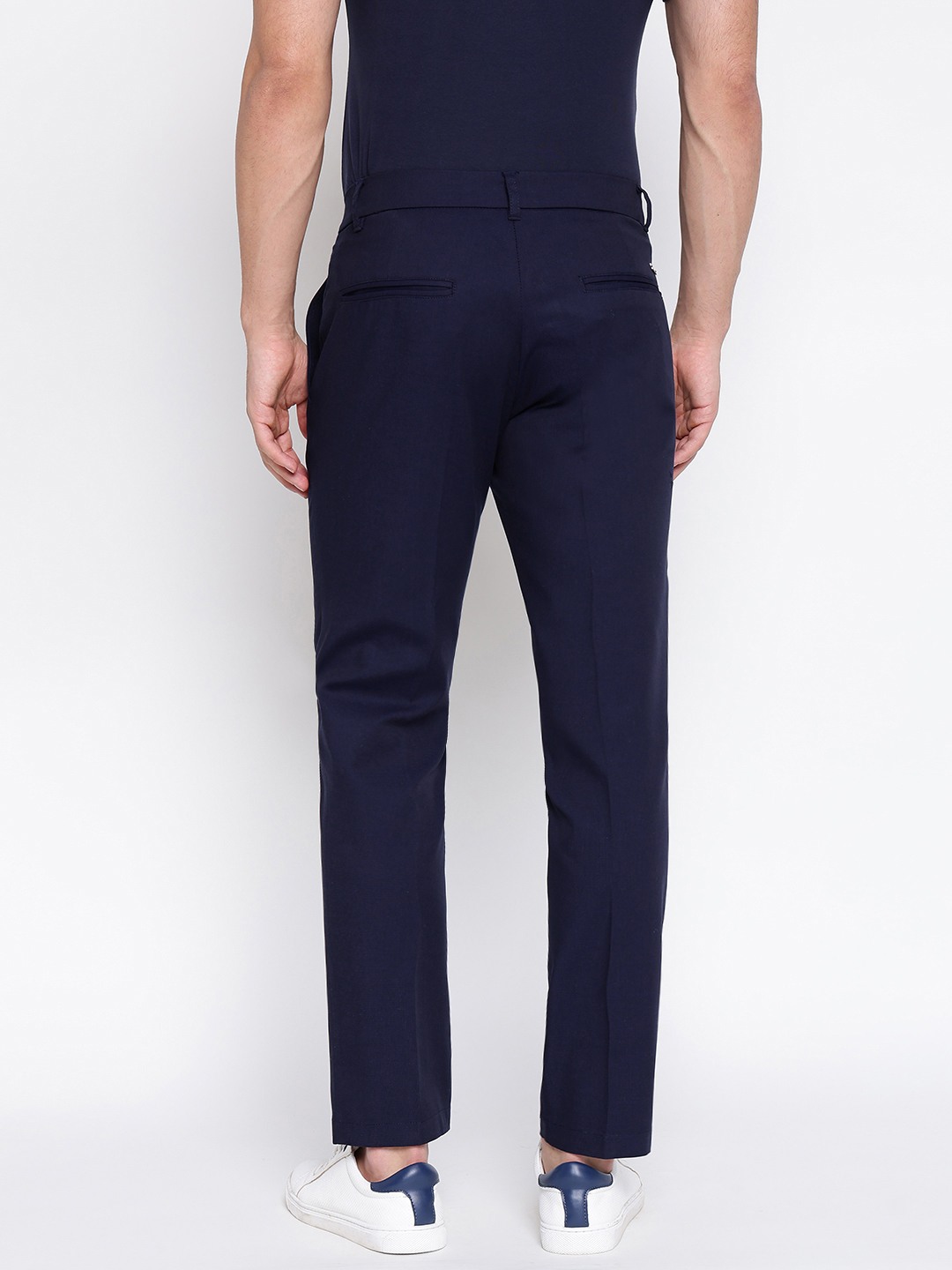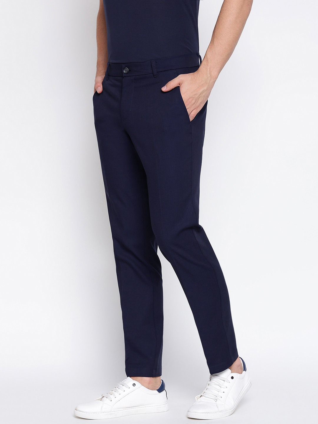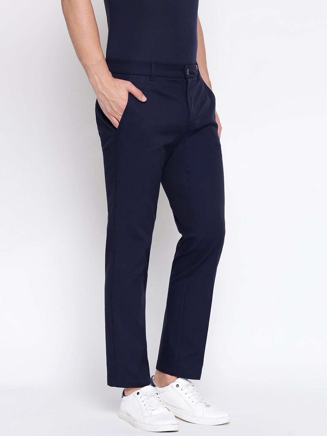 Discover the perfect blend of style and comfort with our smart blue chinos trousers for men. Crafted from premium cotton fabric, these trousers offer a regular fit that ensures ease of movement while maintaining a sleek silhouette. The solid pattern and mid-rise design make them a versatile addition to any wardrobe, suitable for both casual and formal occasions. Featuring a classic button closure, these chinos provide a secure fit and timeless appeal. Elevate your everyday look with these essential trousers.